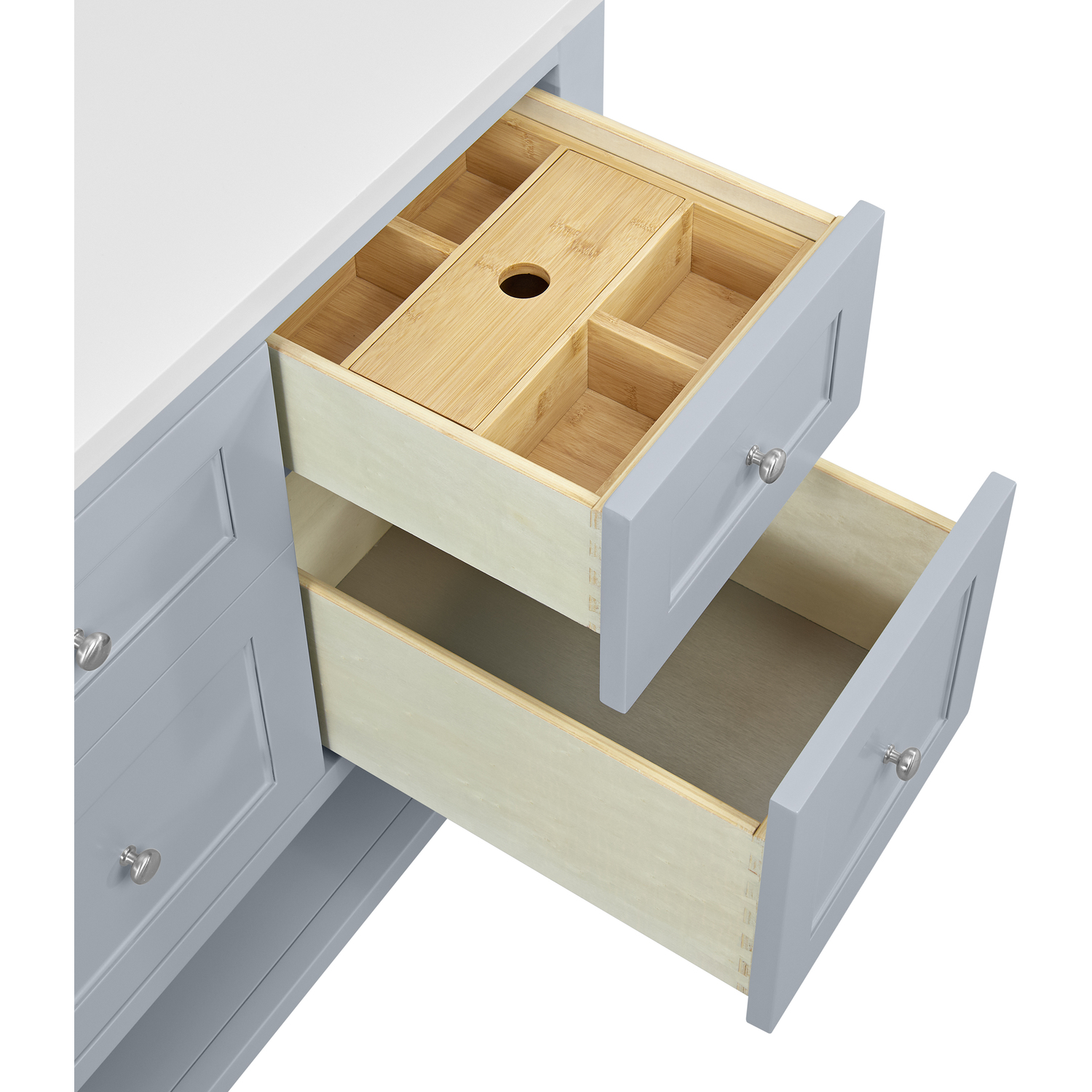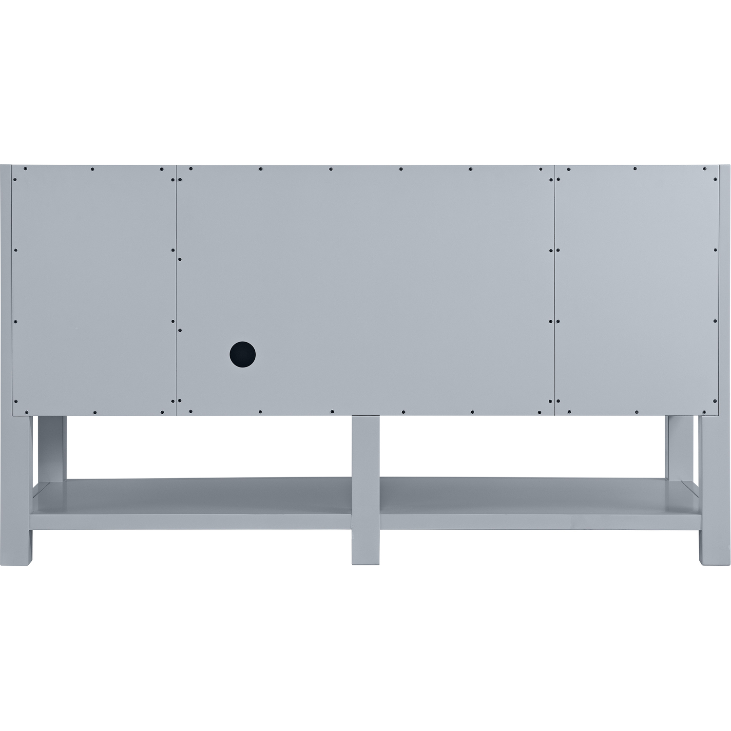 The Breckenridge 60" Single Vanity is a fresh take on traditional Mission furniture that easily transitions to Modern Farmhouse style with an air of understated sophistication. Satin Nickel knobs complement the Serenity Blue finish, while the neatly inset door and drawer fronts lend a fresh appeal to this clean-lined classic. A two-door cabinet opens to reveal an interior shelf equipped with convenient built-in USB/120V power outlet. This console-style vanity also features four full-extension drawers and an open lower shelf for additional storage. Complete the look with one of our 3 cm tops.Two-door cabinet with one adjustable interior shelf and four full-extension drawersDrawer boxes feature English Dovetail joinery with premium, soft-close undermount drawer slides; doors feature soft-close, adjustable door hingesCabinet features a multi-stage premium finish coat to offer UV and moisture resistanceSerenity Blue finish with Satin Nickel hardwareCabinet only; select one of our countertops to complete the vanityIntegrated 120V outlet with USB portsDrawers lined with our signature brushed aluminum laminate for easy cleaningFreestanding VanityFaucets sold separatelyA fresh take on traditional Mission furniture, the Breckenridge Collection easily transitions to Modern Farmhouse style with an air of understated sophistication. This console-style vanity has an integrated open shelf for additional storage, neatly inset door and drawer fronts to maintain the symmetry of the Shaker aesthetic, and coordinating knobs that complement each of the available finishes. With clean lines and a chic design, this vanity is destined to become a classic.1 year warranty against manufacturer's defects. We will repair or replace any defective product, if the product is defective in material or workmanship at our discretion. No warranty is expressed or implied regarding damages resulting from consumer misuse.