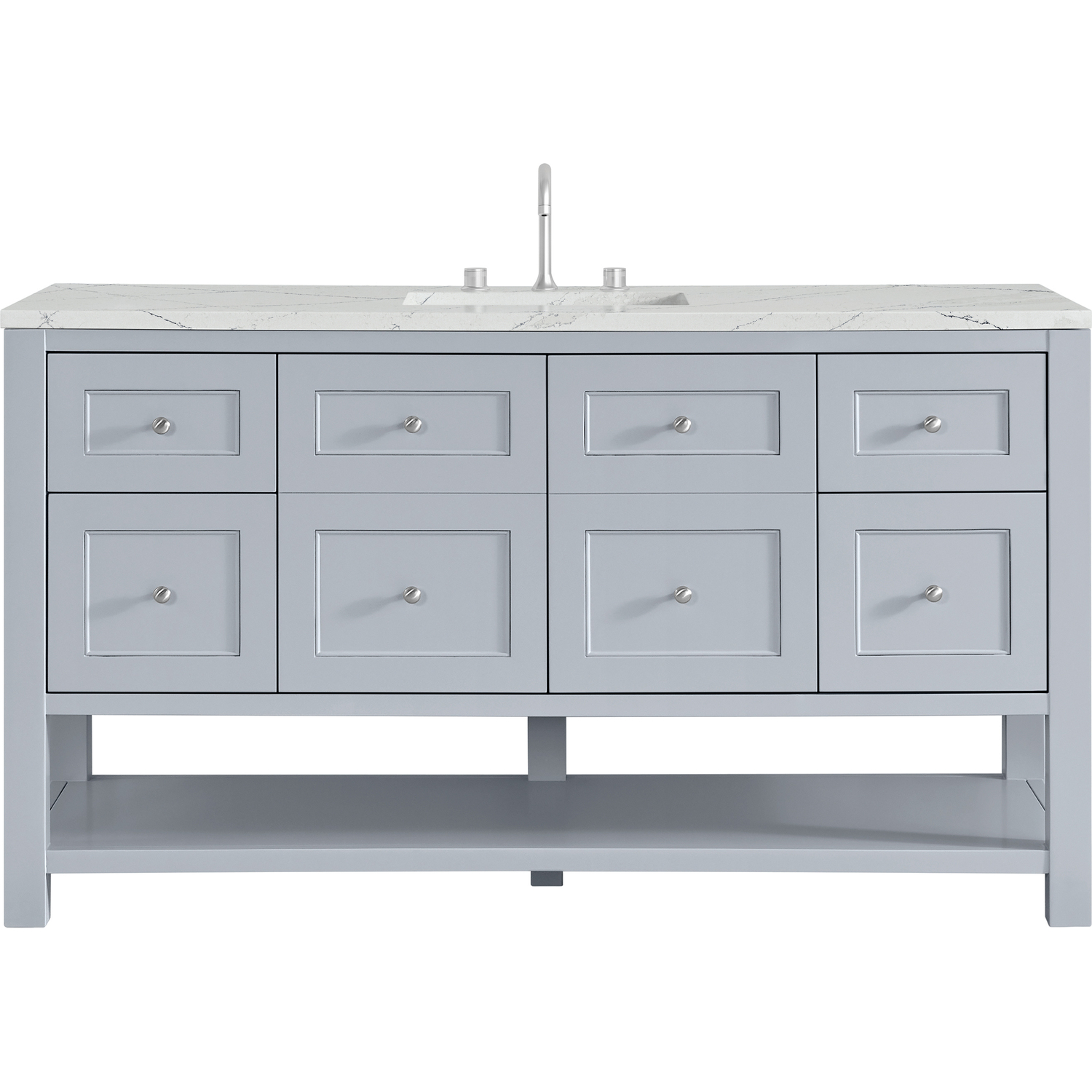 The Breckenridge 60" Single Vanity by James Martin Vanities is a fresh take on traditional Mission furniture that easily transitions to Modern Farmhouse style with an air of understated sophistication. Satin Nickel knobs complement the Serenity Blue finish, while the neatly inset door and drawer fronts lend a fresh appeal to this clean-lined classic. A two-door cabinet opens to reveal an interior shelf equipped with convenient built-in USB/120V power outlet. This console-style vanity also features four full-extension drawers and an open lower shelf for additional storage. A stunning Ethereal Noctis Silestone® top with undermount sink completes the look. This unit is enabled with FreePower wireless charging; featuring a single-device charger seamlessly embedded into the countertop, indicated by a light-up halo to the left of the sink. Designed for modern living, FreePower offers convenient, integrated, wireless charging when and where you need it.Two-door cabinet with one adjustable interior shelf and four full-extension drawersDrawer boxes feature English Dovetail joinery with premium, soft-close undermount drawer slides; doors feature soft-close, adjustable door hingesCabinet features a multi-stage premium finish coat to offer UV and moisture resistanceSerenity Blue finish with Satin Nickel hardwareCountertop is pre-drilled for an 8" widespread faucet; our 3cm eased edge countertops come with white porcelain rectangular sink(s) that ship separately and include mounting brackets for easy installationIntegrated 120V outlet with USB portsDrawers lined with our signature brushed aluminum laminate for easy cleaningFreestanding VanityFaucet sold separatelyMatching stone backsplash available as add-on purchaseFreePower Wireless Charging; single-device unit left of sinkA fresh take on traditional Mission furniture, the Breckenridge Collection by James Martin Vanities easily transitions to Modern Farmhouse style with an air of understated sophistication. This console-style vanity has an integrated open shelf for additional storage, neatly inset door and drawer fronts to maintain the symmetry of the Shaker aesthetic, and coordinating knobs that complement each of the available finishes. With clean lines and a chic design, this vanity is destined to become a classic.1 year warranty against manufacturer's defects. We will repair or replace any defective product, if the product is defective in material or workmanship at our discretion. No warranty is expressed or implied regarding damages resulting from consumer misuse.