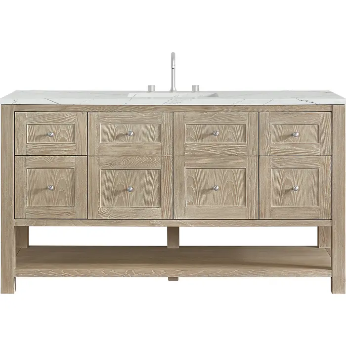 The Breckenridge 60" Single Vanity by James Martin Vanities is a fresh take on traditional Mission furniture that easily transitions to Modern Farmhouse style with an air of understated sophistication. Satin Nickel knobs complement the Whitewashed Oak finish, while the neatly inset door and drawer fronts lend a fresh appeal to this clean-lined classic. A two-door cabinet opens to reveal an interior shelf equipped with convenient built-in USB/120V power outlet. This console-style vanity also features four full-extension drawers and an open lower shelf for additional storage. A stunning Ethereal Noctis Silestone® top with undermount sink completes the look. This unit is enabled with FreePower wireless charging; featuring a single-device charger seamlessly embedded into the countertop, indicated by a light-up halo to the left of the sink. Designed for modern living, FreePower offers convenient, integrated, wireless charging when and where you need it.Two-door cabinet with one adjustable interior shelf and four full-extension drawersDrawer boxes feature English Dovetail joinery with premium, soft-close undermount drawer slides; doors feature soft-close, adjustable door hingesCabinet features a multi-stage premium finish coat to offer UV and moisture resistanceWhitewashed Oak finish with Satin Nickel hardwareCountertop is pre-drilled for an 8" widespread faucet; our 3cm eased edge countertops come with white porcelain rectangular sink(s) that ship separately and include mounting brackets for easy installationIntegrated 120V outlet with USB portsDrawers lined with our signature brushed aluminum laminate for easy cleaningFreestanding VanityFaucet sold separatelyMatching stone backsplash available as add-on purchaseFreePower Wireless Charging; single-device unit left of sinkA fresh take on traditional Mission furniture, the Breckenridge Collection by James Martin Vanities easily transitions to Modern Farmhouse style with an air of understated sophistication. This console-style vanity has an integrated open shelf for additional storage, neatly inset door and drawer fronts to maintain the symmetry of the Shaker aesthetic, and coordinating knobs that complement each of the available finishes. With clean lines and a chic design, this vanity is destined to become a classic.1 year warranty against manufacturer's defects. We will repair or replace any defective product, if the product is defective in material or workmanship at our discretion. No warranty is expressed or implied regarding damages resulting from consumer misuse.