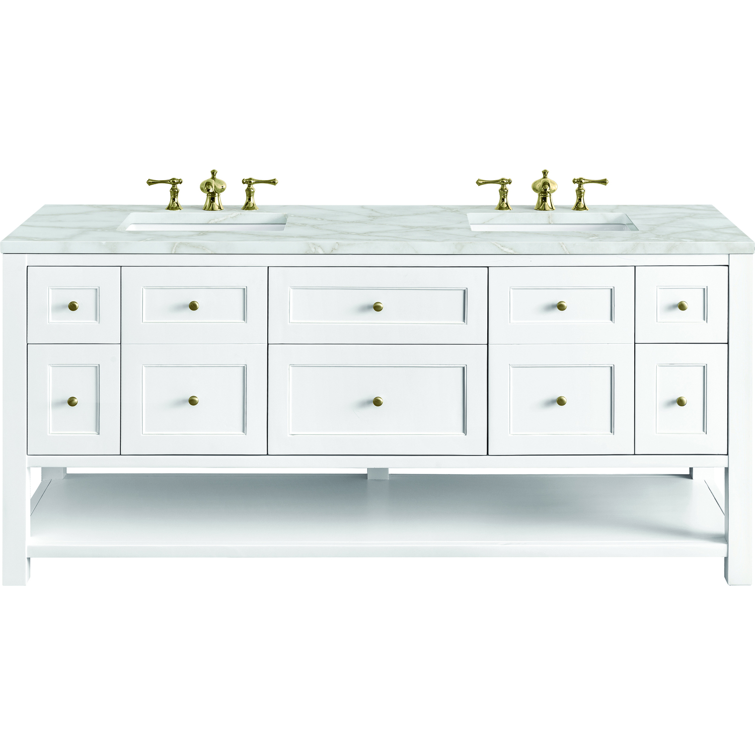The Breckenridge 72" Double Vanity by James Martin Vanities is a fresh take on traditional Mission furniture that easily transitions to Modern Farmhouse style with an air of understated sophistication. Champagne Brass knobs complement the Bright White finish, while the neatly inset door and drawer fronts lend a fresh appeal to this clean-lined classic. Two single-door cabinets open to reveal interior shelves equipped with a convenient built-in USB/120V power outlet. This console-style vanity also features six full-extension drawers and an open lower shelf for additional storage. A beautiful Victorian Silver Silestone® top with undermount sinks completes the look. This unit is enabled with FreePower wireless charging; featuring a two-device charger seamlessly embedded into the countertop, indicated by a light-up halo in between the sinks. Designed for modern living, FreePower offers convenient, integrated, wireless charging when and where you need it.FreePower Wireless Charging; two-device unit in between sinksTwo single-door cabinets with adjustable interior shelves and six standard full-extension drawersDrawer boxes feature English Dovetail joinery with premium, soft-close undermount drawer slides; doors feature soft-close, adjustable door hingesCabinet features a multi-stage premium finish coat to offer UV and moisture resistanceBright White finish with Champagne Brass hardwareCountertop is pre-drilled for 8" widespread faucet(s); our 3cm eased edge countertops come with white porcelain rectangular sink(s) that ship separately and include mounting brackets for easy installationIntegrated 120V outlet with USB portsDrawers lined with our signature brushed aluminum laminate for easy cleaningRemovable bamboo drawer organizer includedMatching stone backsplash available as add-on purchaseFreestanding VanityFaucet sold separatelyA fresh take on traditional Mission furniture, the Breckenridge Collection by James Martin Vanities easily transitions to Modern Farmhouse style with an air of understated sophistication. This console-style vanity has an integrated open shelf for additional storage, neatly inset door and drawer fronts to maintain the symmetry of the Shaker aesthetic, and coordinating knobs that complement each of the available finishes. With clean lines and a chic design, this vanity is destined to become a classic.1 year warranty against manufacturer's defects. We will repair or replace any defective product, if the product is defective in material or workmanship at our discretion. No warranty is expressed or implied regarding damages resulting from consumer misuse.