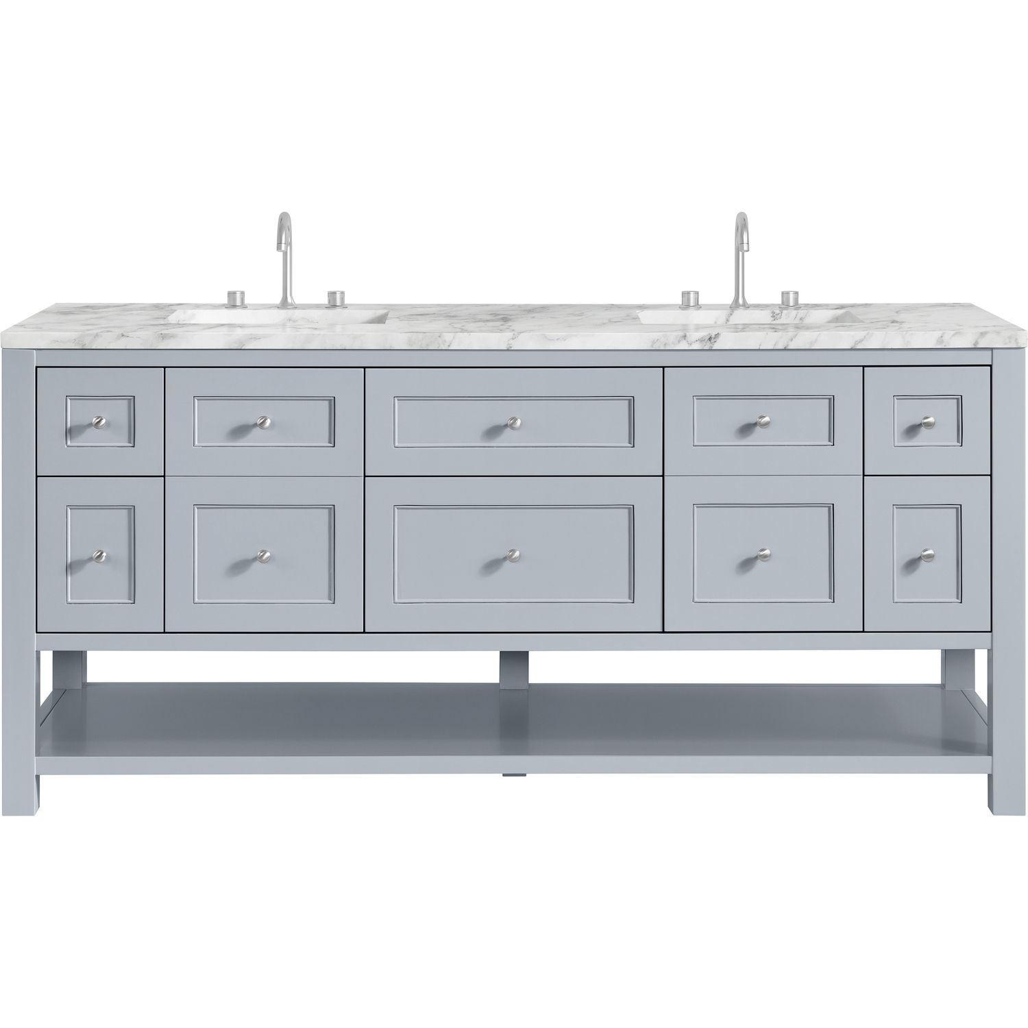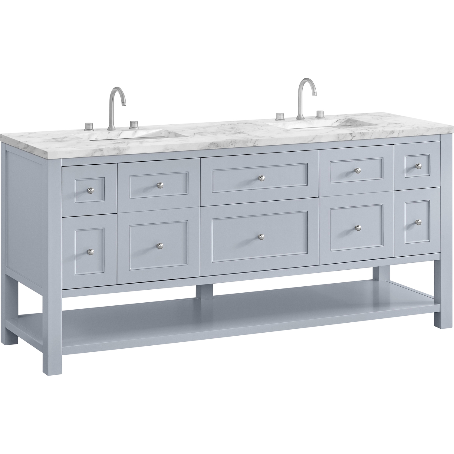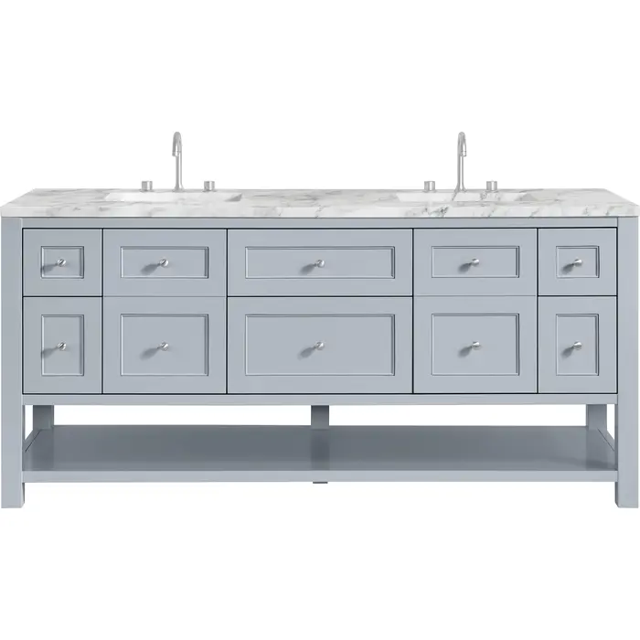 The Breckenridge 72" Double Vanity is a fresh take on traditional Mission furniture that easily transitions to Modern Farmhouse style with an air of understated sophistication. Satin Nickel knobs complement the Serenity Blue finish, while the neatly inset door and drawer fronts lend a fresh appeal to this clean-lined classic. Two single-door cabinets open to reveal interior shelves equipped with a convenient built-in USB/120V power outlet. This console-style vanity also features six full-extension drawers and an open lower shelf for additional storage. A classic Carrara Marble top with undermount sinks completes the look.Two single-door cabinets with adjustable interior shelves and six standard full-extension drawersDrawer boxes feature English Dovetail joinery with premium, soft-close undermount drawer slides; doors feature soft-close, adjustable door hingesCabinet features a multi-stage premium finish coat to offer UV and moisture resistanceSerenity Blue finish with Satin Nickel hardwareCountertop is pre-drilled for 8" widespread faucets; our 3cm eased edge countertops come with white porcelain rectangular sink(s) that ship separately and include mounting brackets for easy installationIntegrated 120V outlet with USB portsDrawers lined with our signature brushed aluminum laminate for easy cleaningRemovable bamboo drawer organizer includedFreestanding VanityFaucets sold separatelyA fresh take on traditional Mission furniture, the Breckenridge Collection easily transitions to Modern Farmhouse style with an air of understated sophistication. This console-style vanity has an integrated open shelf for additional storage, neatly inset door and drawer fronts to maintain the symmetry of the Shaker aesthetic, and coordinating knobs that complement each of the available finishes. With clean lines and a chic design, this vanity is destined to become a classic.1 year warranty against manufacturer's defects. We will repair or replace any defective product, if the product is defective in material or workmanship at our discretion. No warranty is expressed or implied regarding damages resulting from consumer misuse.