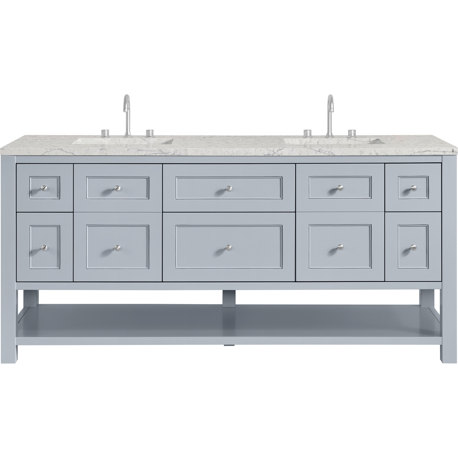 The Breckenridge 72" Double Vanity by James Martin Vanities is a fresh take on traditional Mission furniture that easily transitions to Modern Farmhouse style with an air of understated sophistication. Satin Nickel knobs complement the Serenity Blue finish, while the neatly inset door and drawer fronts lend a fresh appeal to this clean-lined classic. Two single-door cabinets open to reveal interior shelves equipped with a convenient built-in USB/120V power outlet. This console-style vanity also features six full-extension drawers and an open lower shelf for additional storage. A beautiful Eternal Jasmine Pearl Silestone® top with undermount sinks completes the look. This unit is enabled with FreePower wireless charging; featuring a two-device charger seamlessly embedded into the countertop, indicated by a light-up halo in between the sinks. Designed for modern living, FreePower offers convenient, integrated, wireless charging when and where you need it. undermount sinks completes the look.FreePower Wireless Charging; two-device unit in between sinksTwo single-door cabinets with adjustable interior shelves and six standard full-extension drawersDrawer boxes feature English Dovetail joinery with premium, soft-close undermount drawer slides; doors feature soft-close, adjustable door hingesCabinet features a multi-stage premium finish coat to offer UV and moisture resistanceSerenity Blue finish with Satin Nickel hardwareCountertop is pre-drilled for 8" widespread faucet(s); our 3cm eased edge countertops come with white porcelain rectangular sink(s) that ship separately and include mounting brackets for easy installationIntegrated 120V outlet with USB portsDrawers lined with our signature brushed aluminum laminate for easy cleaningRemovable bamboo drawer organizer includedMatching stone backsplash available as add-on purchaseFreestanding VanityFaucet sold separatelyA fresh take on traditional Mission furniture, the Breckenridge Collection by James Martin Vanities easily transitions to Modern Farmhouse style with an air of understated sophistication. This console-style vanity has an integrated open shelf for additional storage, neatly inset door and drawer fronts to maintain the symmetry of the Shaker aesthetic, and coordinating knobs that complement each of the available finishes. With clean lines and a chic design, this vanity is destined to become a classic.1 year warranty against manufacturer's defects. We will repair or replace any defective product, if the product is defective in material or workmanship at our discretion. No warranty is expressed or implied regarding damages resulting from consumer misuse.