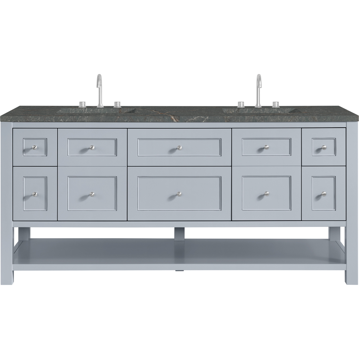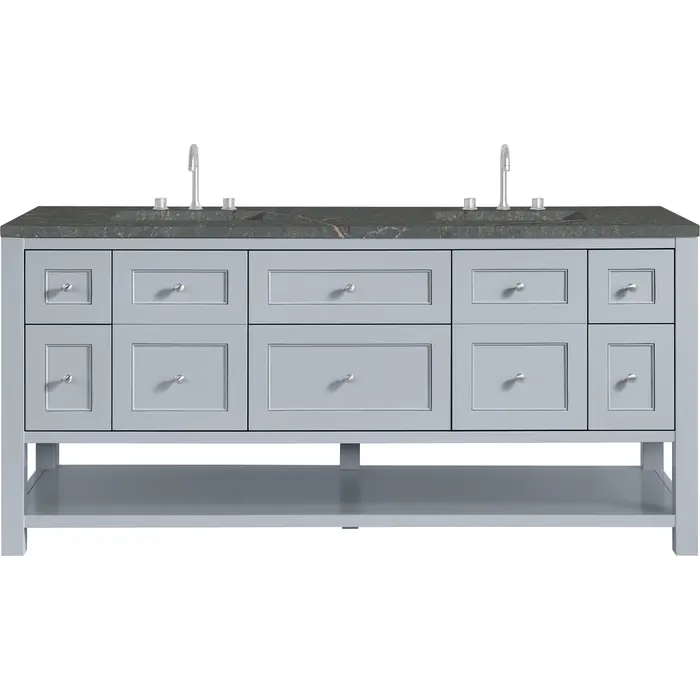 The Breckenridge 72" Double Vanity by James Martin Vanities is a fresh take on traditional Mission furniture that easily transitions to Modern Farmhouse style with an air of understated sophistication. Satin Nickel knobs complement the Serenity Blue finish, while the neatly inset door and drawer fronts lend a fresh appeal to this clean-lined classic. Two single-door cabinets open to reveal interior shelves equipped with a convenient built-in USB/120V power outlet. This console-style vanity also features six full-extension drawers and an open lower shelf for additional storage. A gorgeous Parisien Bleu Silestone® top with undermount sinks completes the look. This unit is enabled with FreePower wireless charging; featuring a two-device charger seamlessly embedded into the countertop, indicated by a light-up halo in between the sinks. Designed for modern living, FreePower offers convenient, integrated, wireless charging when and where you need it. undermount sinks completes the look.FreePower Wireless Charging; two-device unit in between sinksTwo single-door cabinets with adjustable interior shelves and six standard full-extension drawersDrawer boxes feature English Dovetail joinery with premium, soft-close undermount drawer slides; doors feature soft-close, adjustable door hingesCabinet features a multi-stage premium finish coat to offer UV and moisture resistanceSerenity Blue finish with Satin Nickel hardwareCountertop is pre-drilled for 8" widespread faucet(s); our 3cm eased edge countertops come with white porcelain rectangular sink(s) that ship separately and include mounting brackets for easy installationIntegrated 120V outlet with USB portsDrawers lined with our signature brushed aluminum laminate for easy cleaningRemovable bamboo drawer organizer includedMatching stone backsplash available as add-on purchaseFreestanding VanityFaucet sold separatelyA fresh take on traditional Mission furniture, the Breckenridge Collection by James Martin Vanities easily transitions to Modern Farmhouse style with an air of understated sophistication. This console-style vanity has an integrated open shelf for additional storage, neatly inset door and drawer fronts to maintain the symmetry of the Shaker aesthetic, and coordinating knobs that complement each of the available finishes. With clean lines and a chic design, this vanity is destined to become a classic.1 year warranty against manufacturer's defects. We will repair or replace any defective product, if the product is defective in material or workmanship at our discretion. No warranty is expressed or implied regarding damages resulting from consumer misuse.