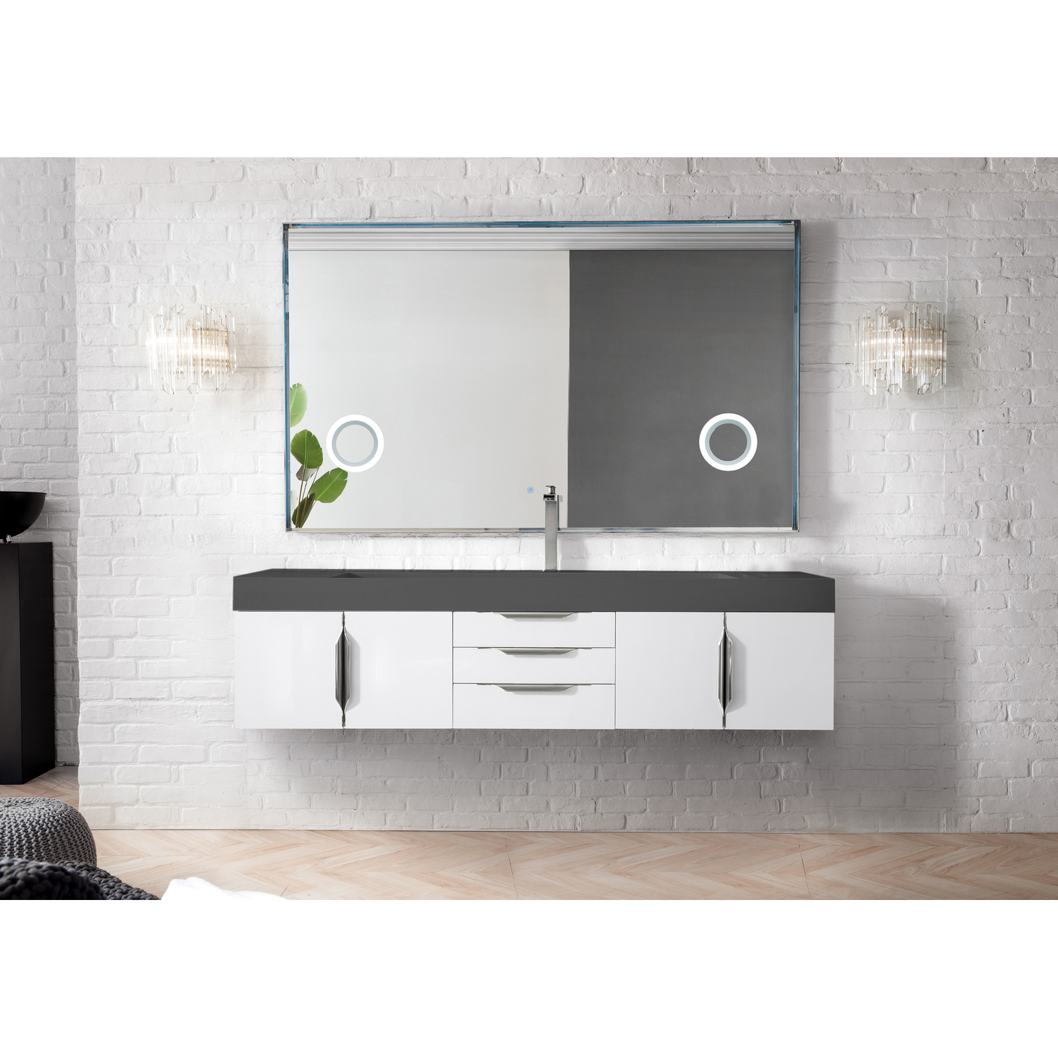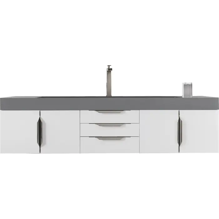 The Mercer Island 72" Glossy White Single Vanity offers maximum storage with four soft-closing doors, three soft-closing drawers, and lower shelf space. This cabinet includes premium features such as one solid bamboo drawer organizer and one 120 Volt UL Rated electrical component with two electrical and two USB outlets. Cabinet includes Brushed Nickel door and drawer pulls. Dusk Grey Composite Stone countertop with integrated wide, angled trough-style sink. This wall-mounted vanity includes heavy duty mounting brackets to create a modern look.Four door Glossy White single vanity with three drawers and interior shelf spaceHardware Finish: Brushed NickelSolid kiln-dried Grade A hardwoodCabinet is finished inside and out with a premium undercoat finish for superior moisture and UV resistanceSoft-close undermount drawer glides and soft-close door hingesDrawer bottoms are lined with our signature brushed aluminum laminateOne 120 Volt UL rated electrical component with two electrical and two USB (2.0) outletsOne bamboo drawer organizerDusk Grey Glossy Composite Stone integrated top and sink includedFaucet sold separatelyCountertop is pre-drilled for one single hole faucetThis cabinet can be wall-mounted; mounting hardware includedThe Mercer Island vanity collection by James Martin Vanities places an emphasis on clean lines and simple sculpted hardware creating a contemporary feel. Crafted out of solid wood with engineered wood veneers compromised out of reclaimed and cast-off wood, as well as new wood derived from a rapidly growing, renewable species gives this collection an inherent green story. Customers are falling in love with the consistency of the pattern, wood grain and the beautiful stainless-steel base that this vanity is offered in. This cost-effective wall-mounted vanity has a modern design that can be easily paired with other bathroom items. The vanity top has an integrated sink that is constructed of a reliable, mineral composite stone material which is cost-efficient, durable, and a practical countertop. The impervious surface resists water, stain, mold, mildew and is bacteria resistant. For the perfect finishing touch this piece is beautifully complimented with premium hardware.1 year warranty against manufacturer's defects. We will repair or replace any defective product, if the product is defective in material or workmanship at our discretion. No warranty is expressed or implied regarding damages resulting from consumer misuse.