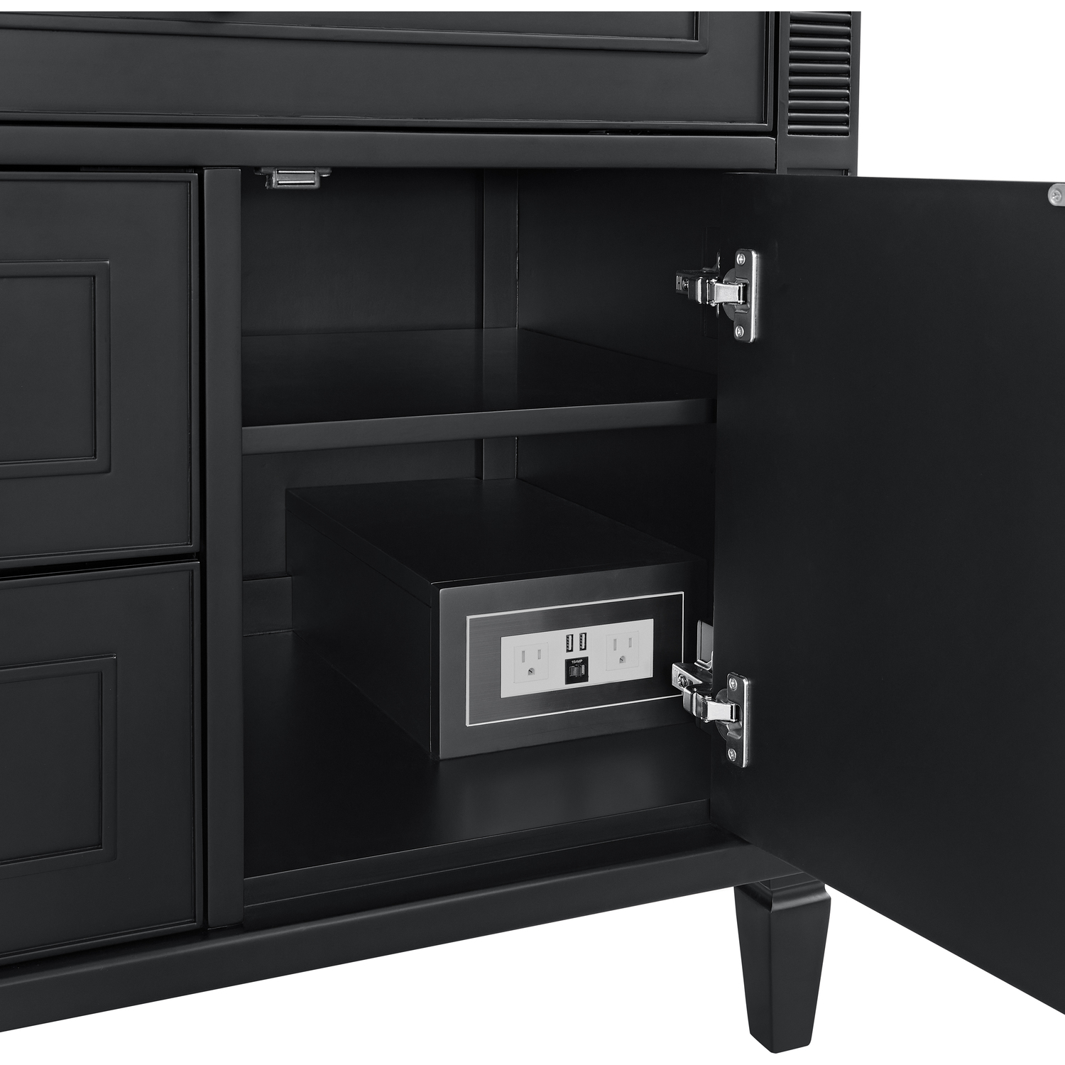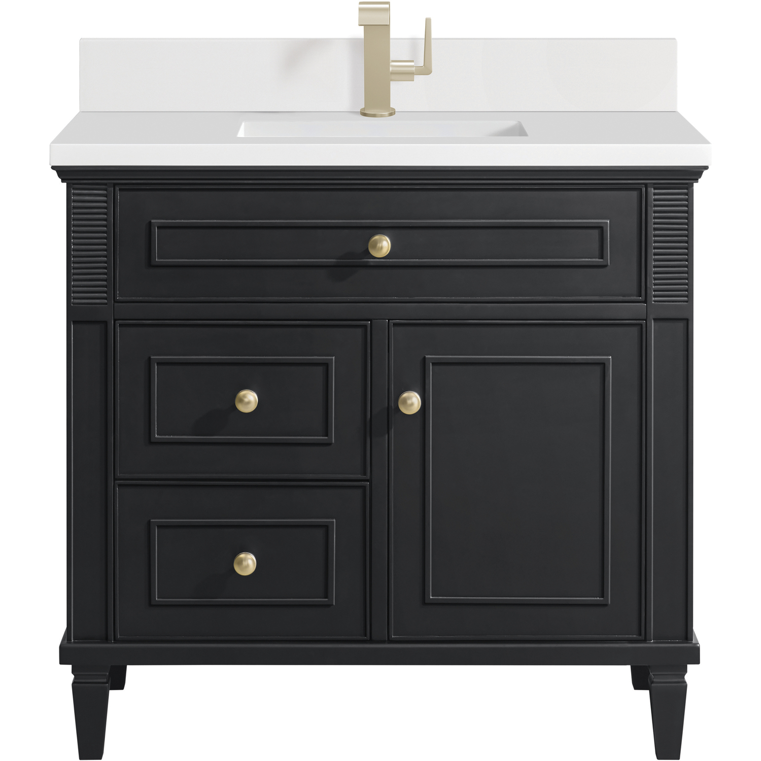 The 36" Lorelai Single Vanity celebrates timeless form and exquisite finish details, combined with practical function. The rich Black Onyx finish is accented by coin-edge knobs in Champagne Brass which provides an sophisticated contrast. Reeded details, and clean, and raised picture frame molding lend visual interest. This single-door cabinet opens to a spacious interior with a single shelf and a convenient USB/Electric power outlet. Two drawers and an upper tip-out drawer offer additional storage space. With the addition of a classic White Zeus Silestone top with backsplash and undermount sink, this vanity is a seamless integration of modern design and functionality.Vanity set includes a 3cm eased edge White Zeus Silestone top with matching backsplash, a white porcelain rectangular sink and mounting brackets for easy installation. Top is pre-drilled for single hole faucet. Faucet not included.Solid wood frame with plywood panels and sealed with our premium moisture and UV resistant coatingsOne 120-volt UL rated electric outlet with USB ports and bamboo organizer includedOne tip-out drawer, two drawers, and one door that opens to an interior shelfRound, coin-edge hardware in a Champagne Brass finishDrawer boxes feature English Dovetail joinery, premium undermount soft-close glides, and brushed aluminum laminate drawer liners for easy cleaningDoor features adjustable soft-close door hingesMatching White Zeus 3cm Silestone backsplash included.Faucet sold separatelyExquisitely crafted, the Lorelai collection is a testament to timeless, versatile design. With reeded accents and clean, raised picture frame details, each piece in this collection effortlessly adds visual interest to your space. The subtle elegance of coin edge knobs and tapered legs enhances the overall aesthetic, while the choice of five versatile finishes and four sizes ensures an perfect match for any bathroom style.1 year warranty against manufacturer's defects. We will repair or replace any defective product, if the product is defective in material or workmanship at our discretion. No warranty is expressed or implied regarding damages resulting from consumer misuse.