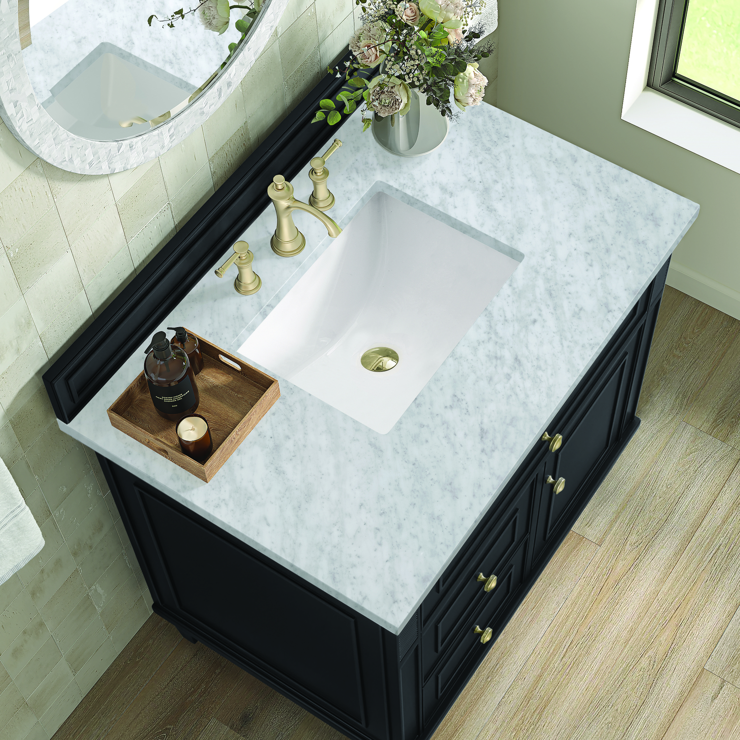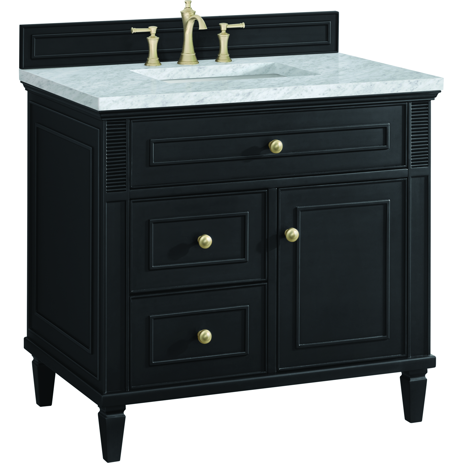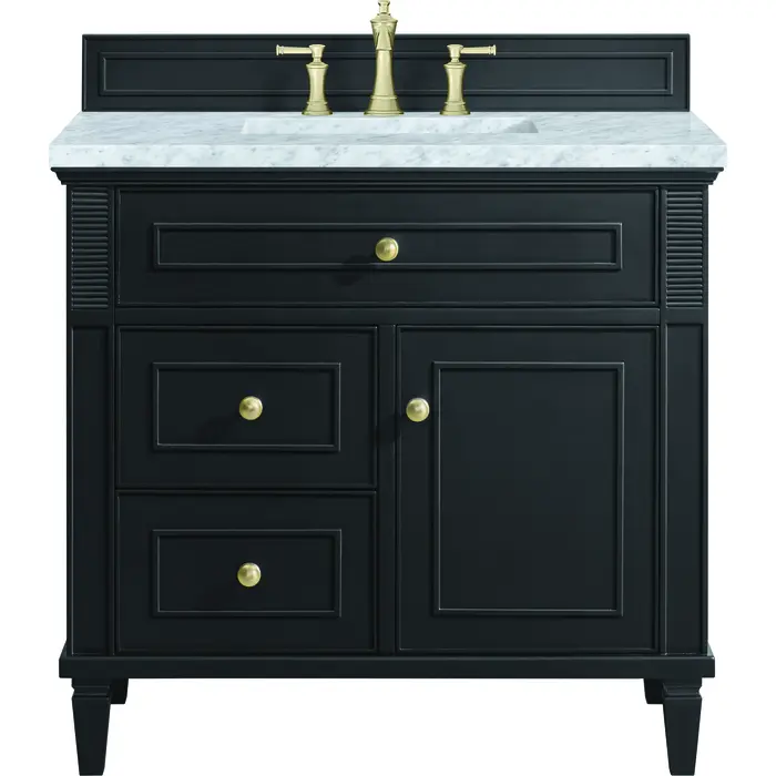 The 36" Lorelai Single Vanity celebrates timeless form and exquisite finish details, combined with practical function. The rich Black Onyx finish is accented by coin-edge knobs in Champagne Brass which provides an sophisticated contrast. Reeded details, and clean, and raised picture frame molding lend visual interest. This single-door cabinet opens to a spacious interior with a single shelf and a convenient USB/Electric power outlet. Two drawers and an upper tip-out drawer offer additional storage space. Completing this vanity, are the treasured, neutral tones and textures of the Carrara marble vanity top display a white background with delicate grey veining.Vanity set includes a 3cm eased edge Carrara Marble top. Includes white porcelain rectangular undermount sink that ships separately and mounting brackets for easy installation. Top is pre-drilled for 8" widespread faucet. Faucet not included.Solid wood frame with plywood panels and sealed with our premium moisture and UV resistant coatingsOne 120-volt UL rated electric outlet with USB ports and bamboo organizer includedOne tip-out drawer, two drawers, and one door that opens to an interior shelfRound, coin-edge hardware in a Champagne Brass finishDrawer boxes feature English Dovetail joinery, premium undermount soft-close glides, and brushed aluminum laminate drawer liners for easy cleaningDoor features adjustable soft-close door hingesExquisitely crafted, the Lorelai collection is a testament to timeless, versatile design. With reeded accents and clean, raised picture frame details, each piece in this collection effortlessly adds visual interest to your space. The subtle elegance of coin edge knobs and tapered legs enhances the overall aesthetic, while the choice of five versatile finishes and four sizes ensures an perfect match for any bathroom style.1 year warranty against manufacturer's defects. We will repair or replace any defective product, if the product is defective in material or workmanship at our discretion. No warranty is expressed or implied regarding damages resulting from consumer misuse.