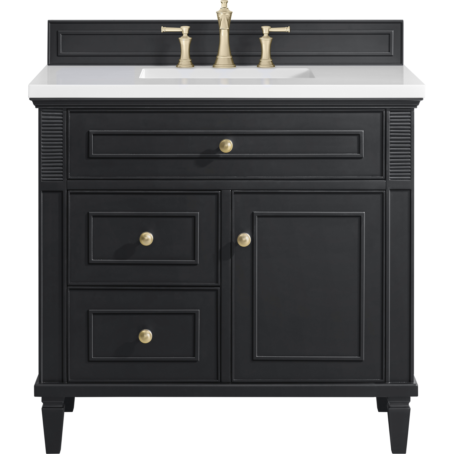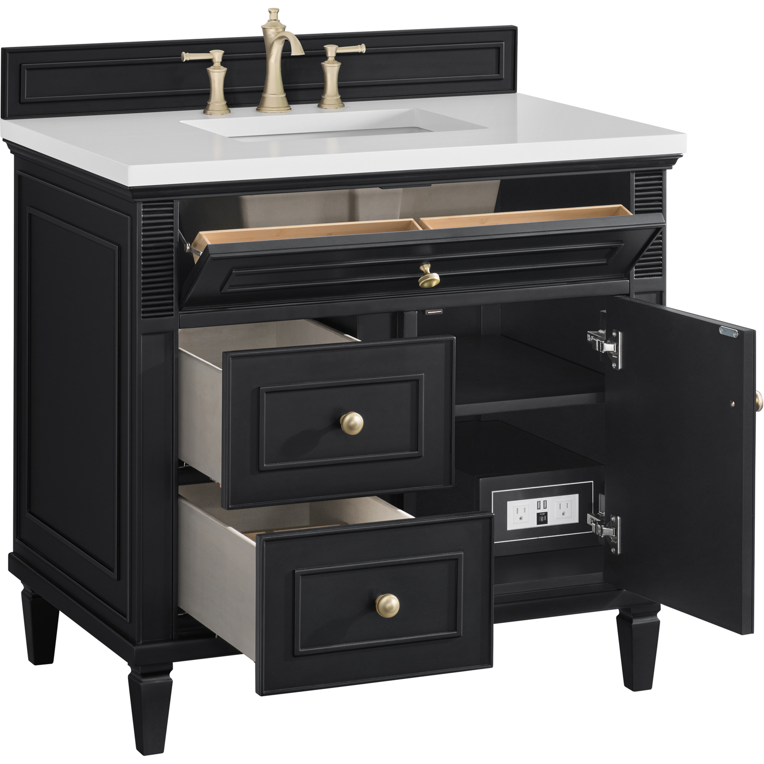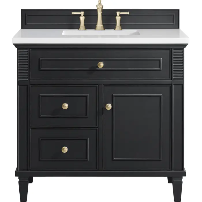 The 36" Lorelai Single Vanity celebrates timeless form and exquisite finish details, combined with practical function. The rich Black Onyx finish is accented by coin-edge knobs in Champagne Brass which provides an sophisticated contrast. Reeded details, and clean, and raised picture frame molding lend visual interest. This single-door cabinet opens to a spacious interior with a single shelf and a convenient USB/Electric power outlet. Two drawers and an upper tip-out drawer offer additional storage space. With the addition of a classic White Zeus Silestone top and undermount sink, this vanity is a seamless integration of modern design and functionality.Vanity set includes a 3cm eased edge White Zeus Silestone top, a white porcelain rectangular sink and mounting brackets for easy installation. Top is pre-drilled for an 8" widespread faucet. Faucet not included.Solid wood frame with plywood panels and sealed with our premium moisture and UV resistant coatingsOne 120-volt UL rated electric outlet with USB ports and bamboo organizer includedOne tip-out drawer, two drawers, and one door that opens to an interior shelfRound, coin-edge hardware in a Champagne Brass finishDrawer boxes feature English Dovetail joinery, premium undermount soft-close glides, and brushed aluminum laminate drawer liners for easy cleaningDoor features adjustable soft-close door hingesExquisitely crafted, the Lorelai collection is a testament to timeless, versatile design. With reeded accents and clean, raised picture frame details, each piece in this collection effortlessly adds visual interest to your space. The subtle elegance of coin edge knobs and tapered legs enhances the overall aesthetic, while the choice of five versatile finishes and four sizes ensures an perfect match for any bathroom style.1 year warranty against manufacturer's defects. We will repair or replace any defective product, if the product is defective in material or workmanship at our discretion. No warranty is expressed or implied regarding damages resulting from consumer misuse.