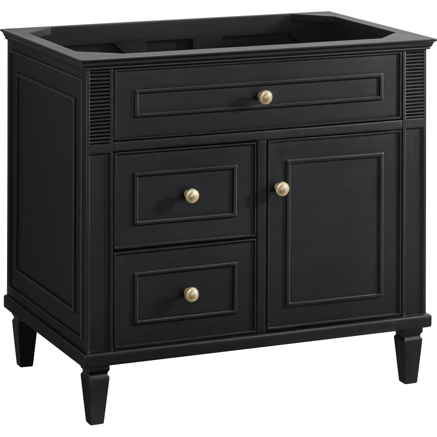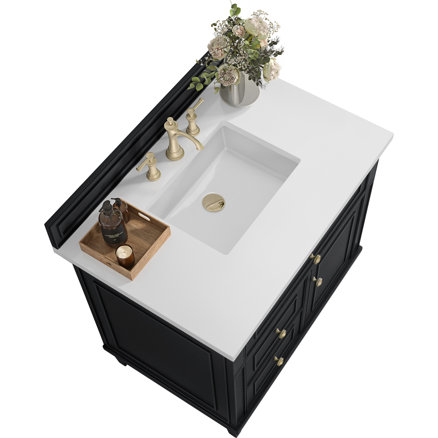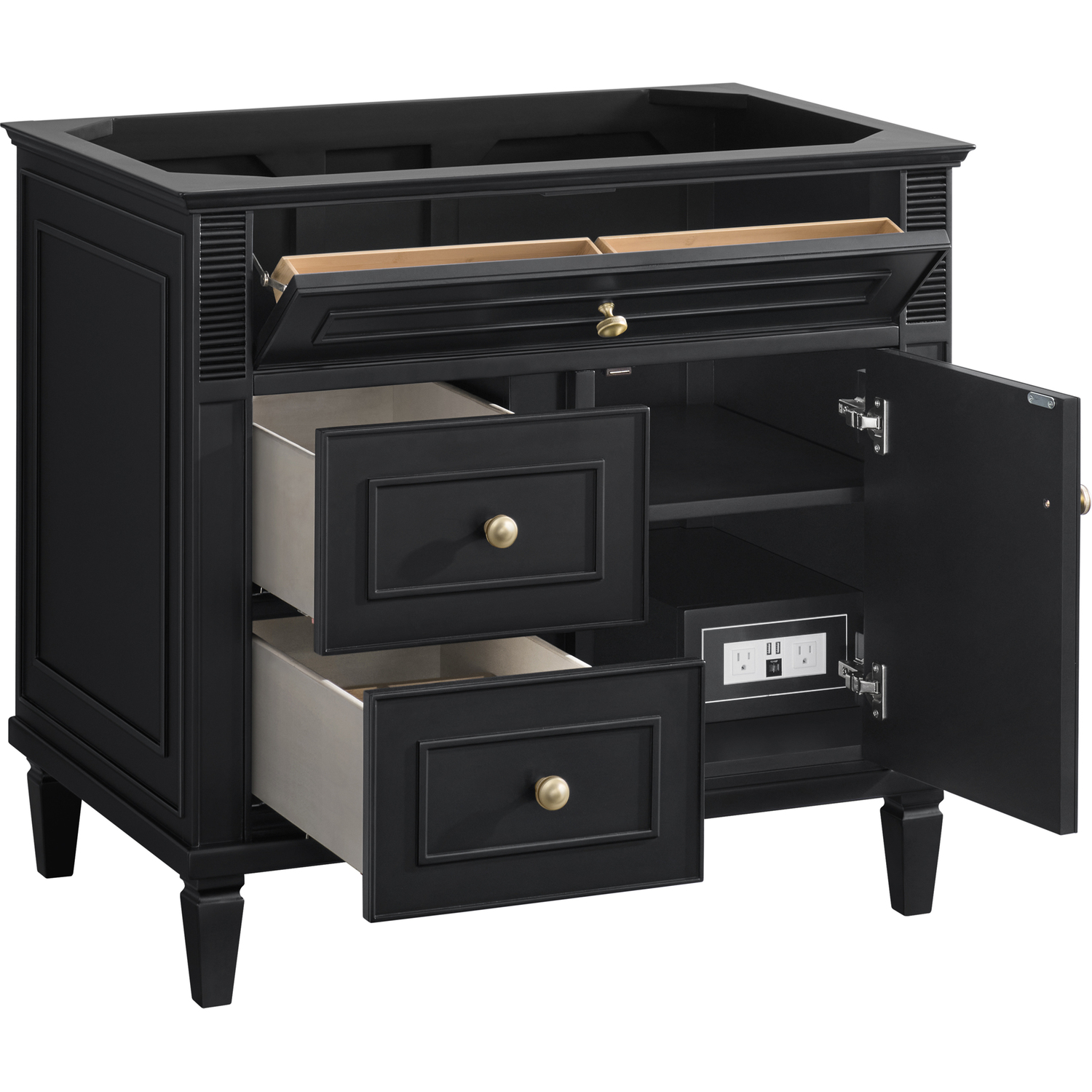 The 36" Lorelai Single Vanity celebrates timeless form and exquisite finish details, combined with practical function. The rich Black Onyx finish is accented by coin-edge knobs in Champagne Brass which provides an sophisticated contrast. Reeded details, and clean, and raised picture frame molding lend visual interest. This single-door cabinet opens to a spacious interior with a single shelf and a convenient USB/Electric power outlet. Two drawers and an upper tip-out drawer offer additional storage space. With the addition of a classic White Zeus Silestone top and undermount sink, this vanity is a seamless integration of modern design and functionality.Vanity set includes a 3cm eased edge White Zeus Silestone top, a white porcelain rectangular sink and mounting brackets for easy installation. Top is pre-drilled for an 8" widespread faucet. Faucet not included.Solid wood frame with plywood panels and sealed with our premium moisture and UV resistant coatingsOne 120-volt UL rated electric outlet with USB ports and bamboo organizer includedOne tip-out drawer, two drawers, and one door that opens to an interior shelfRound, coin-edge hardware in a Champagne Brass finishDrawer boxes feature English Dovetail joinery, premium undermount soft-close glides, and brushed aluminum laminate drawer liners for easy cleaningDoor features adjustable soft-close door hingesExquisitely crafted, the Lorelai collection is a testament to timeless, versatile design. With reeded accents and clean, raised picture frame details, each piece in this collection effortlessly adds visual interest to your space. The subtle elegance of coin edge knobs and tapered legs enhances the overall aesthetic, while the choice of five versatile finishes and four sizes ensures an perfect match for any bathroom style.1 year warranty against manufacturer's defects. We will repair or replace any defective product, if the product is defective in material or workmanship at our discretion. No warranty is expressed or implied regarding damages resulting from consumer misuse.