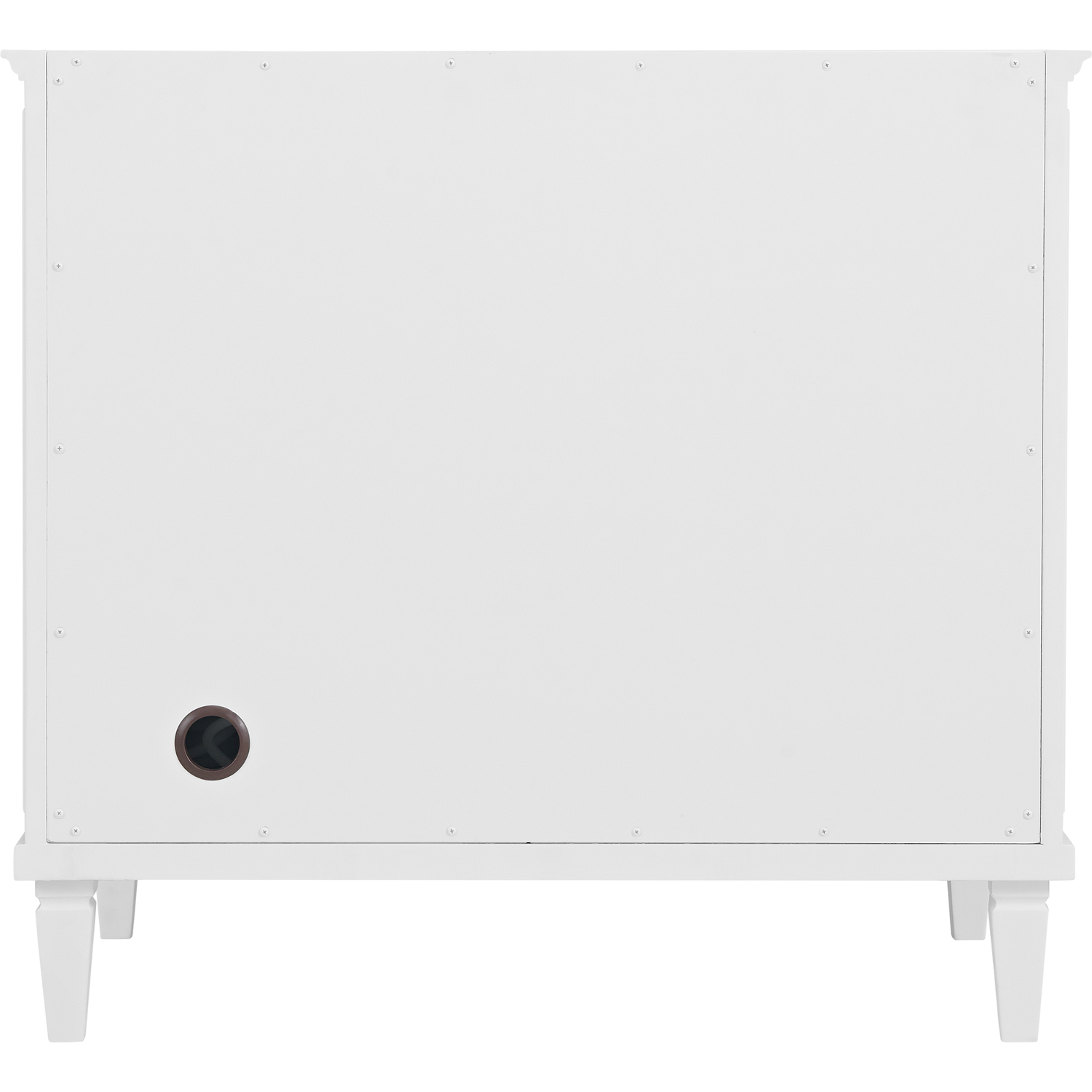 The 36" Lorelai Single Vanity celebrates timeless form and exquisite finish details, combined with practical function. The sophisticated Bright White finish is accented by reeded details, and clean, raised picture frame molding. Coin-edge knobs in Satin Nickel provide the perfect accent. This single-door cabinet opens to a spacious interior with a single shelf and a convenient USB/Electric power outlet. Two drawers and an upper tip-out drawer offer additional storage space. Completing this beautiful vanity is a 3cm solid surface Arctic Fall vanity top, which displays horizontal grey veining, giving you the look of classic marble with the benefits of modern technology.Vanity set includes a 3cm eased edge Arctic Fall Solid Surface top with an undermount white porcelain rectangular sink uninstalled and includes mounting brackets for easy installation. Solid Surface tops are beautifully consistent and have low porosity thSolid wood frame with plywood panels and sealed with our premium moisture and UV resistant coatingsOne 120-volt UL rated electric outlet with USB ports and bamboo organizer includedOne tip-out drawer, two drawers, and one door that opens to an interior shelfRound, coin-edge hardware in a Satin Nickel finishDrawer boxes feature English Dovetail joinery, premium undermount soft-close glides, and brushed aluminum laminate drawer liners for easy cleaningDoor features adjustable soft-close door hingesExquisitely crafted, the Lorelai collection is a testament to timeless, versatile design. With reeded accents and clean, raised picture frame details, each piece in this collection effortlessly adds visual interest to your space. The subtle elegance of coin edge knobs and tapered legs enhances the overall aesthetic, while the choice of five versatile finishes and four sizes ensures an perfect match for any bathroom style.1 year warranty against manufacturer's defects. We will repair or replace any defective product, if the product is defective in material or workmanship at our discretion. No warranty is expressed or implied regarding damages resulting from consumer misuse.