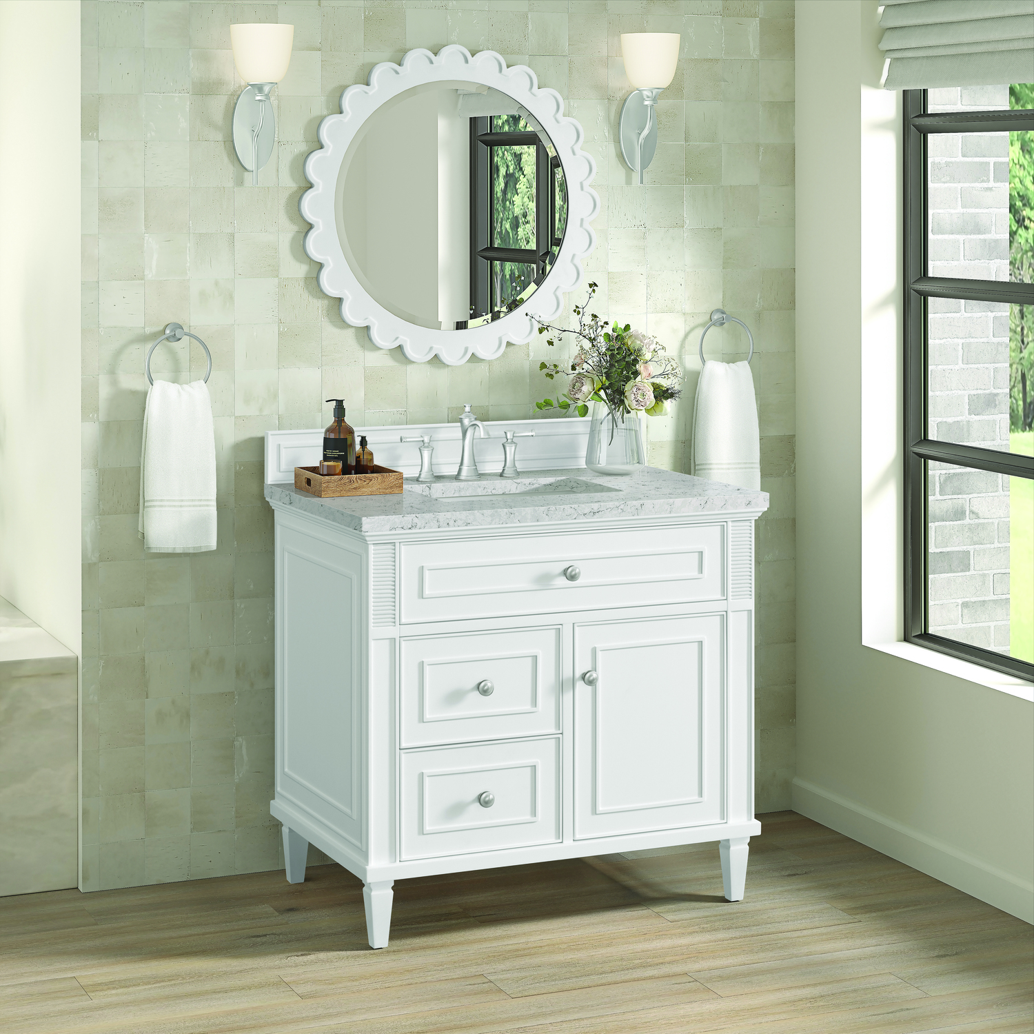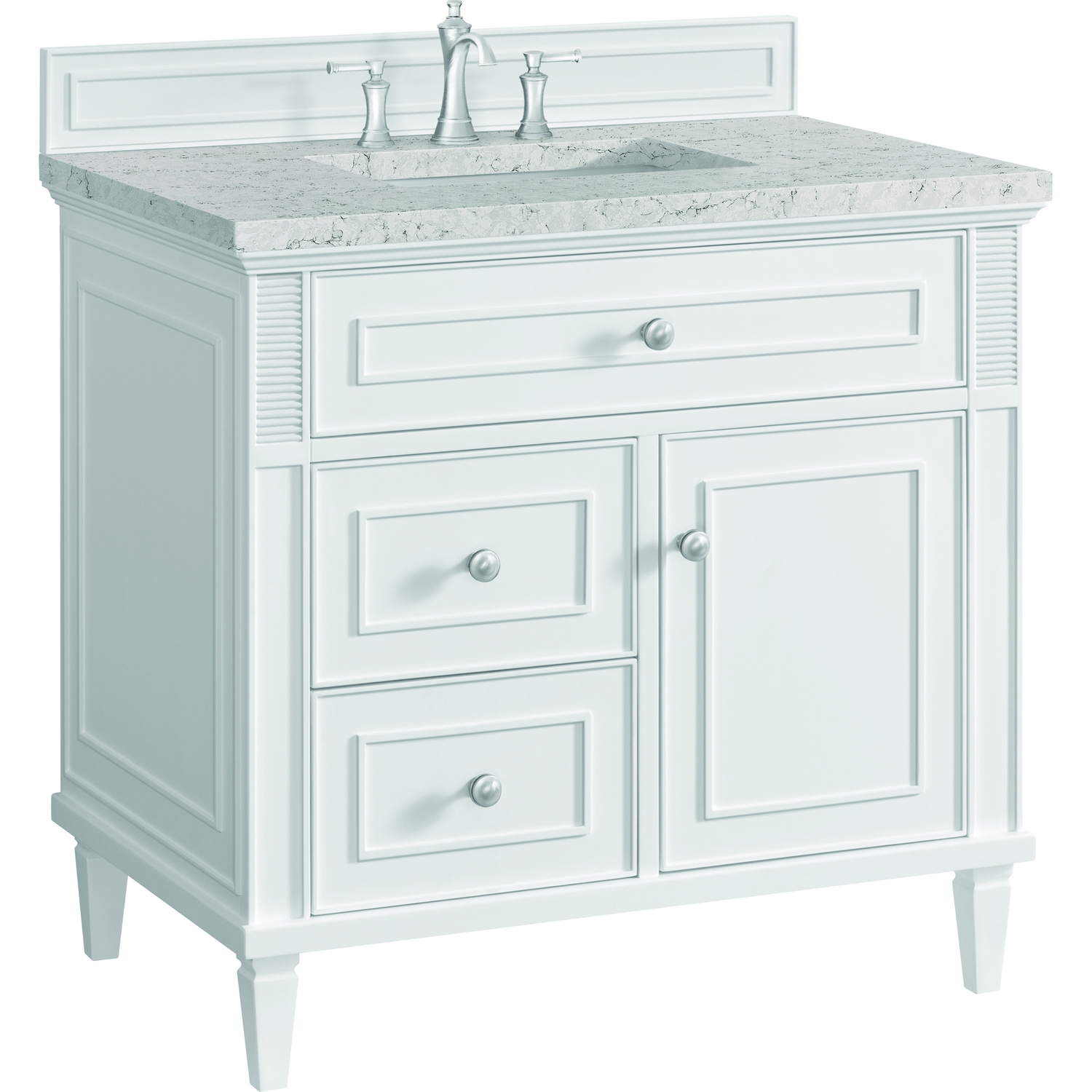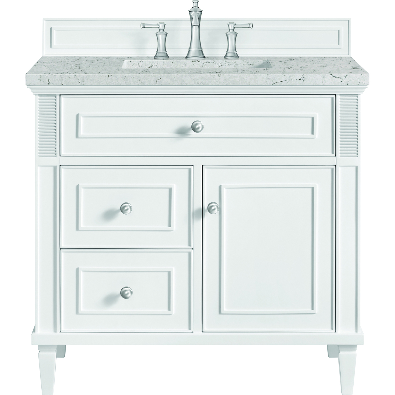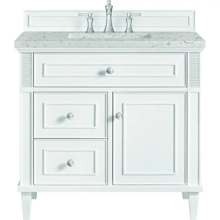 The 36" Lorelai Single Vanity celebrates timeless form and exquisite finish details, combined with practical function. The sophisticated Bright White finish is accented by reeded details, and clean, raised picture frame molding. Coin-edge knobs in Satin Nickel provide the perfect accent. This single-door cabinet opens to a spacious interior with a single shelf and a convenient USB/Electric power outlet. Two drawers and an upper tip-out drawer offer additional storage space. Completing the look is the Eternal Jasmine Pearl Silestone top by Cosentino, featuring an elegant white background with subtle marbleized swirls and dark Bleu-gray veining patterns.Vanity set includes a 3cm eased edge Eternal Jasmine Pearl Silestone top. Includes a white porcelain rectangular undermount sink that ships separately and mounting brackets for easy installation. Top is pre-drilled for 8" widespread faucet. Faucet not incSolid wood frame with plywood panels and sealed with our premium moisture and UV resistant coatingsOne 120-volt UL rated electric outlet with USB ports and bamboo organizer includedOne tip-out drawer, two drawers, and one door that opens to an interior shelfRound, coin-edge hardware in a Satin Nickel finishDrawer boxes feature English Dovetail joinery, premium undermount soft-close glides, and brushed aluminum laminate drawer liners for easy cleaningDoor features adjustable soft-close door hingesExquisitely crafted, the Lorelai collection is a testament to timeless, versatile design. With reeded accents and clean, raised picture frame details, each piece in this collection effortlessly adds visual interest to your space. The subtle elegance of coin edge knobs and tapered legs enhances the overall aesthetic, while the choice of five versatile finishes and four sizes ensures an perfect match for any bathroom style.1 year warranty against manufacturer's defects. We will repair or replace any defective product, if the product is defective in material or workmanship at our discretion. No warranty is expressed or implied regarding damages resulting from consumer misuse.