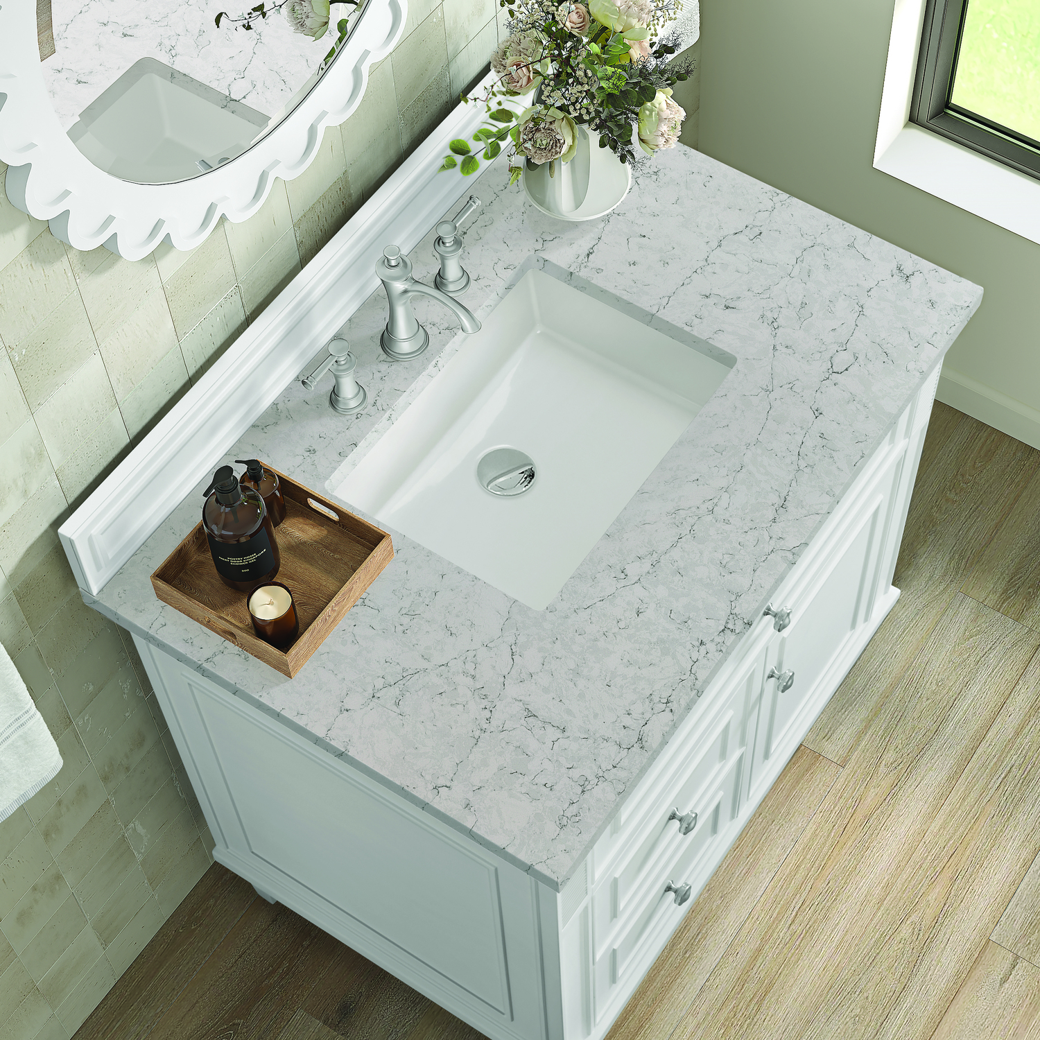 James Martin Lorelai 36 inch Single Vanity, Bright White w/ 3 CM Eternal Jasmine Pearl Quartz Top, 840108971181, 424-V36-BW-3EJP