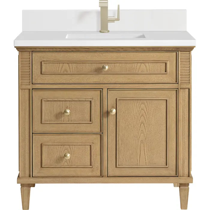 The 36" Lorelai Single Vanity celebrates timeless form and exquisite finish details, combined with practical function. The Light Natural Oak finish is accented by reeded details, and clean, raised picture frame molding. Coin-edge knobs in Champagne Brass provide the perfect accent. This single-door cabinet opens to a spacious interior with a single shelf and a convenient USB/Electric power outlet. Two drawers and an upper tip-out drawer offer additional storage space. With the addition of a classic White Zeus Silestone top with backsplash and undermount sink, this vanity is a seamless integration of modern design and functionality.Vanity set includes a 3cm eased edge White Zeus Silestone top with matching backsplash, a white porcelain rectangular sink and mounting brackets for easy installation. Top is pre-drilled for single hole faucet. Faucet not included.Solid Ash wood frame and Ash wood veneers over plywood panels and sealed with our premium moisture and UV resistant coatingsOne 120-volt UL rated electric outlet with USB ports and bamboo organizer includedOne tip-out drawer, two drawers, and one door that opens to an interior shelfRound, coin-edge hardware in a Champagne Brass finishDrawer boxes feature English Dovetail joinery, premium undermount soft-close glides, and brushed aluminum laminate drawer liners for easy cleaningDoor features adjustable soft-close door hingesMatching White Zeus 3cm Silestone backsplash included.Faucet sold separatelyExquisitely crafted, the Lorelai collection is a testament to timeless, versatile design. With reeded accents and clean, raised picture frame details, each piece in this collection effortlessly adds visual interest to your space. The subtle elegance of coin edge knobs and tapered legs enhances the overall aesthetic, while the choice of five versatile finishes and four sizes ensures an perfect match for any bathroom style.1 year warranty against manufacturer's defects. We will repair or replace any defective product, if the product is defective in material or workmanship at our discretion. No warranty is expressed or implied regarding damages resulting from consumer misuse.