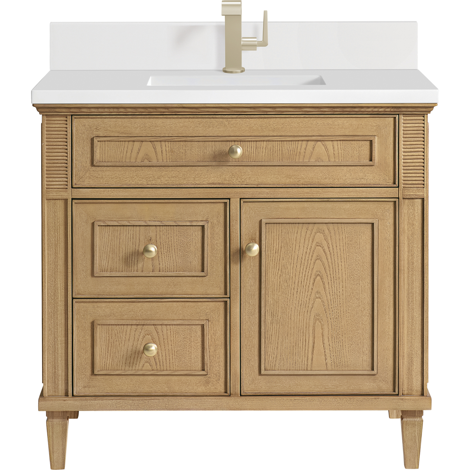 James Martin Lorelai 36 inch Single Vanity, Light Natural Oak w/ Single Hole 3 CM White Zeus Quartz Top & Backsplash, 840108971372, 424-V36-LNO-1WZ