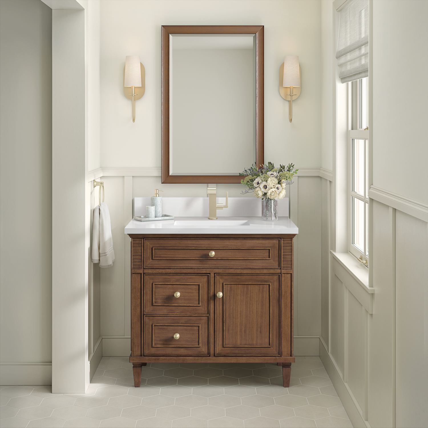 James Martin Lorelai 36 inch Single Vanity, Mid-Century Walnut w/ Single Hole 3 CM White Zeus Quartz Top & Backsplash, 840108971488, 424-V36-WLT-1WZ