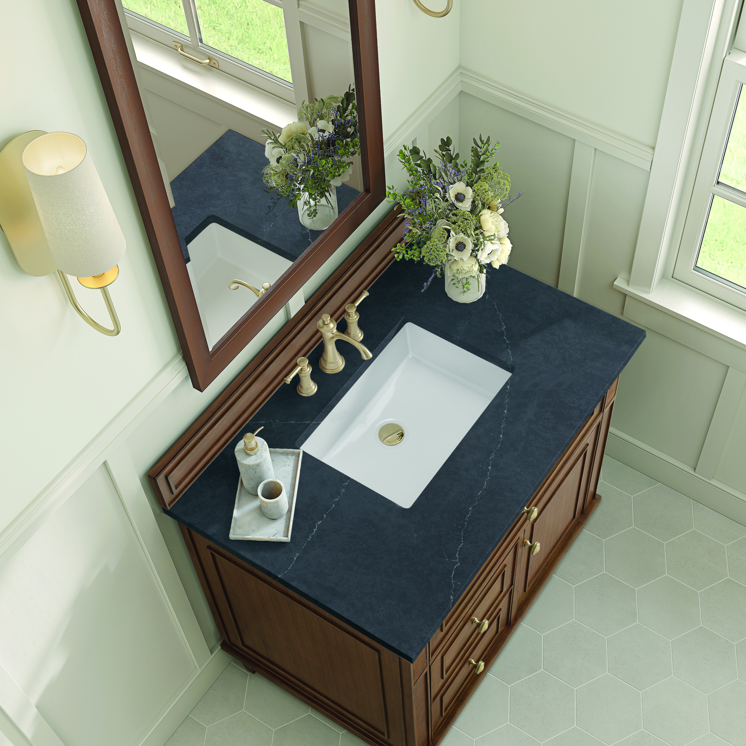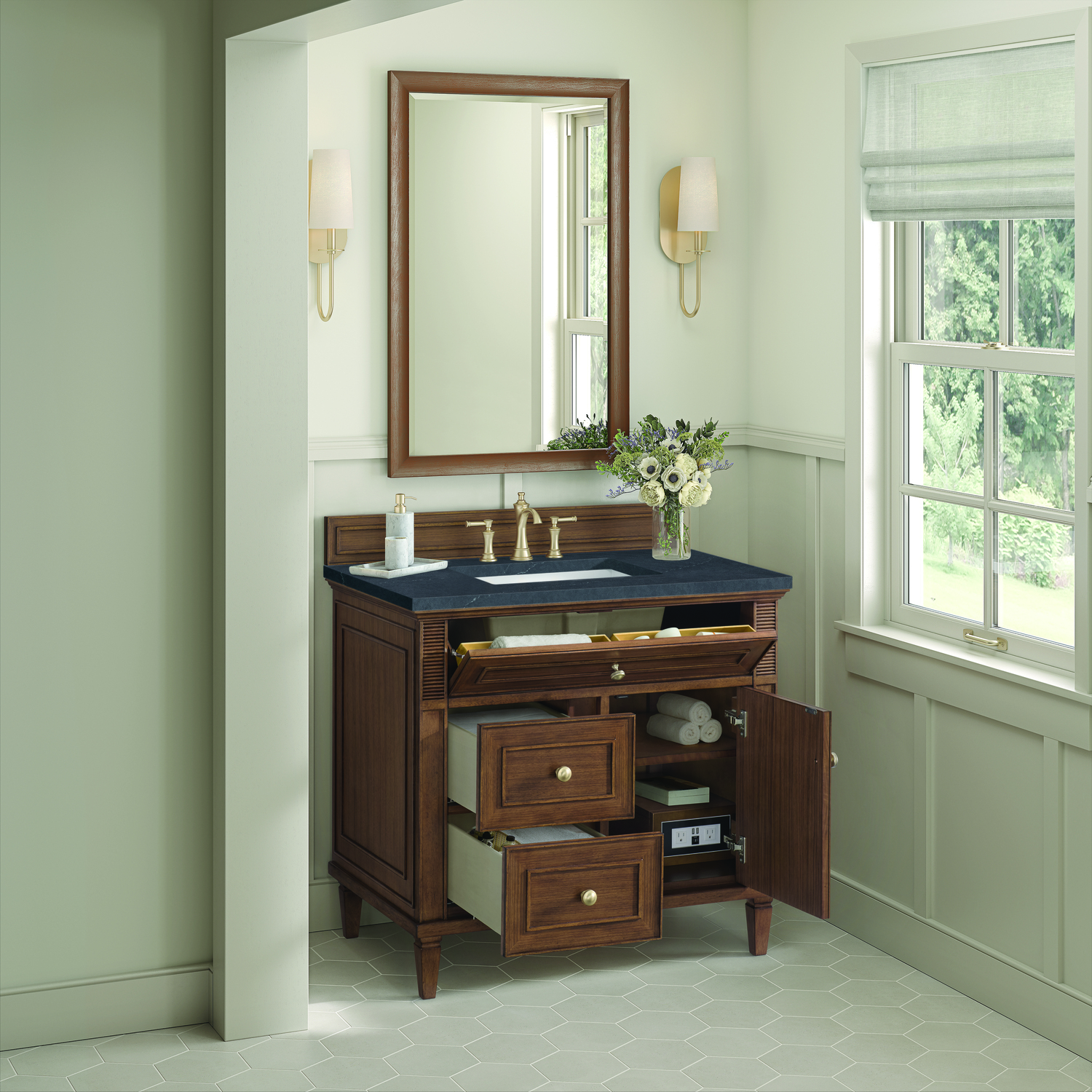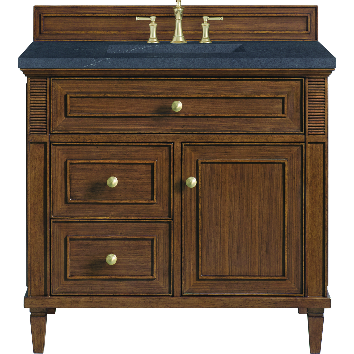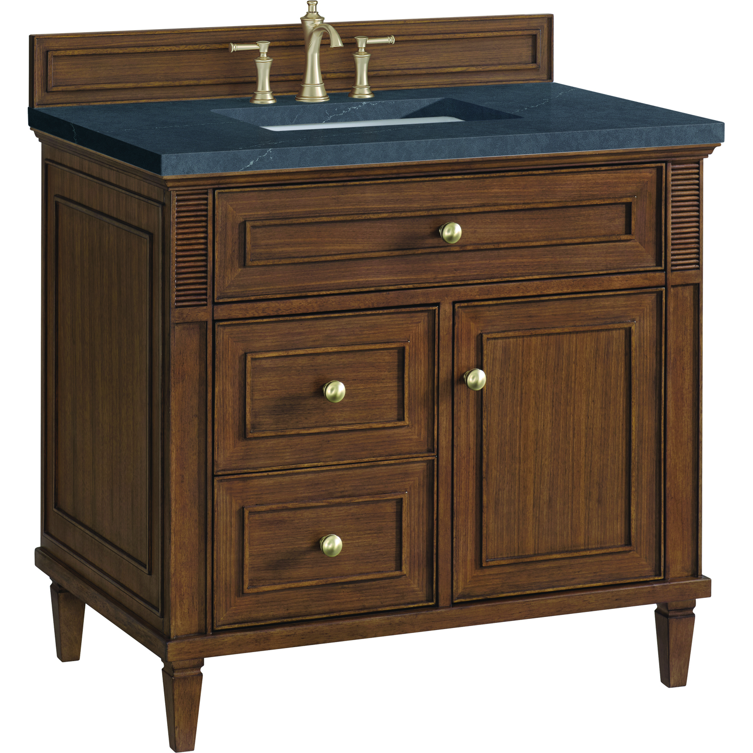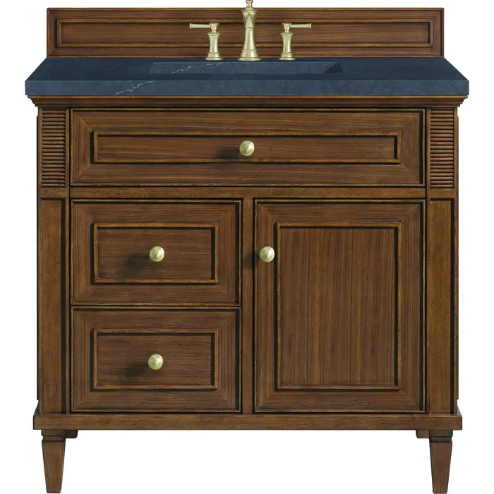 The 36" Lorelai Single Vanity celebrates timeless form and exquisite finish details, combined with practical function. The beauty of the natural grains in the walnut veneer is accented by reeded details, and clean, raised picture frame molding. The decorative, coin-edge knobs in Champagne Brass provide the perfect complement to the Mid-Century Walnut finish. This single-door cabinet opens to a spacious interior with a single shelf and a convenient USB/Electric power outlet. Two drawers and an upper tip-out drawer offer additional storage space. Completing this piece is a distinguished top, characterized by depth and a sense of movement with a suede finish. The Charcoal Soapstone Silestone top is a timeless statement to complete the look of your vanity.Vanity set includes a 3cm eased edge Charcoal Soapstone Silestone top, a white porcelain rectangular sink and mounting brackets for easy installation. Top is pre-drilled for an 8" widespread faucet. Faucet not included.Solid wood frame and Walnut veneers over plywood panels and natural walnut veneer and sealed with our premium moisture and UV resistant coatingsOne 120-volt UL rated electric outlet with USB ports and bamboo organizer includedOne tip-out drawer, two drawers, and one door that opens to an interior shelfRound, coin-edge hardware in a Champagne Brass finishDrawer boxes feature English Dovetail joinery, premium undermount soft-close glides, and brushed aluminum laminate drawer liners for easy cleaningDoor features adjustable soft-close door hingesExquisitely crafted, the Lorelai collection is a testament to timeless, versatile design. With reeded accents and clean, raised picture frame details, each piece in this collection effortlessly adds visual interest to your space. The subtle elegance of coin edge knobs and tapered legs enhances the overall aesthetic, while the choice of five versatile finishes and four sizes ensures an perfect match for any bathroom style.1 year warranty against manufacturer's defects. We will repair or replace any defective product, if the product is defective in material or workmanship at our discretion. No warranty is expressed or implied regarding damages resulting from consumer misuse.