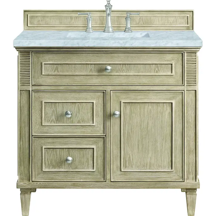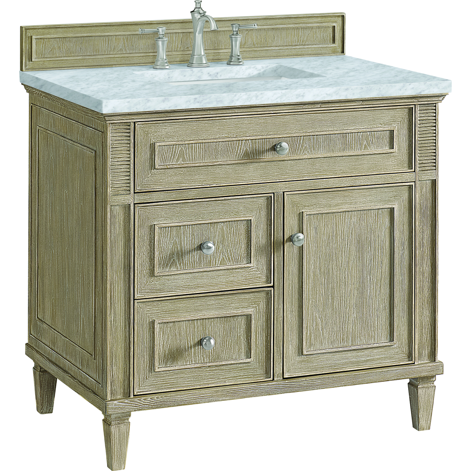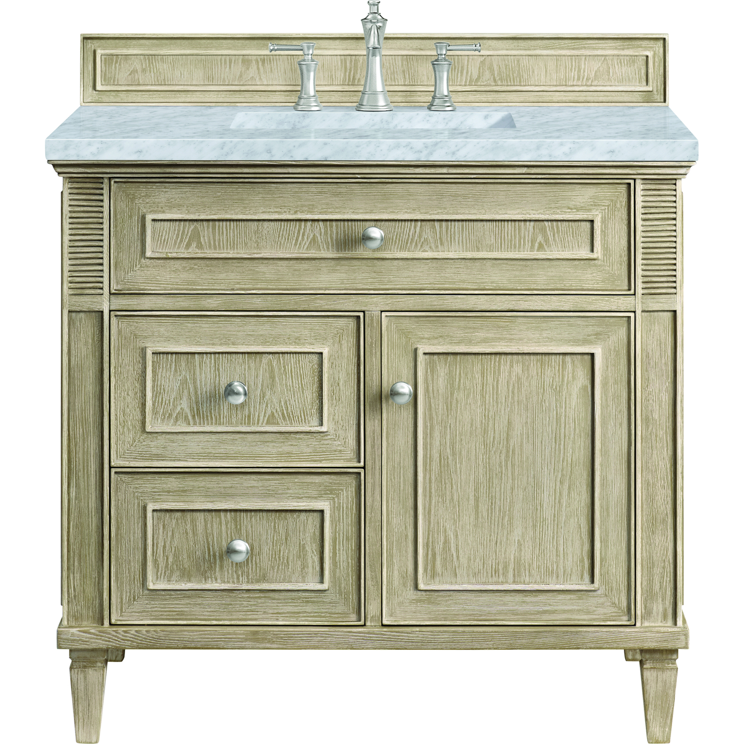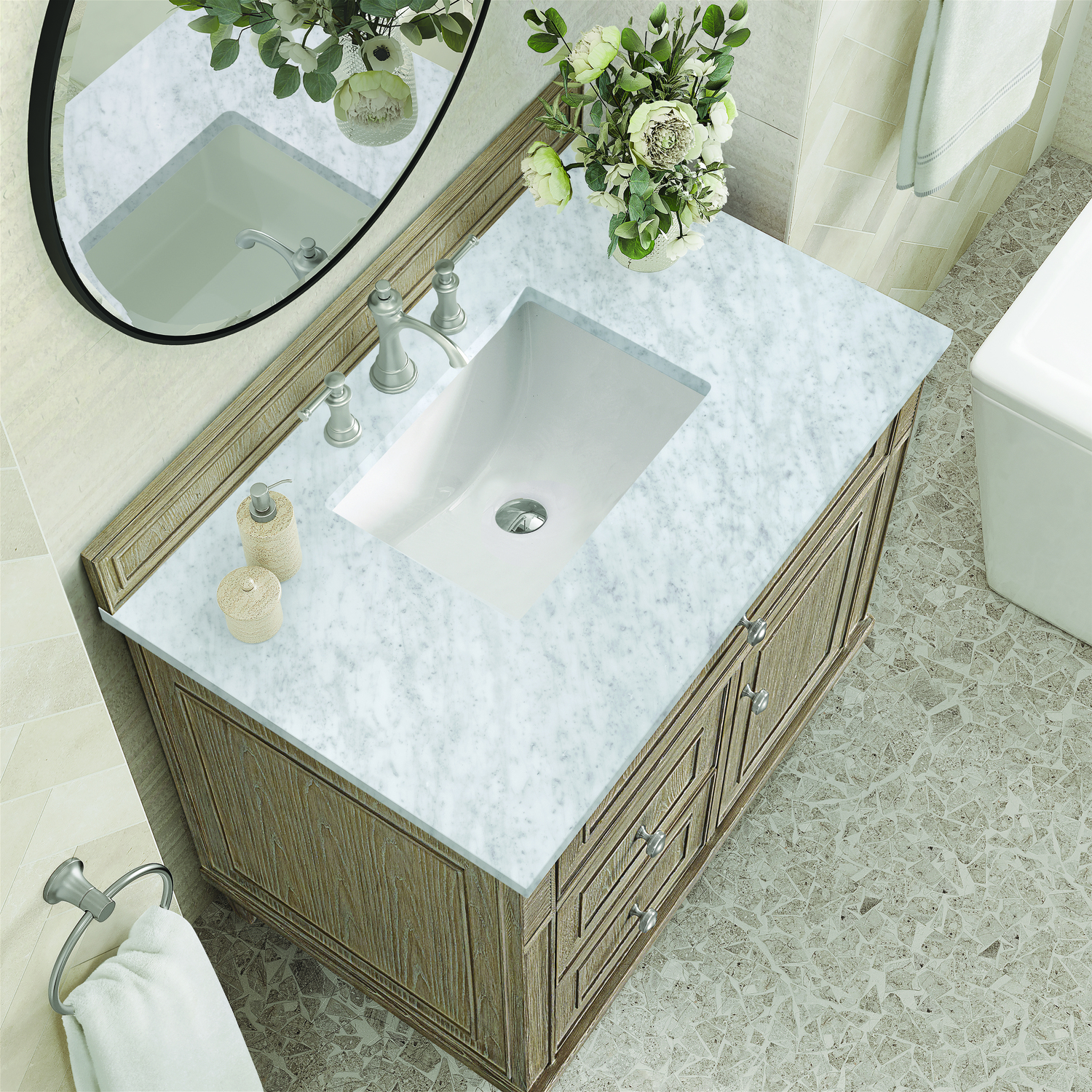 James Martin Lorelai 36 inch Single Vanity, Whitewashed Oak w/ 3 CM Carrara White Marble Top, 840108971501, 424-V36-WWO-3CAR