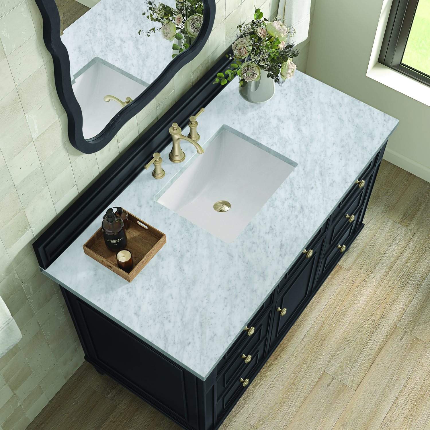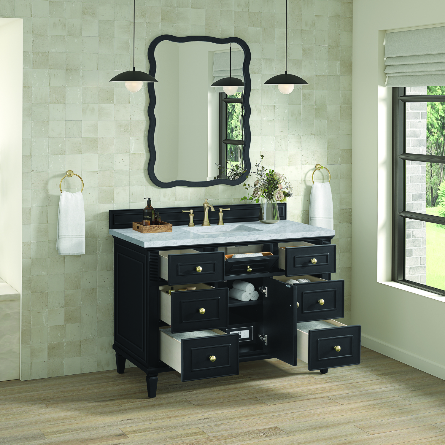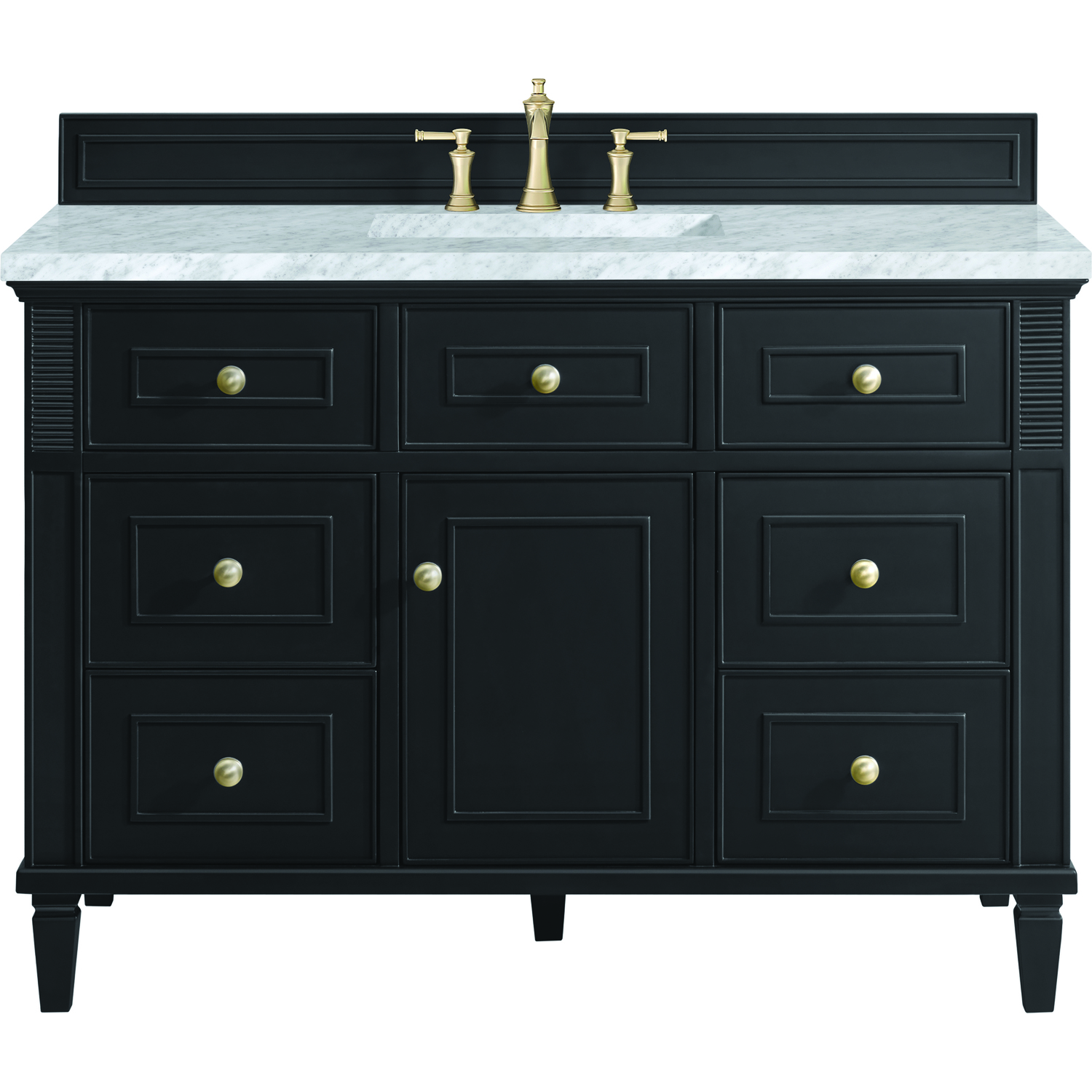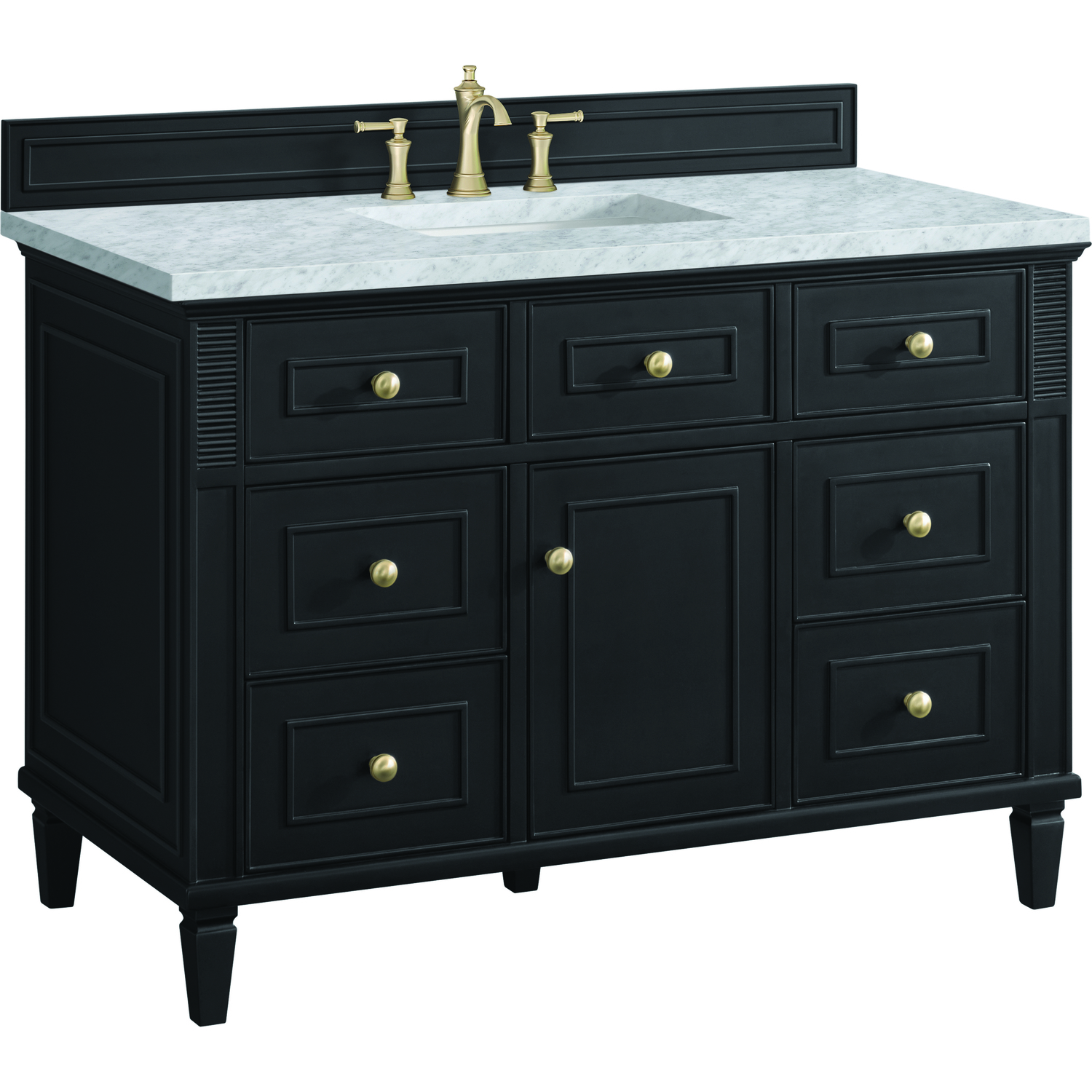 The 48" Lorelai Single Vanity celebrates timeless form and exquisite finish details, combined with practical function. The rich Black Onyx finish is accented by coin-edge knobs in Champagne Brass which provides an sophisticated contrast. Reeded details, and clean, and raised picture frame molding lend visual interest. This single-door cabinet opens to a spacious interior with a single shelf and a convenient USB/Electric power outlet. Six drawers plus one tip-out drawer offer additional storage space. Completing this vanity, are the treasured, neutral tones and textures of the Carrara marble vanity top display a white background with delicate grey veining.Vanity set includes a 3cm eased edge Carrara Marble top. Includes white porcelain rectangular undermount sink that ships separately and mounting brackets for easy installation. Top is pre-drilled for 8" widespread faucet. Faucet not included.Solid wood frame with plywood panels and sealed with our premium moisture and UV resistant coatingsOne 120-volt UL rated electric outlet with USB ports and bamboo organizer includedOne tip-out drawer, six drawers, and one door that opens to an interior shelfRound, coin-edge hardware in a Champagne Brass finishDrawer boxes feature English Dovetail joinery, premium undermount soft-close glides, and brushed aluminum laminate drawer liners for easy cleaningDoor features adjustable soft-close door hingesExquisitely crafted, the Lorelai collection is a testament to timeless, versatile design. With reeded accents and clean, raised picture frame details, each piece in this collection effortlessly adds visual interest to your space. The subtle elegance of coin edge knobs and tapered legs enhances the overall aesthetic, while the choice of five versatile finishes and four sizes ensures an perfect match for any bathroom style.1 year warranty against manufacturer's defects. We will repair or replace any defective product, if the product is defective in material or workmanship at our discretion. No warranty is expressed or implied regarding damages resulting from consumer misuse.