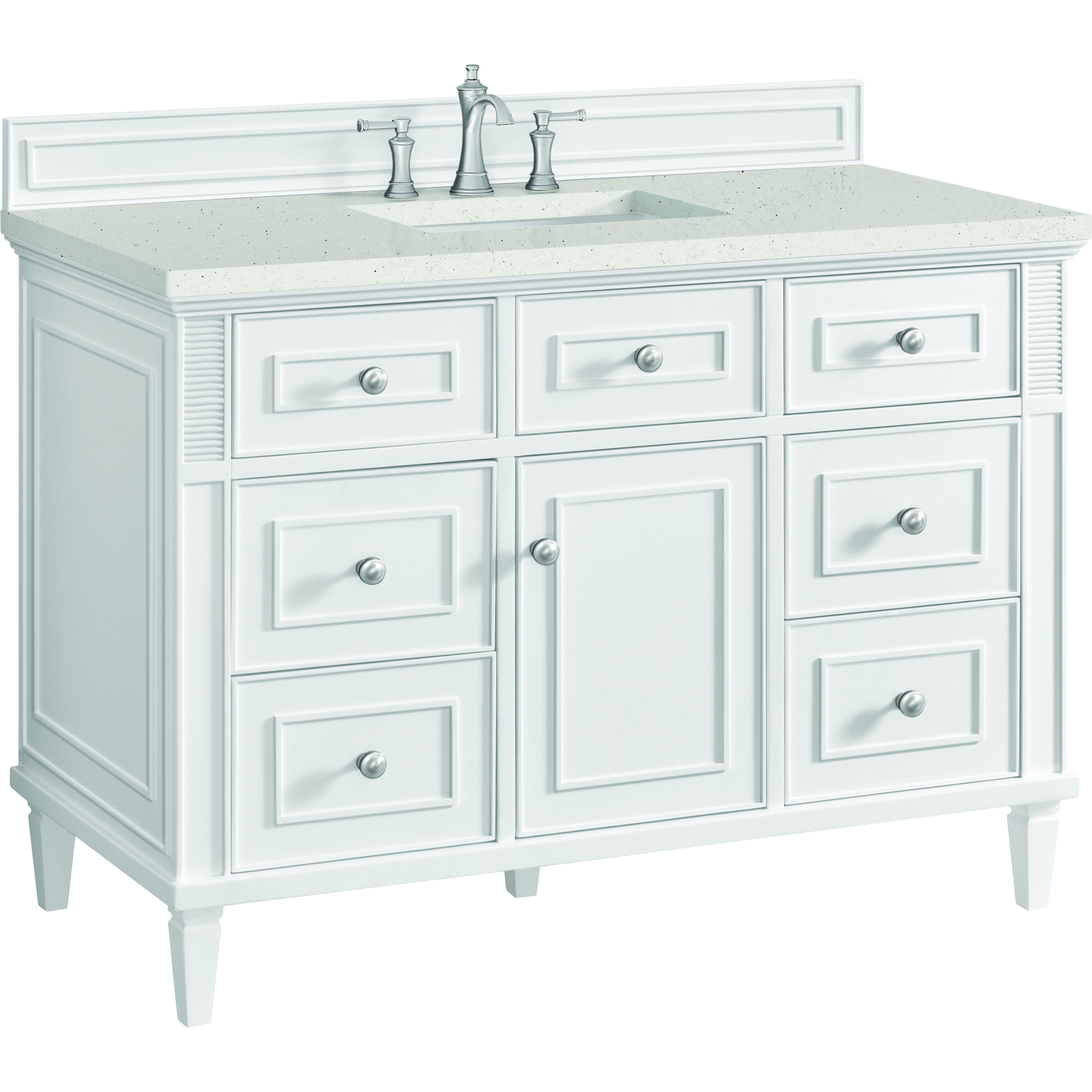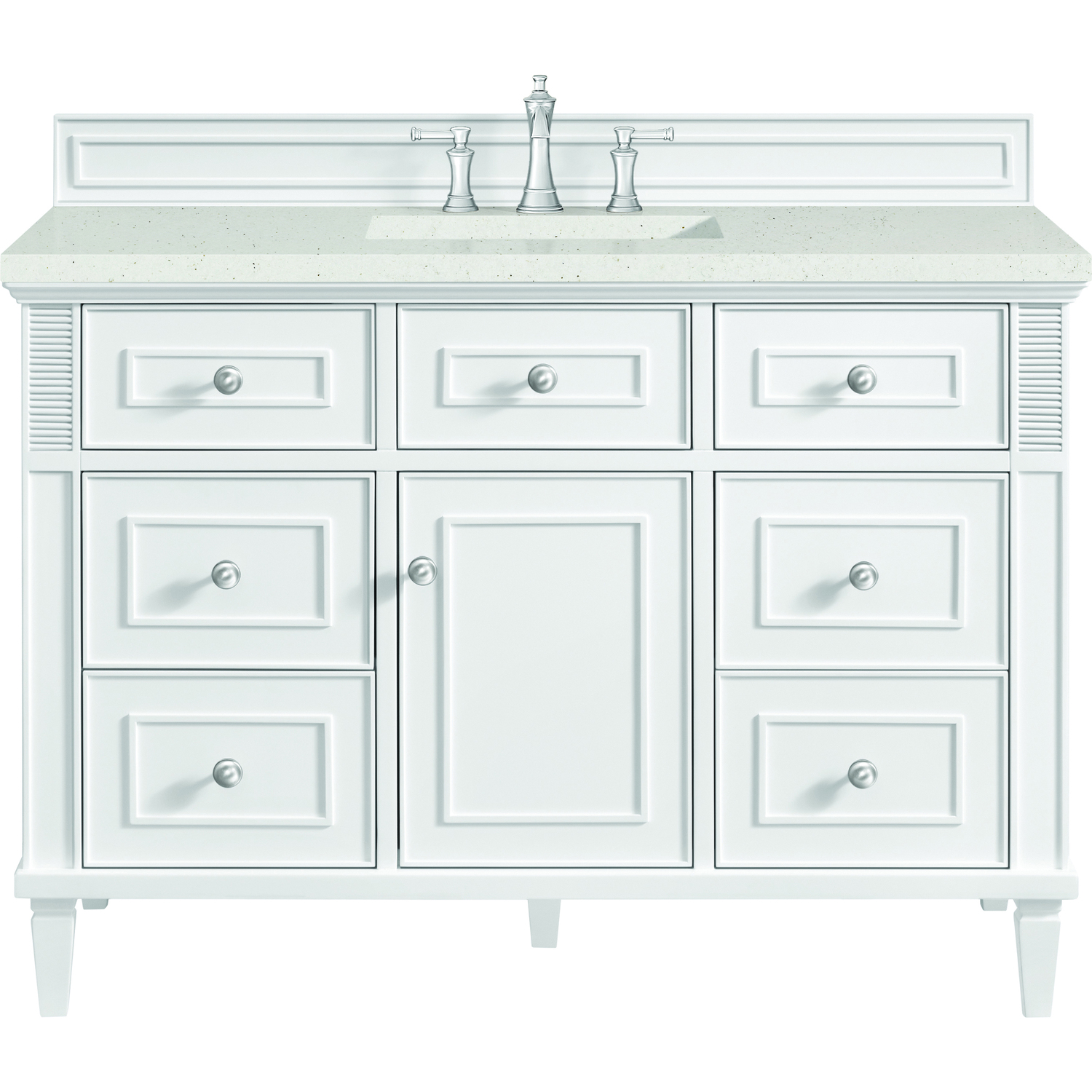 The 48" Lorelai Single Vanity celebrates timeless form and exquisite finish details, combined with practical function. The sophisticated Bright White finish is accented by reeded details, and clean, raised picture frame molding. Coin-edge knobs in Satin Nickel provide the perfect accent. This single-door cabinet opens to a spacious interior with a single shelf and a convenient USB/Electric power outlet. Six drawers plus one tip-out drawer offer additional storage space. The Lime Delight Silestone top lends warm, textured beige tones to perfectly complement the finish on the vanity.Vanity set includes a 3cm eased edge Limestone Delight Silestone top. Includes white porcelain rectangular undermount sink that ships separately and mounting brackets for easy installation. Top is pre-drilled for 8" widespread faucet. Faucet not included.Solid wood frame with plywood panels and sealed with our premium moisture and UV resistant coatingsOne 120-volt UL rated electric outlet with USB ports and bamboo organizer includedOne tip-out drawer, six drawers, and one door that opens to an interior shelfRound, coin-edge hardware in a Satin Nickel finishDrawer boxes feature English Dovetail joinery, premium undermount soft-close glides, and brushed aluminum laminate drawer liners for easy cleaningDoor features adjustable soft-close door hingesExquisitely crafted, the Lorelai collection is a testament to timeless, versatile design. With reeded accents and clean, raised picture frame details, each piece in this collection effortlessly adds visual interest to your space. The subtle elegance of coin edge knobs and tapered legs enhances the overall aesthetic, while the choice of five versatile finishes and four sizes ensures an perfect match for any bathroom style.1 year warranty against manufacturer's defects. We will repair or replace any defective product, if the product is defective in material or workmanship at our discretion. No warranty is expressed or implied regarding damages resulting from consumer misuse.