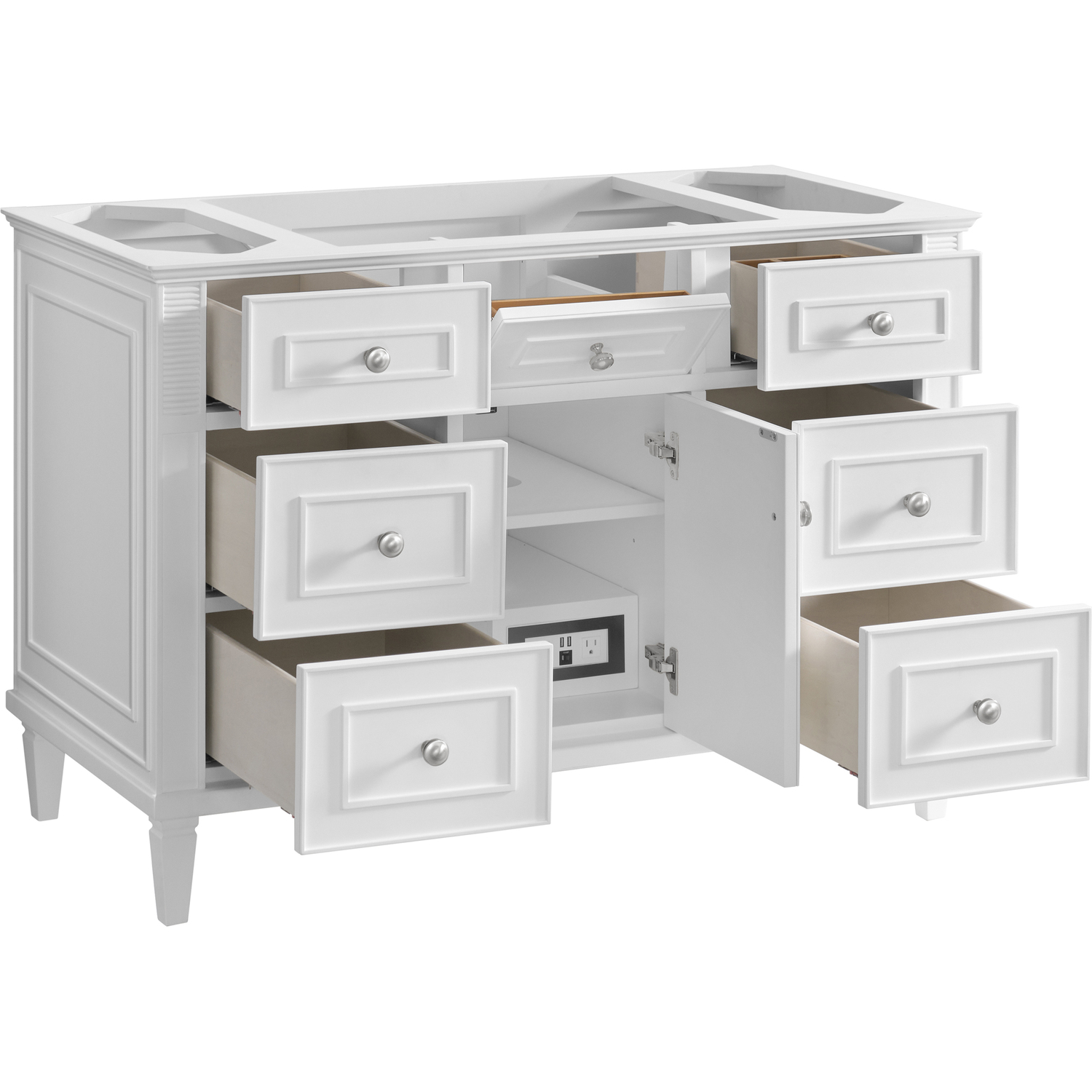 The 48" Lorelai Single Vanity celebrates timeless form and exquisite finish details, combined with practical function. The sophisticated Bright White finish is accented by reeded details, and clean, raised picture frame molding. Coin-edge knobs in Satin Nickel provide the perfect accent. This single-door cabinet opens to a spacious interior with a single shelf and a convenient USB/Electric power outlet. Six drawers plus one tip-out drawer offer additional storage space. The finish and hardware accents are enhanced by the Parisien Blue Silestone top, offering a deep bluish hue with broad and intricate neutral veins highlighted by fine coppery accents.Vanity set includes a 3cm eased edge Parisien Blue Silestone top, which includes one white porcelain rectangular undermount sink that ships separately, as well as mounting brackets for easy installation. The top is pre-drilled for an 8" widespread faucet.Solid wood frame with plywood panels and sealed with our premium moisture and UV resistant coatingsOne 120-volt UL rated electric outlet with USB ports and bamboo organizer includedOne tip-out drawer, six drawers, and one door that opens to an interior shelfRound, coin-edge hardware in a Satin Nickel finishDrawer boxes feature English Dovetail joinery, premium undermount soft-close glides, and brushed aluminum laminate drawer liners for easy cleaningDoor features adjustable soft-close door hingesExquisitely crafted, the Lorelai collection is a testament to timeless, versatile design. With reeded accents and clean, raised picture frame details, each piece in this collection effortlessly adds visual interest to your space. The subtle elegance of coin edge knobs and tapered legs enhances the overall aesthetic, while the choice of five versatile finishes and four sizes ensures an perfect match for any bathroom style.1 year warranty against manufacturer's defects. We will repair or replace any defective product, if the product is defective in material or workmanship at our discretion. No warranty is expressed or implied regarding damages resulting from consumer misuse.
