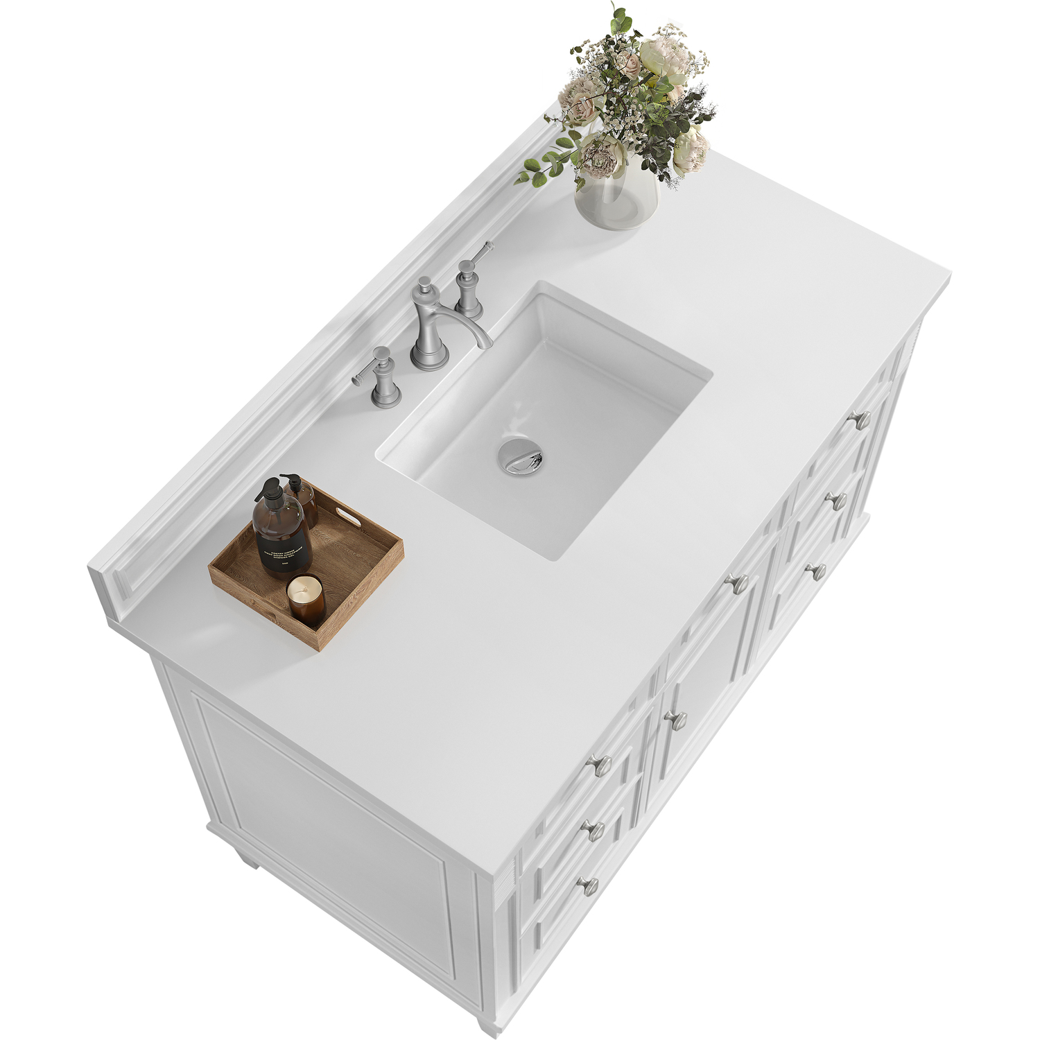The 48" Lorelai Single Vanity celebrates timeless form and exquisite finish details, combined with practical function. The sophisticated Bright White finish is accented by reeded details, and clean, raised picture frame molding. Coin-edge knobs in Satin Nickel provide the perfect accent. This single-door cabinet opens to a spacious interior with a single shelf and a convenient USB/Electric power outlet. Six drawers plus one tip-out drawer offer additional storage space. With the addition of a classic White Zeus Silestone top and undermount sink, this vanity is a seamless integration of modern design and functionality.Vanity set includes a 3cm eased edge White Zeus Silestone top, a white porcelain rectangular sink and mounting brackets for easy installation. Top is pre-drilled for an 8" widespread faucet. Faucet not included.Solid wood frame with plywood panels and sealed with our premium moisture and UV resistant coatingsOne 120-volt UL rated electric outlet with USB ports and bamboo organizer includedOne tip-out drawer, six drawers, and one door that opens to an interior shelfRound, coin-edge hardware in a Satin Nickel finishDrawer boxes feature English Dovetail joinery, premium undermount soft-close glides, and brushed aluminum laminate drawer liners for easy cleaningDoor features adjustable soft-close door hingesExquisitely crafted, the Lorelai collection is a testament to timeless, versatile design. With reeded accents and clean, raised picture frame details, each piece in this collection effortlessly adds visual interest to your space. The subtle elegance of coin edge knobs and tapered legs enhances the overall aesthetic, while the choice of five versatile finishes and four sizes ensures an perfect match for any bathroom style.1 year warranty against manufacturer's defects. We will repair or replace any defective product, if the product is defective in material or workmanship at our discretion. No warranty is expressed or implied regarding damages resulting from consumer misuse.
