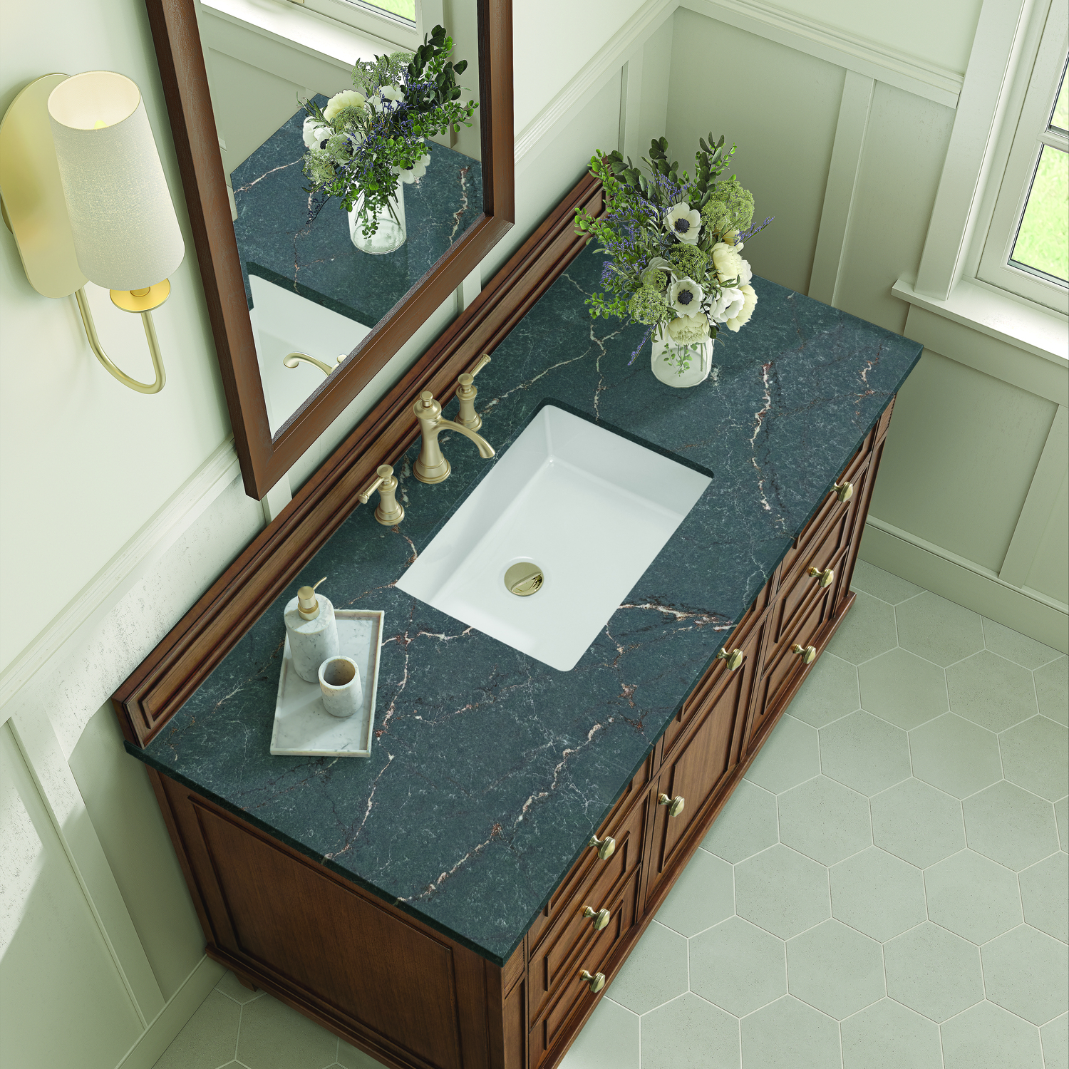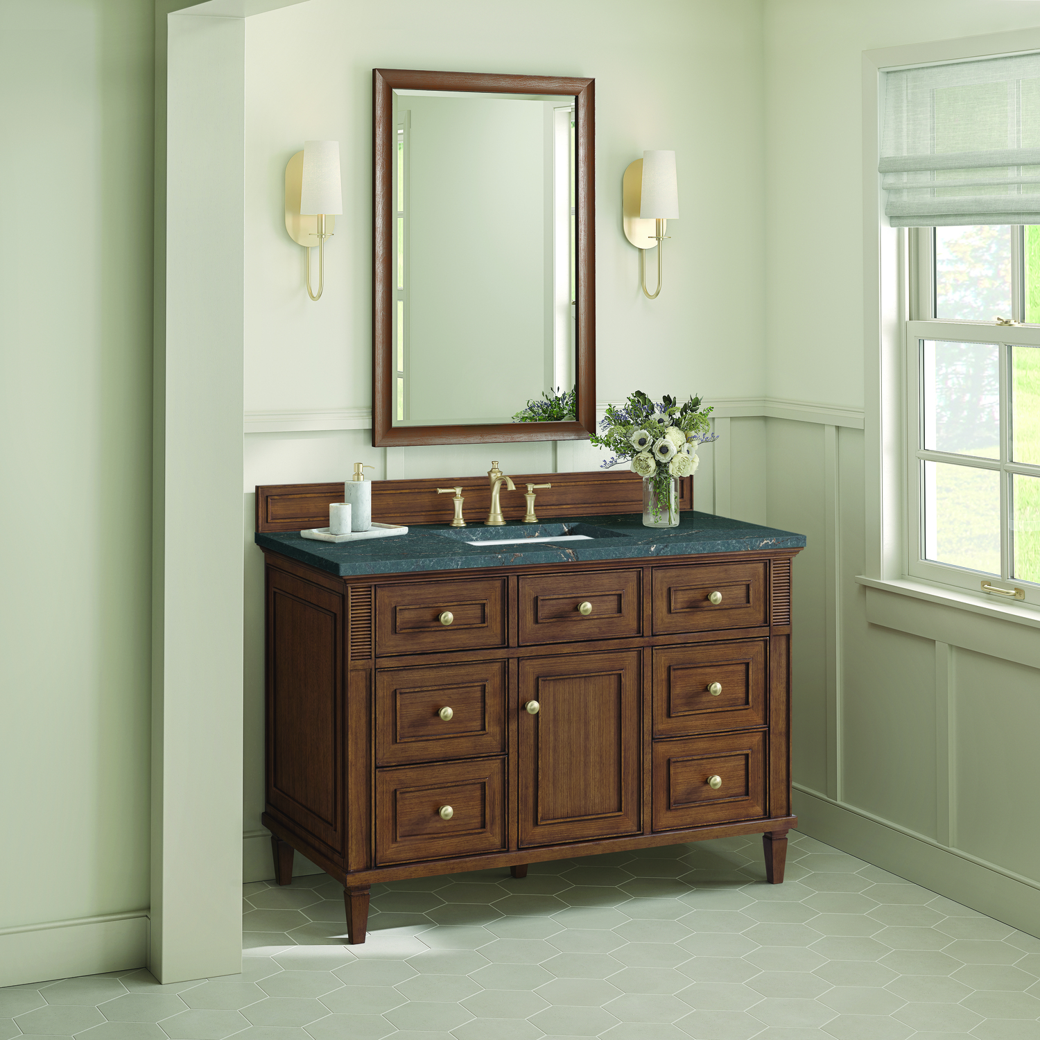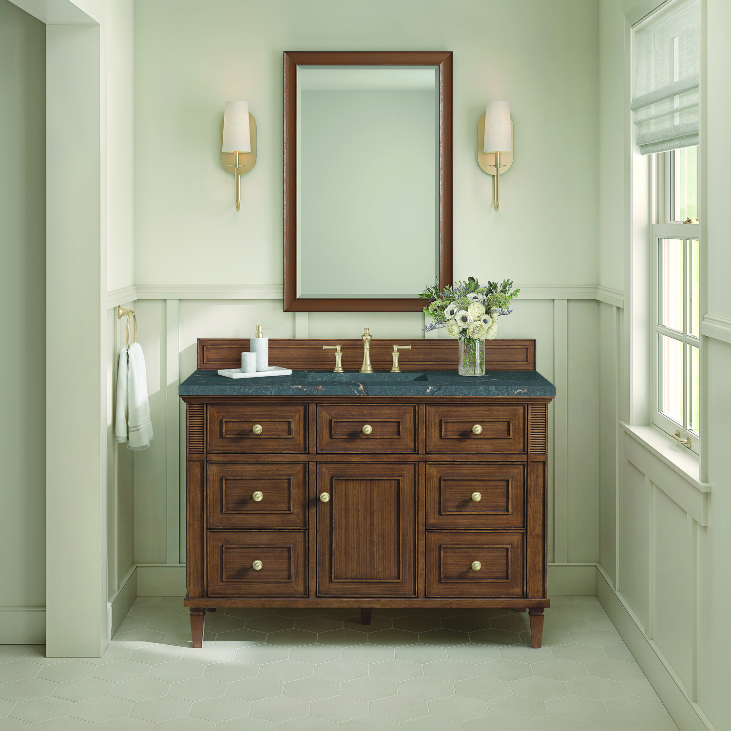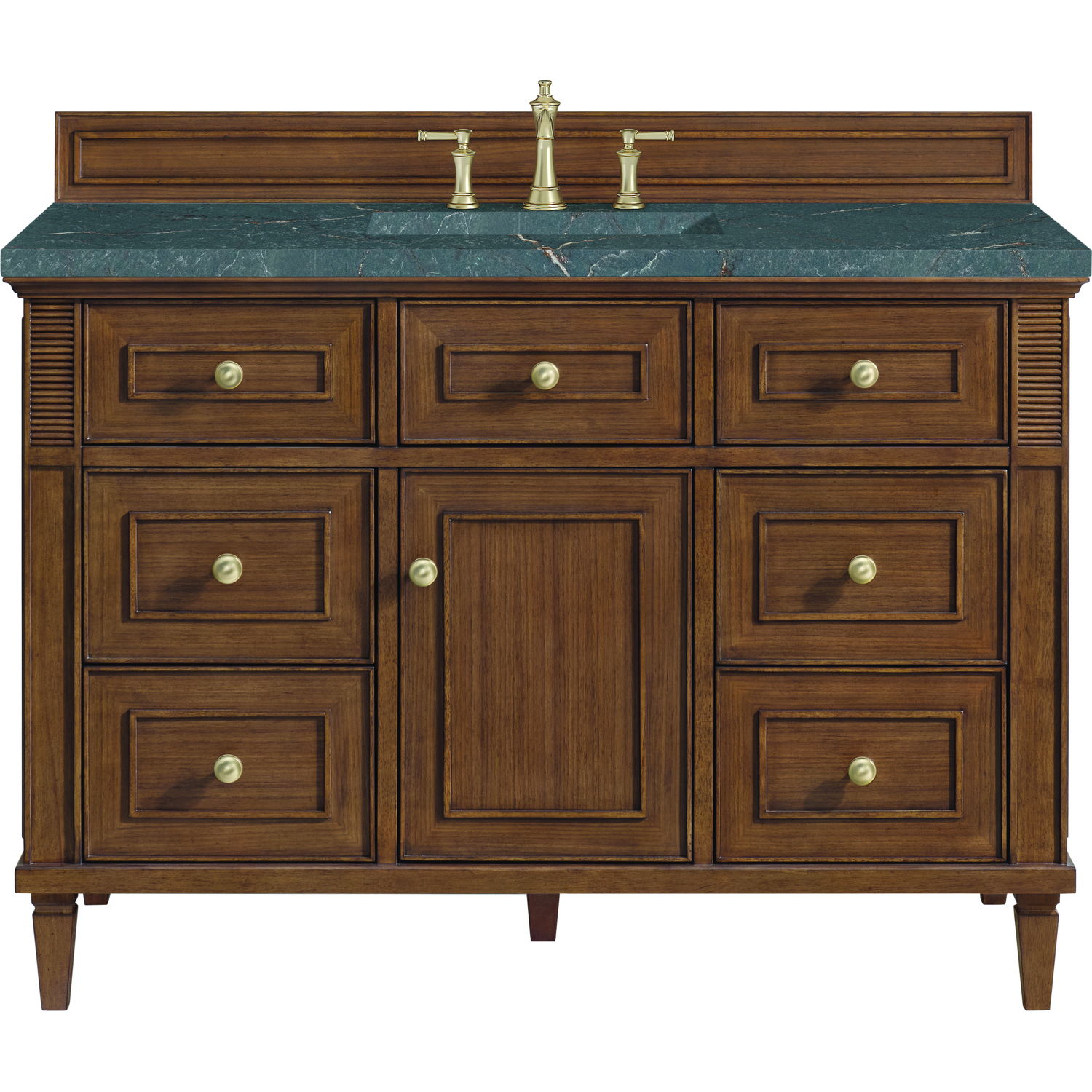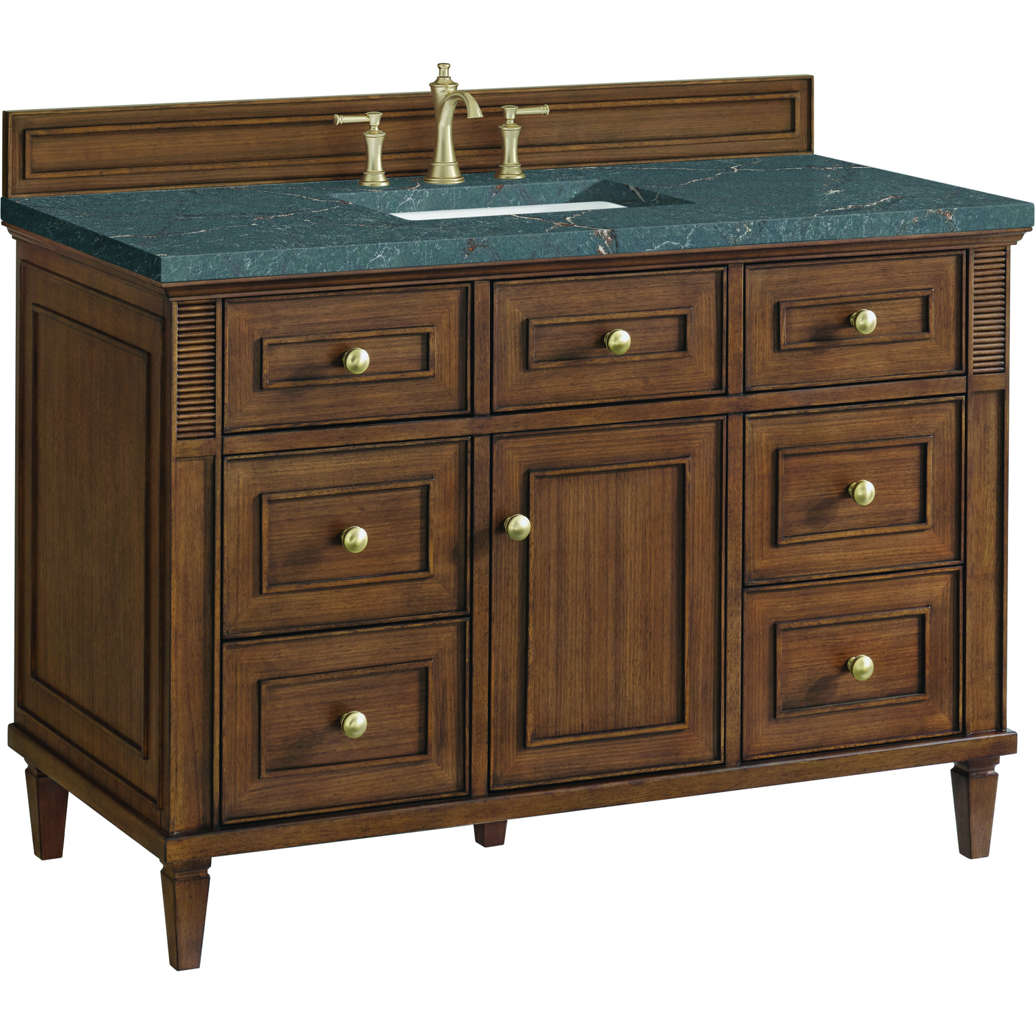 The 48" Lorelai Single Vanity celebrates timeless form and exquisite finish details, combined with practical function. The beauty of the natural grains in the walnut veneer is accented by reeded details, and clean, raised picture frame molding. The decorative, coin-edge knobs in Champagne Brass provide the perfect complement to the Mid-Century Walnut finish. This single-door cabinet opens to a spacious interior with a single shelf and a convenient USB/Electric power outlet. Six drawers plus one tip-out drawer offer additional storage space. The finish and hardware accents are enhanced by the Parisien Blue Silestone top, offering a deep bluish hue with broad and intricate neutral veins highlighted by fine coppery accents.Vanity set includes a 3cm eased edge Parisien Blue Silestone top, which includes one white porcelain rectangular undermount sink that ships separately, as well as mounting brackets for easy installation. The top is pre-drilled for an 8" widespread faucet.Solid wood frame and Walnut veneers over plywood panels and natural walnut veneer and sealed with our premium moisture and UV resistant coatingsOne 120-volt UL rated electric outlet with USB ports and bamboo organizer includedOne tip-out drawer, six drawers, and one door that opens to an interior shelfRound, coin-edge hardware in a Champagne Brass finishDrawer boxes feature English Dovetail joinery, premium undermount soft-close glides, and brushed aluminum laminate drawer liners for easy cleaningDoor features adjustable soft-close door hingesExquisitely crafted, the Lorelai collection is a testament to timeless, versatile design. With reeded accents and clean, raised picture frame details, each piece in this collection effortlessly adds visual interest to your space. The subtle elegance of coin edge knobs and tapered legs enhances the overall aesthetic, while the choice of five versatile finishes and four sizes ensures an perfect match for any bathroom style.1 year warranty against manufacturer's defects. We will repair or replace any defective product, if the product is defective in material or workmanship at our discretion. No warranty is expressed or implied regarding damages resulting from consumer misuse.