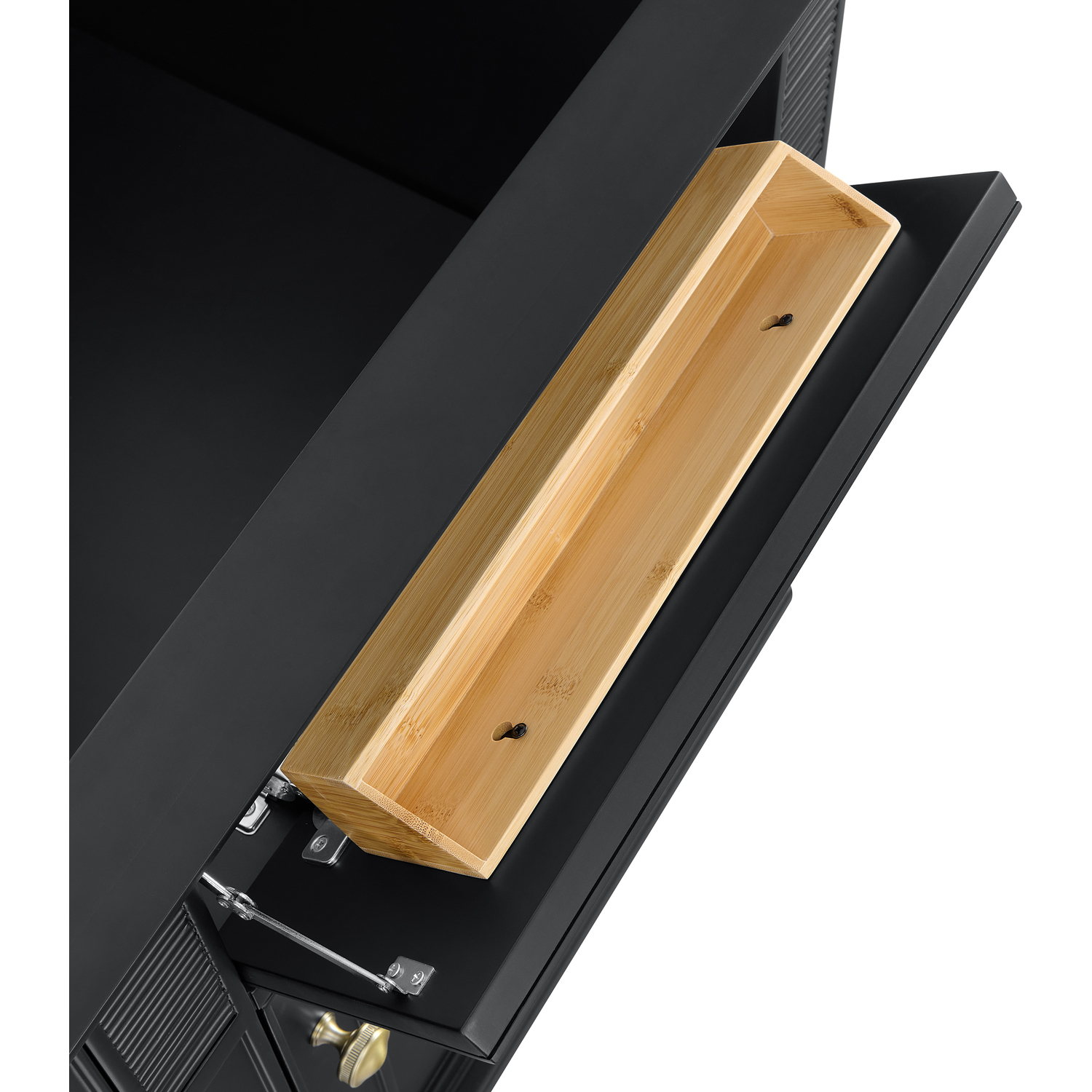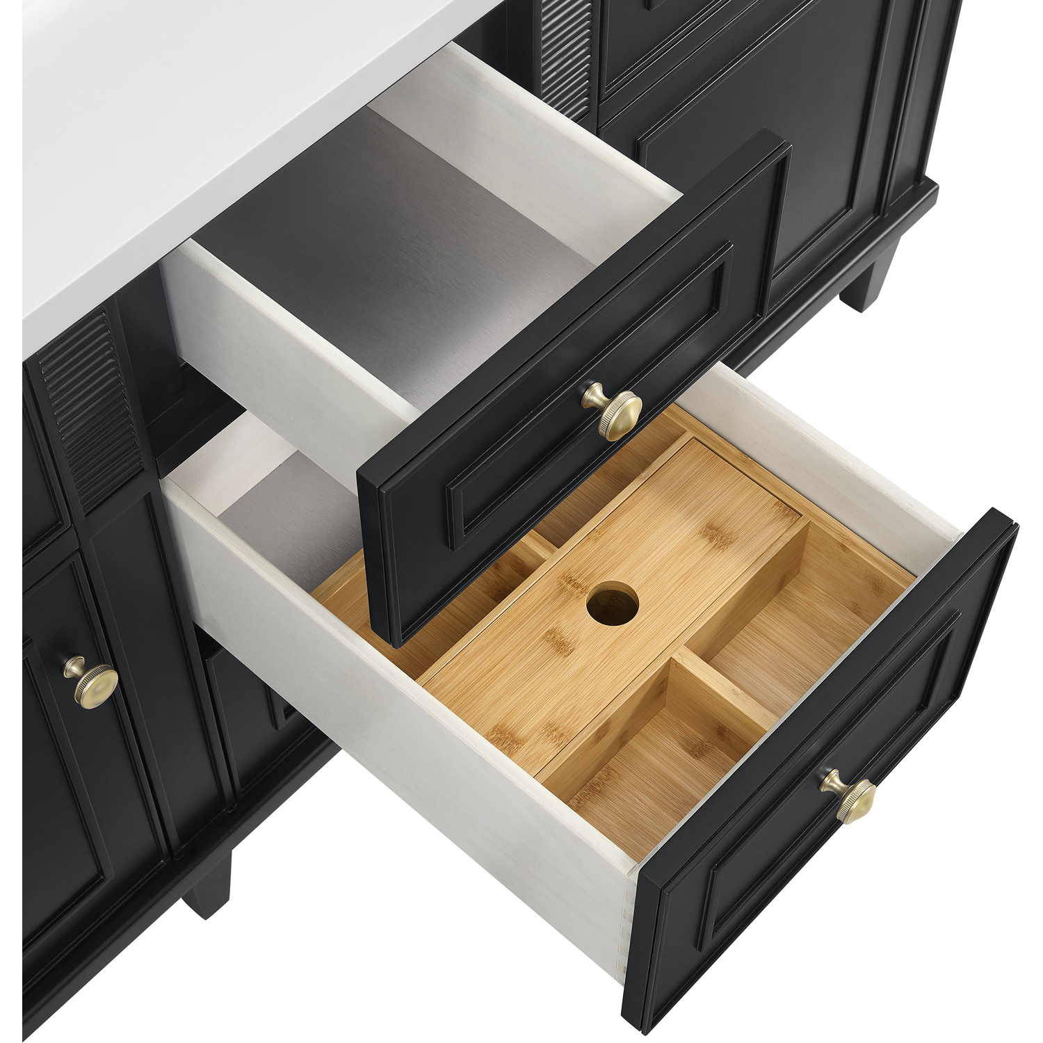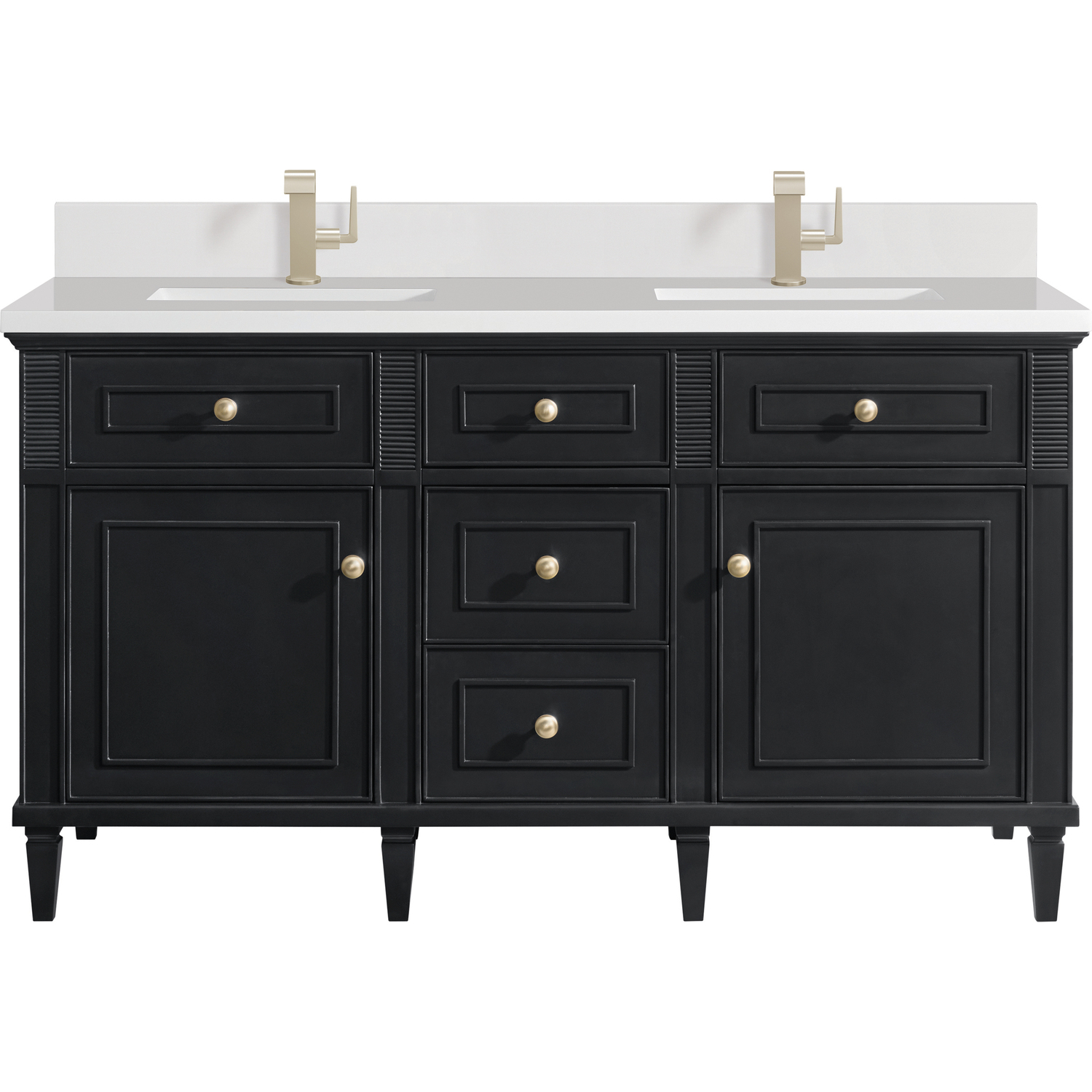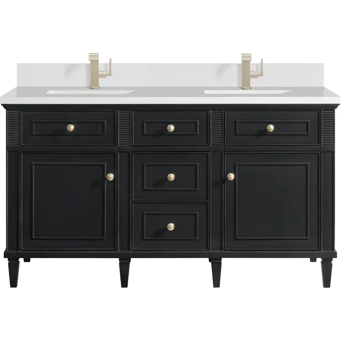 The 60" Lorelai Double Vanity celebrates timeless form and exquisite finish details, combined with practical function. The rich Black Onyx finish is accented by coin-edge knobs in Champagne Brass which provides an sophisticated contrast. Reeded details, and clean, and raised picture frame molding lend visual interest. This two-door cabinet opens to a spacious interior with shelves and convenient USB/Electric power outlets. Three traditional drawers and two tip-outs offer additional storage space. With the addition of a classic White Zeus Silestone top with backsplash and undermount sink, this vanity is a seamless integration of modern design and functionality.Vanity set includes a 3cm eased edge White Zeus Silestone top with matching backsplash, two white porcelain rectangular sinks and mounting brackets for easy installation. Top is pre-drilled for two single hole faucets. Faucets not included.Solid wood frame with plywood panels and sealed with our premium moisture and UV resistant coatingsTwo 120-volt UL rated electric outlets with USB ports and bamboo organizer includedTwo tip-out drawers, three drawers, and two doors that open to interior shelvingRound, coin-edge hardware in a Champagne Brass finishDrawer boxes feature English Dovetail joinery, premium undermount soft-close glides, and brushed aluminum laminate drawer liners for easy cleaningDoors feature adjustable soft-close door hingesMatching White Zeus 3cm Silestone backsplash included.Faucets sold separatelyExquisitely crafted, the Lorelai collection is a testament to timeless, versatile design. With reeded accents and clean, raised picture frame details, each piece in this collection effortlessly adds visual interest to your space. The subtle elegance of coin edge knobs and tapered legs enhances the overall aesthetic, while the choice of five versatile finishes and four sizes ensures an perfect match for any bathroom style.1 year warranty against manufacturer's defects. We will repair or replace any defective product, if the product is defective in material or workmanship at our discretion. No warranty is expressed or implied regarding damages resulting from consumer misuse.