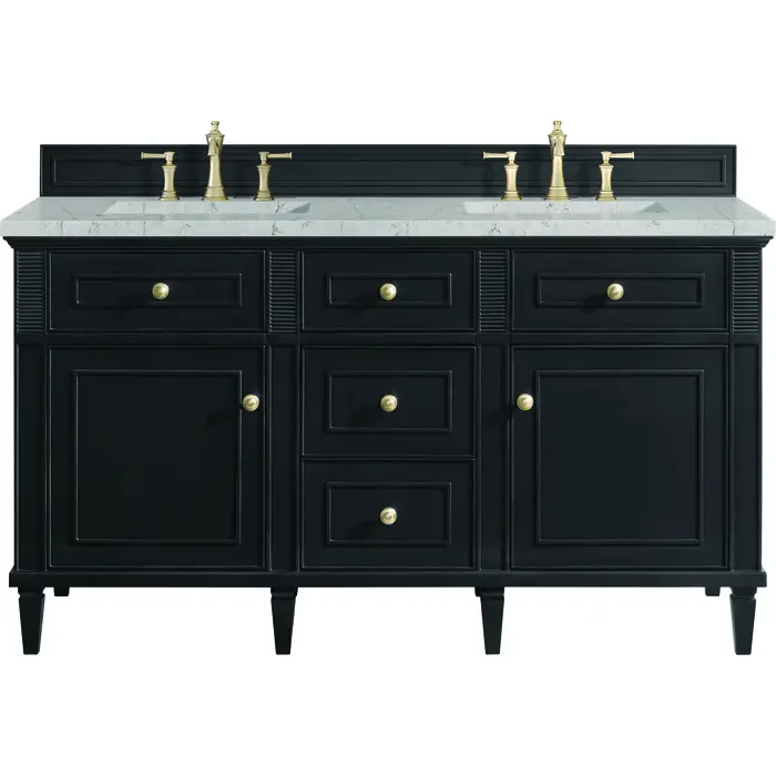 The 60" Lorelai Double Vanity celebrates timeless form and exquisite finish details, combined with practical function. The rich Black Onyx finish is accented by coin-edge knobs in Champagne Brass which provides an sophisticated contrast. Reeded details, and clean, and raised picture frame molding lend visual interest. This two-door cabinet opens to a spacious interior with shelves and convenient USB/Electric power outlets. Three traditional drawers and two tip-outs offer additional storage space. Completing the look is the Eternal Jasmine Pearl Silestone top by Cosentino, featuring an elegant white background with subtle marbleized swirls and dark Bleu-gray veining patterns.Vanity set includes a 3cm eased edge Eternal Jasmine Pearl Silestone top, two white porcelain rectangular sinks and mounting brackets for easy installation. Top is pre-drilled for two 8" widespread faucets. Faucets not included.Solid wood frame with plywood panels and sealed with our premium moisture and UV resistant coatingsTwo 120-volt UL rated electric outlets with USB ports and bamboo organizer includedTwo tip-out drawers, three drawers, and two doors that open to interior shelvingRound, coin-edge hardware in a Champagne Brass finishDrawer boxes feature English Dovetail joinery, premium undermount soft-close glides, and brushed aluminum laminate drawer liners for easy cleaningDoors feature adjustable soft-close door hingesExquisitely crafted, the Lorelai collection is a testament to timeless, versatile design. With reeded accents and clean, raised picture frame details, each piece in this collection effortlessly adds visual interest to your space. The subtle elegance of coin edge knobs and tapered legs enhances the overall aesthetic, while the choice of five versatile finishes and four sizes ensures an perfect match for any bathroom style.1 year warranty against manufacturer's defects. We will repair or replace any defective product, if the product is defective in material or workmanship at our discretion. No warranty is expressed or implied regarding damages resulting from consumer misuse.