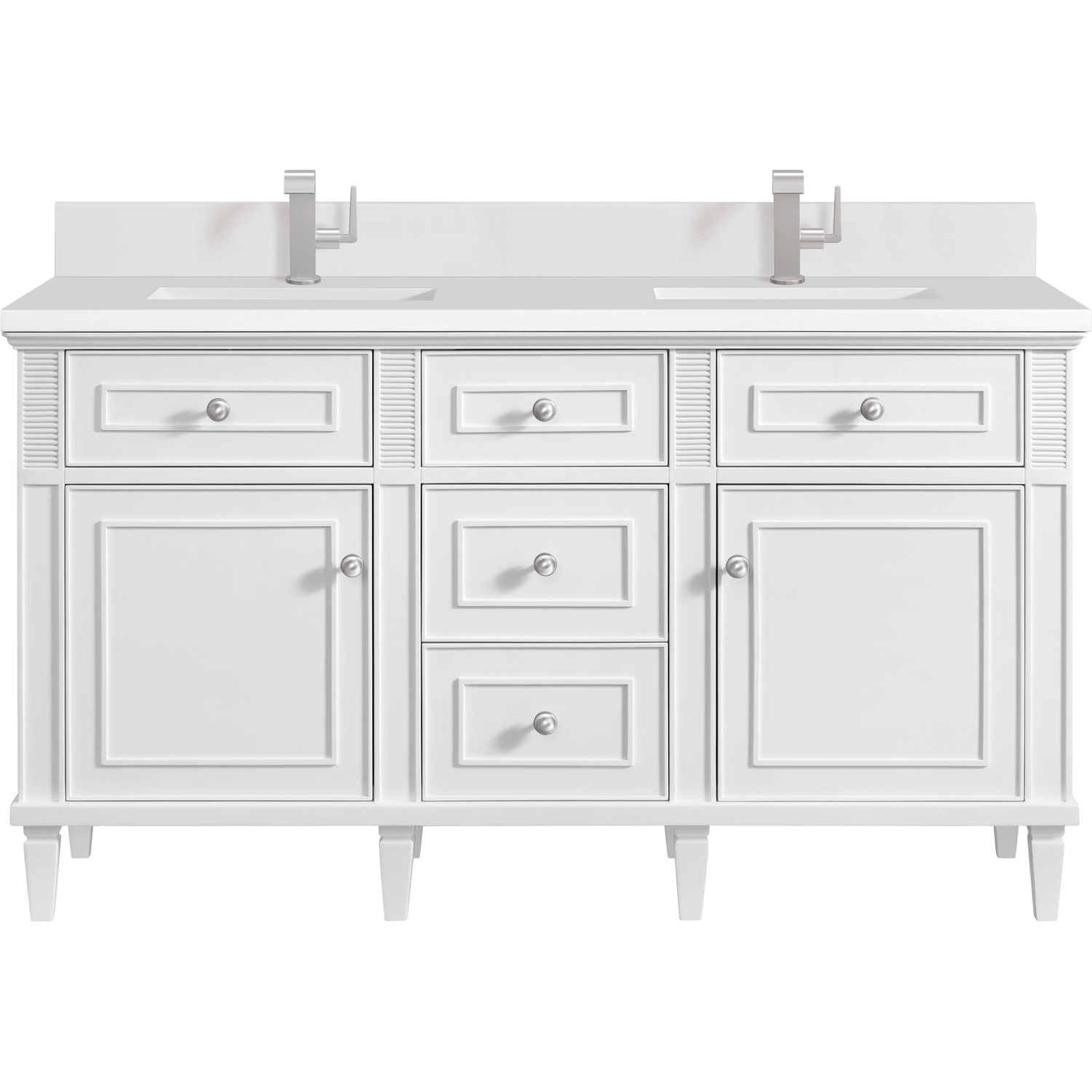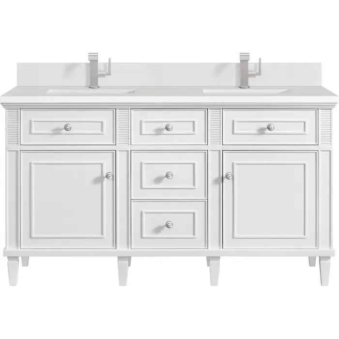 The 60" Lorelai Double Vanity celebrates timeless form and exquisite finish details, combined with practical function. The sophisticated Bright White finish is accented by reeded details, and clean, raised picture frame molding. Coin-edge knobs in Satin Nickel provide the perfect accent. This two-door cabinet opens to a spacious interior with shelves and convenient USB/Electric power outlets. Three traditional drawers and two tip-outs offer additional storage space. With the addition of a classic White Zeus Silestone top with backsplash and undermount sink, this vanity is a seamless integration of modern design and functionality.Vanity set includes a 3cm eased edge White Zeus Silestone top with matching backsplash, two white porcelain rectangular sinks and mounting brackets for easy installation. Top is pre-drilled for two single hole faucets. Faucets not included.Solid wood frame with plywood panels and sealed with our premium moisture and UV resistant coatingsTwo 120-volt UL rated electric outlets with USB ports and bamboo organizer includedTwo tip-out drawers, three drawers, and two doors that open to interior shelvingRound, coin-edge hardware in a Satin Nickel finishDrawer boxes feature English Dovetail joinery, premium undermount soft-close glides, and brushed aluminum laminate drawer liners for easy cleaningDoors feature adjustable soft-close door hingesMatching White Zeus 3cm Silestone backsplash included.Faucets sold separatelyExquisitely crafted, the Lorelai collection is a testament to timeless, versatile design. With reeded accents and clean, raised picture frame details, each piece in this collection effortlessly adds visual interest to your space. The subtle elegance of coin edge knobs and tapered legs enhances the overall aesthetic, while the choice of five versatile finishes and four sizes ensures an perfect match for any bathroom style.1 year warranty against manufacturer's defects. We will repair or replace any defective product, if the product is defective in material or workmanship at our discretion. No warranty is expressed or implied regarding damages resulting from consumer misuse.