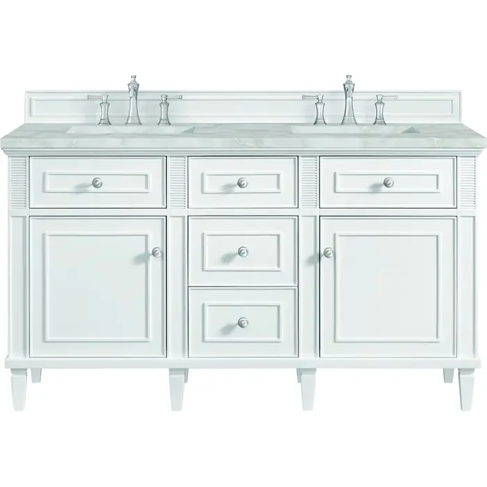 The Lorelai 60" Double Vanity by James Martin Vanities celebrates timeless design and exquisite finish details, combined with practical function. The Bright White finish is accented by coin-edge knobs in Satin Nickel which provides a sophisticated contrast. Reeded details and raised picture frame molding lend visual interest. The two-door cabinet opens to reveal a spacious interior with single shelves and a convenient USB/120V power outlet behind each door. Three standard full-extension drawers and two top-row tip-out drawers offer additional storage. The addition of a stunning Victorian Silver Silestone top with undermount sink completes the look. This unit is enabled with FreePower wireless charging; featuring a single-device charger seamlessly embedded into the countertop, indicated by a light-up halo in between the sinks. Designed for modern living, FreePower offers convenient, integrated, wireless charging when and where you need it.FreePower Wireless Charging; single-device unit in between sinksTwo-door cabinet, three full-extension drawers, and two top-row tip-out drawersDrawer boxes feature English Dovetail joinery with premium, soft-close undermount drawer slides; doors feature soft-close, adjustable door hingesCabinet features a multi-stage premium finish coat to offer UV and moisture resistanceBright White finish with Satin Nickel hardwareCountertop is pre-drilled for 8" widespread faucet(s); our 3cm eased edge countertops come with white porcelain rectangular sink(s) that ship separately and include mounting brackets for easy installationTwo integrated 120V outlets with USB portsDrawers lined with our signature brushed aluminum laminate for easy cleaningRemovable bamboo drawer organizer includedComes with optional, coordinating wood backsplash; matching stone backsplash available as add-on purchaseFreestanding VanityFaucet sold separatelyExquisitely crafted, the Lorelai Collection by James Martin Vanities is a testament to timeless, versatile design. Available in five beautiful finishes, the Lorelai features reeded accents and clean, raised picture frame details. The subtle elegance of coin edge knobs in coordinating metals and the artfully tapered legs enhance the overall aesthetic and timeless appeal.1 year warranty against manufacturer's defects. We will repair or replace any defective product, if the product is defective in material or workmanship at our discretion. No warranty is expressed or implied regarding damages resulting from consumer misuse.