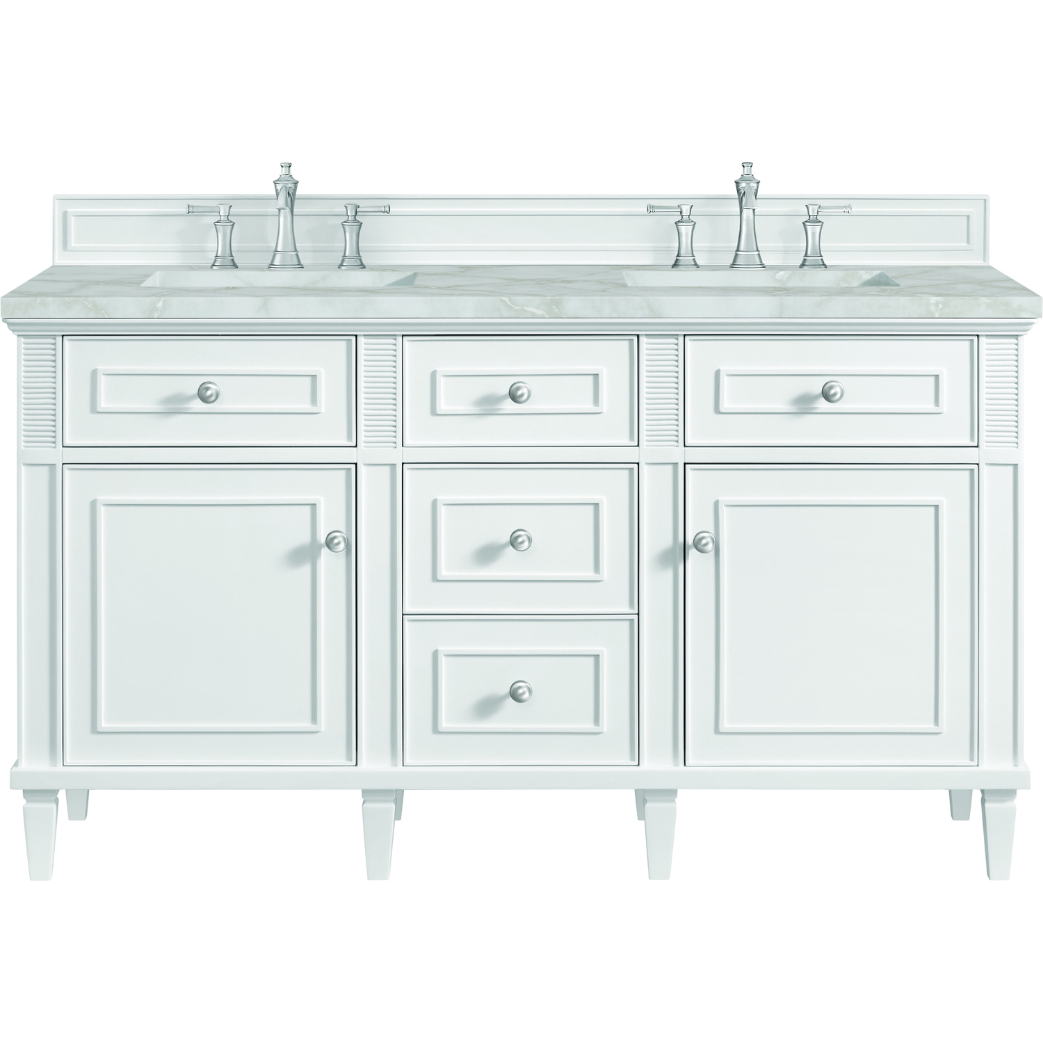 James Martin Lorelai 60 inch Double Vanity, Bright White w/ 3 CM Victorian Silver Silestone Top w/FreePower Wireless Charger, 840467810398, 424-V60D-BW-FVSL