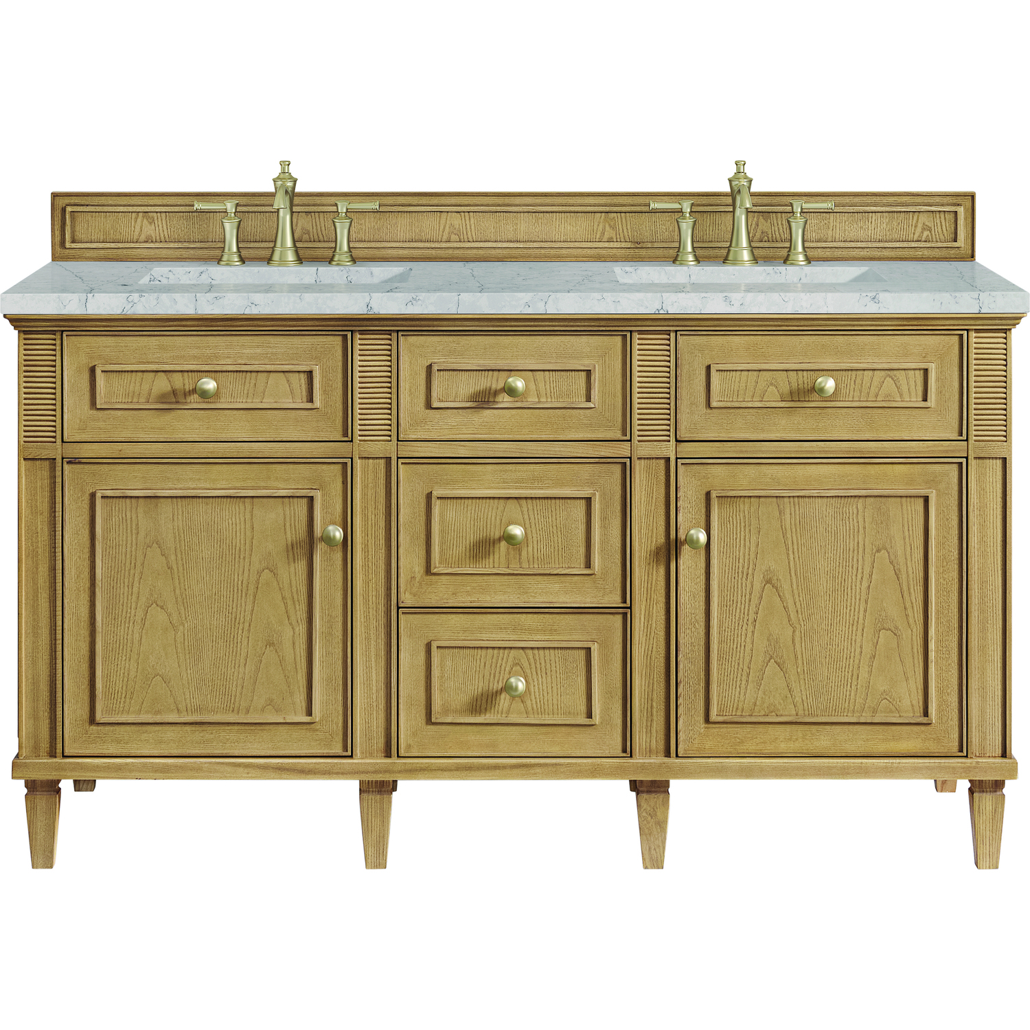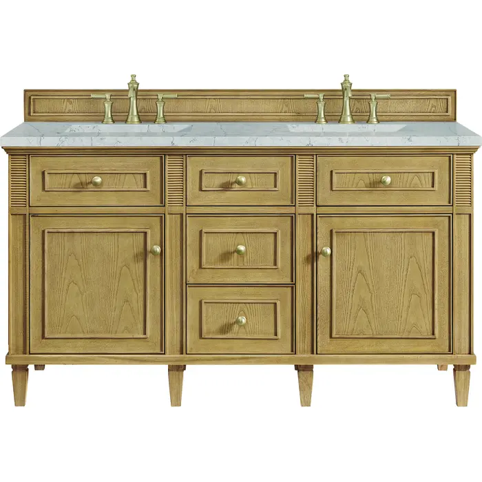The Lorelai 60" Double Vanity by James Martin Vanities celebrates timeless design and exquisite finish details, combined with practical function. The Light Natural Oak finish is accented by coin-edge knobs in Champagne Brass which provides a sophisticated contrast. Reeded details and raised picture frame molding lend visual interest. The two-door cabinet opens to reveal a spacious interior with single shelves and a convenient USB/120V power outlet behind each door. Three standard full-extension drawers and two top-row tip-out drawers offer additional storage. The addition of a beautiful Eternal Jasmine Pearl Silestone top with undermount sink completes the look. This unit is enabled with FreePower wireless charging; featuring a single-device charger seamlessly embedded into the countertop, indicated by a light-up halo in between the sinks. Designed for modern living, FreePower offers convenient, integrated, wireless charging when and where you need it.FreePower Wireless Charging; single-device unit in between sinksTwo-door cabinet, three full-extension drawers, and two top-row tip-out drawersDrawer boxes feature English Dovetail joinery with premium, soft-close undermount drawer slides; doors feature soft-close, adjustable door hingesCabinet features a multi-stage premium finish coat to offer UV and moisture resistanceLight Natural Oak finish with Champagne Brass hardwareCountertop is pre-drilled for 8" widespread faucet(s); our 3cm eased edge countertops come with white porcelain rectangular sink(s) that ship separately and include mounting brackets for easy installationTwo integrated 120V outlets with USB portsDrawers lined with our signature brushed aluminum laminate for easy cleaningRemovable bamboo drawer organizer includedComes with optional, coordinating wood backsplash; matching stone backsplash available as add-on purchaseFreestanding VanityFaucet sold separatelyExquisitely crafted, the Lorelai Collection by James Martin Vanities is a testament to timeless, versatile design. Available in five beautiful finishes, the Lorelai features reeded accents and clean, raised picture frame details. The subtle elegance of coin edge knobs in coordinating metals and the artfully tapered legs enhance the overall aesthetic and timeless appeal.1 year warranty against manufacturer's defects. We will repair or replace any defective product, if the product is defective in material or workmanship at our discretion. No warranty is expressed or implied regarding damages resulting from consumer misuse.