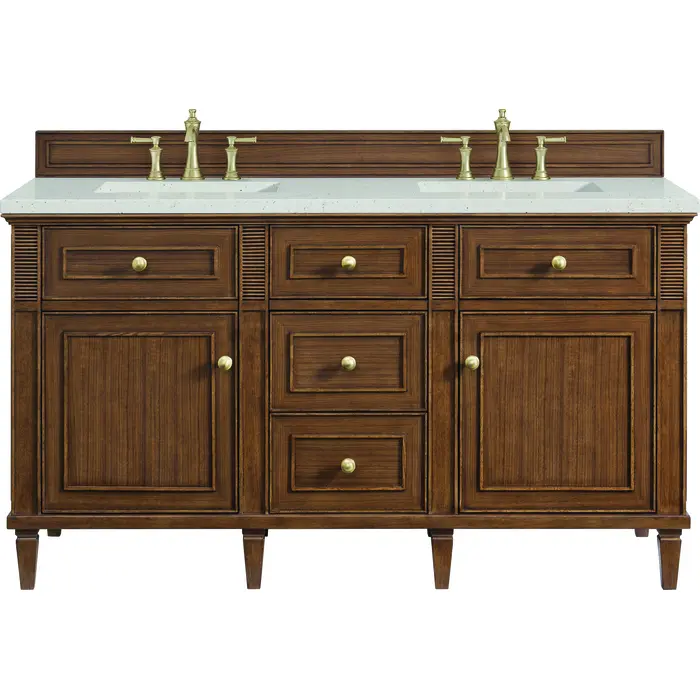 The 60" Lorelai Double Vanity celebrates timeless form and exquisite finish details, combined with practical function. The beauty of the natural grains in the walnut veneer is accented by reeded details, and clean, raised picture frame molding. The decorative, coin-edge knobs in Champagne Brass provide the perfect complement to the Mid-Century Walnut finish. This two-door cabinet opens to a spacious interior with shelves and convenient USB/Electric power outlets. Three traditional drawers and two tip-outs offer additional storage space. The Lime Delight Silestone top lends warm, textured beige tones to perfectly complement the rich finish on the vanity.Vanity set includes a 3cm eased edge Limestone Delight Silestone top with two undermount white porcelain rectangular sinks that ship uninstalled and includes mounting brackets for easy installation. Top is pre-drilled for two 8" widespread faucets. FaucetSolid wood frame and Walnut veneers over plywood panels and natural walnut veneer and sealed with our premium moisture and UV resistant coatingsTwo 120-volt UL rated electric outlets with USB ports and bamboo organizer includedTwo tip-out drawers, three drawers, and two doors that open to interior shelvingRound, coin-edge hardware in a Champagne Brass finishDrawer boxes feature English Dovetail joinery, premium undermount soft-close glides, and brushed aluminum laminate drawer liners for easy cleaningDoors feature adjustable soft-close door hingesExquisitely crafted, the Lorelai collection is a testament to timeless, versatile design. With reeded accents and clean, raised picture frame details, each piece in this collection effortlessly adds visual interest to your space. The subtle elegance of coin edge knobs and tapered legs enhances the overall aesthetic, while the choice of five versatile finishes and four sizes ensures an perfect match for any bathroom style.1 year warranty against manufacturer's defects. We will repair or replace any defective product, if the product is defective in material or workmanship at our discretion. No warranty is expressed or implied regarding damages resulting from consumer misuse.