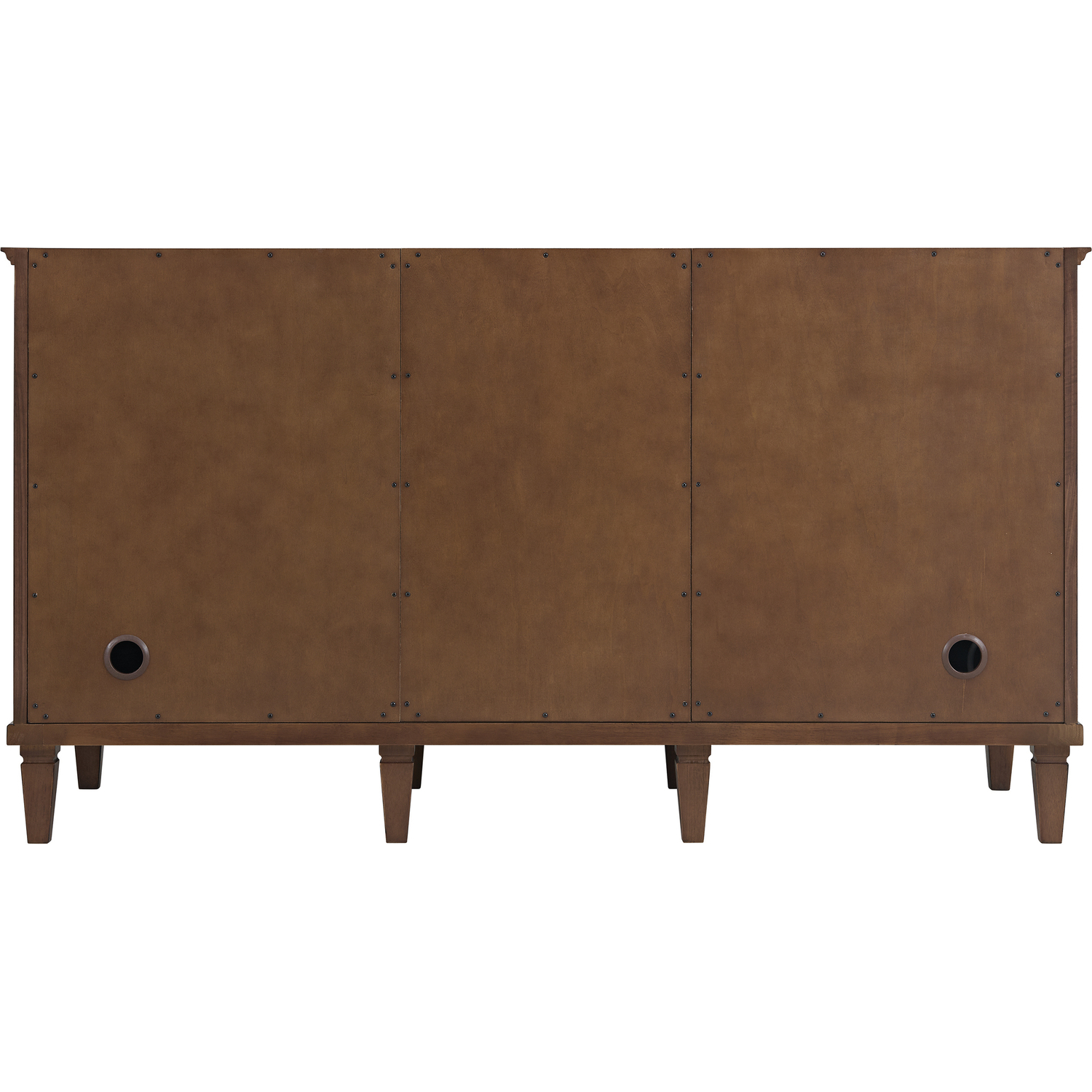 The 60" Lorelai Double Vanity celebrates timeless form and exquisite finish details, combined with practical function. The beauty of the natural grains in the walnut veneer is accented by reeded details, and clean, raised picture frame molding. The decorative, coin-edge knobs in Champagne Brass provide the perfect complement to the Mid-Century Walnut finish. This two-door cabinet opens to a spacious interior with shelves and convenient USB/Electric power outlets. Three traditional drawers and two tip-outs offer additional storage space. Choose one of our tops with undermount, rectangular sinks to perfectly complete this masterpiece.Cabinet only - for a complete look, select one of our coordinating 3cm tops with two undermount, white porcelain sinks.Solid wood frame and Walnut veneers over plywood panels and natural walnut veneer and sealed with our premium moisture and UV resistant coatingsTwo 120-volt UL rated electric outlets with USB ports and bamboo organizer includedTwo tip-out drawers, three drawers, and two doors that open to interior shelvingRound, coin-edge hardware in a Champagne Brass finishDrawer boxes feature English Dovetail joinery, premium undermount soft-close glides, and brushed aluminum laminate drawer liners for easy cleaningDoors feature adjustable soft-close door hingesExquisitely crafted, the Lorelai collection is a testament to timeless, versatile design. With reeded accents and clean, raised picture frame details, each piece in this collection effortlessly adds visual interest to your space. The subtle elegance of coin edge knobs and tapered legs enhances the overall aesthetic, while the choice of five versatile finishes and four sizes ensures an perfect match for any bathroom style.1 year warranty against manufacturer's defects. We will repair or replace any defective product, if the product is defective in material or workmanship at our discretion. No warranty is expressed or implied regarding damages resulting from consumer misuse.