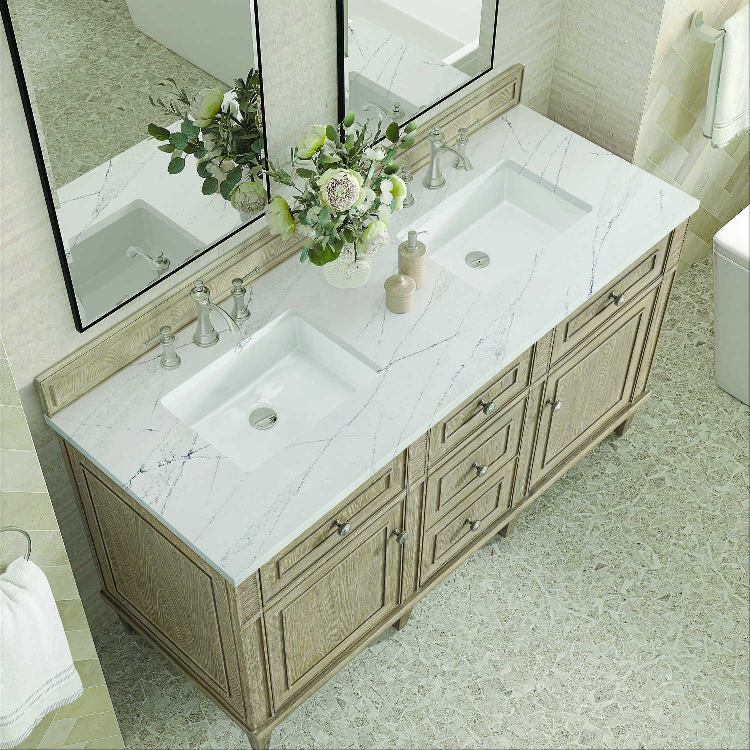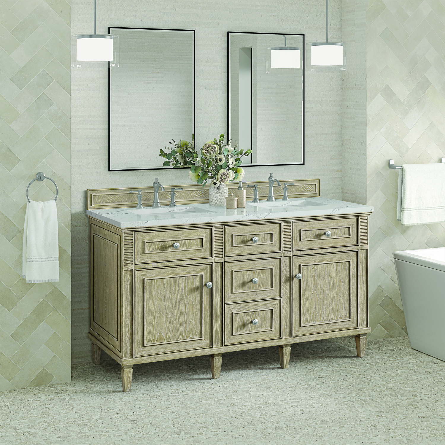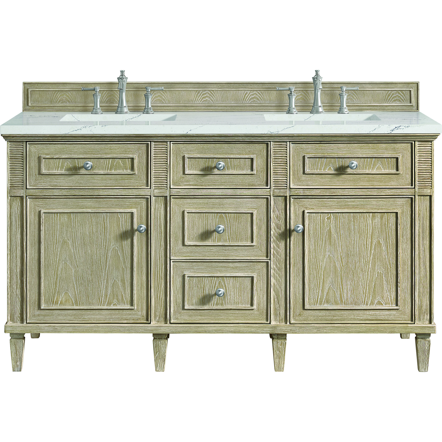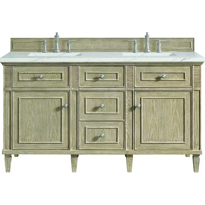 James Martin Lorelai 60 inch Double Vanity, Whitewashed Oak w/ 3 CM Ethereal Noctis Quartz Top, 840108972676, 424-V60D-WWO-3ENC