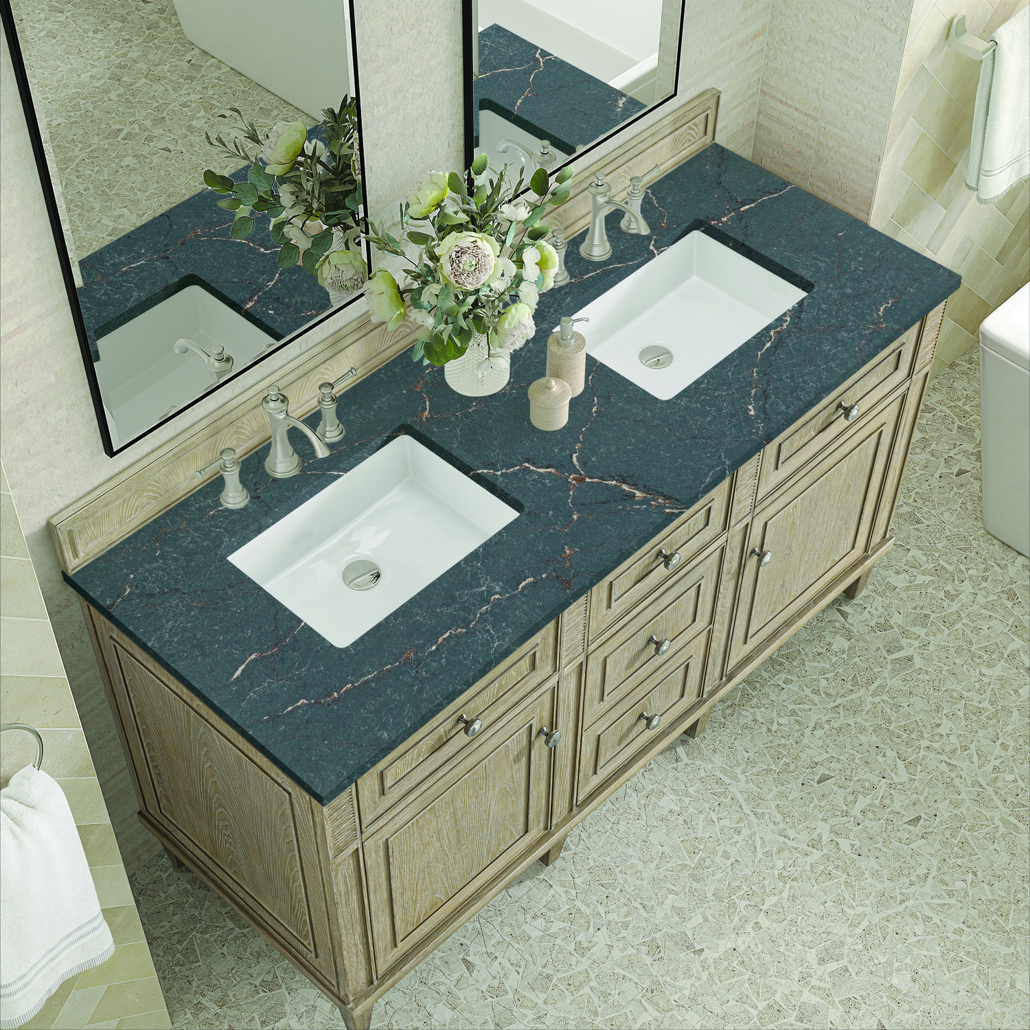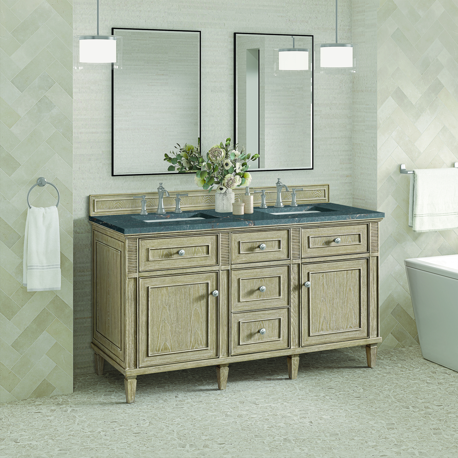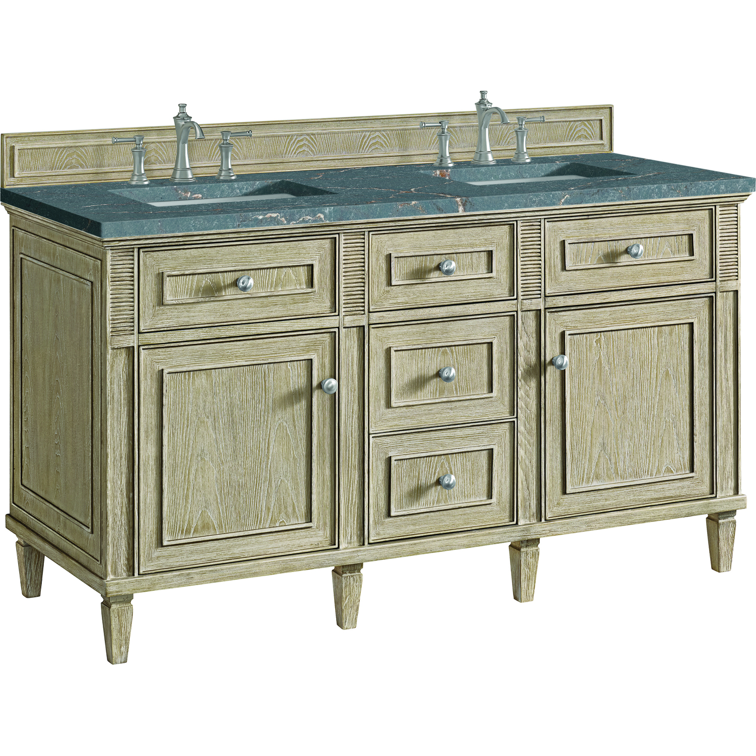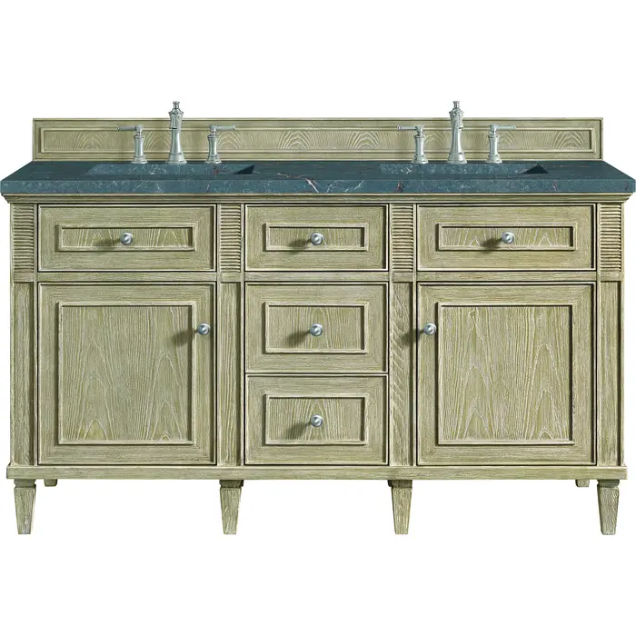 James Martin Lorelai 60 inch Double Vanity, Whitewashed Oak w/ 3 CM Parisien Bleu Quartz Top, 840108972713, 424-V60D-WWO-3PBL
