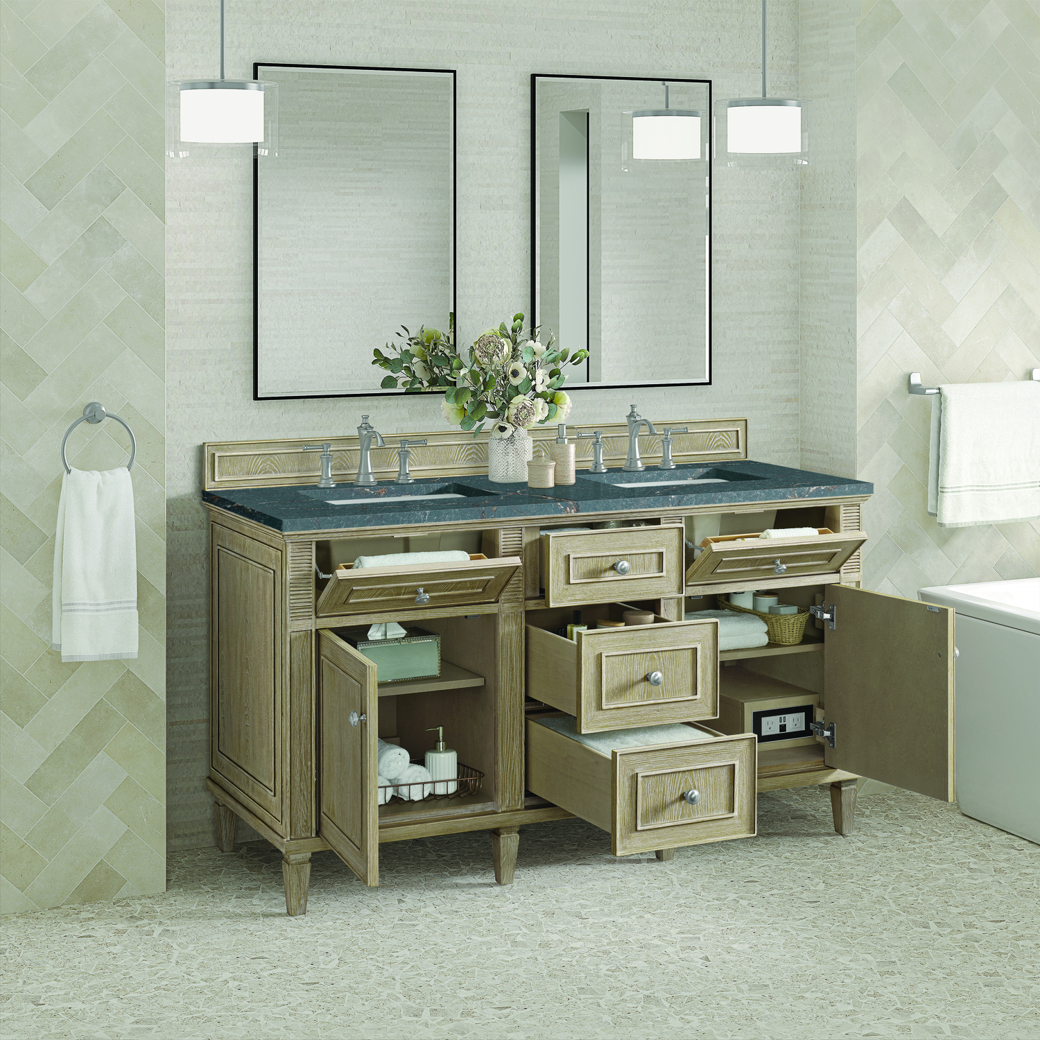The 60" Lorelai Double Vanity celebrates timeless form and exquisite finish details, combined with practical function. The Whitewashed Oak finish is accented by reeded details, and clean, raised picture frame molding. Coin-edge knobs in Satin Nickel provide the perfect accent. This two-door cabinet opens to a spacious interior with shelves and convenient USB/Electric power outlets. Three traditional drawers and two tip-outs offer additional storage space. The finish and hardware accents are enhanced by the Parisien Blue Silestone top, offering a deep bluish hue with broad and intricate neutral veins highlighted by fine coppery accents.Vanity set includes a 3cm eased edge Parisien Blue Silestone top, two white porcelain rectangular sinks and mounting brackets for easy installation. Top is pre-drilled for two 8" widespread faucets. Faucets not included.Solid Ash wood frame and Ash wood veneers over plywood panels and sealed with our premium moisture and UV resistant coatingsTwo 120-volt UL rated electric outlets with USB ports and bamboo organizer includedTwo tip-out drawers, three drawers, and two doors that open to interior shelvingRound, coin-edge hardware in a Satin Nickel finishDrawer boxes feature English Dovetail joinery, premium undermount soft-close glides, and brushed aluminum laminate drawer liners for easy cleaningDoors feature adjustable soft-close door hingesExquisitely crafted, the Lorelai collection is a testament to timeless, versatile design. With reeded accents and clean, raised picture frame details, each piece in this collection effortlessly adds visual interest to your space. The subtle elegance of coin edge knobs and tapered legs enhances the overall aesthetic, while the choice of five versatile finishes and four sizes ensures an perfect match for any bathroom style.1 year warranty against manufacturer's defects. We will repair or replace any defective product, if the product is defective in material or workmanship at our discretion. No warranty is expressed or implied regarding damages resulting from consumer misuse.