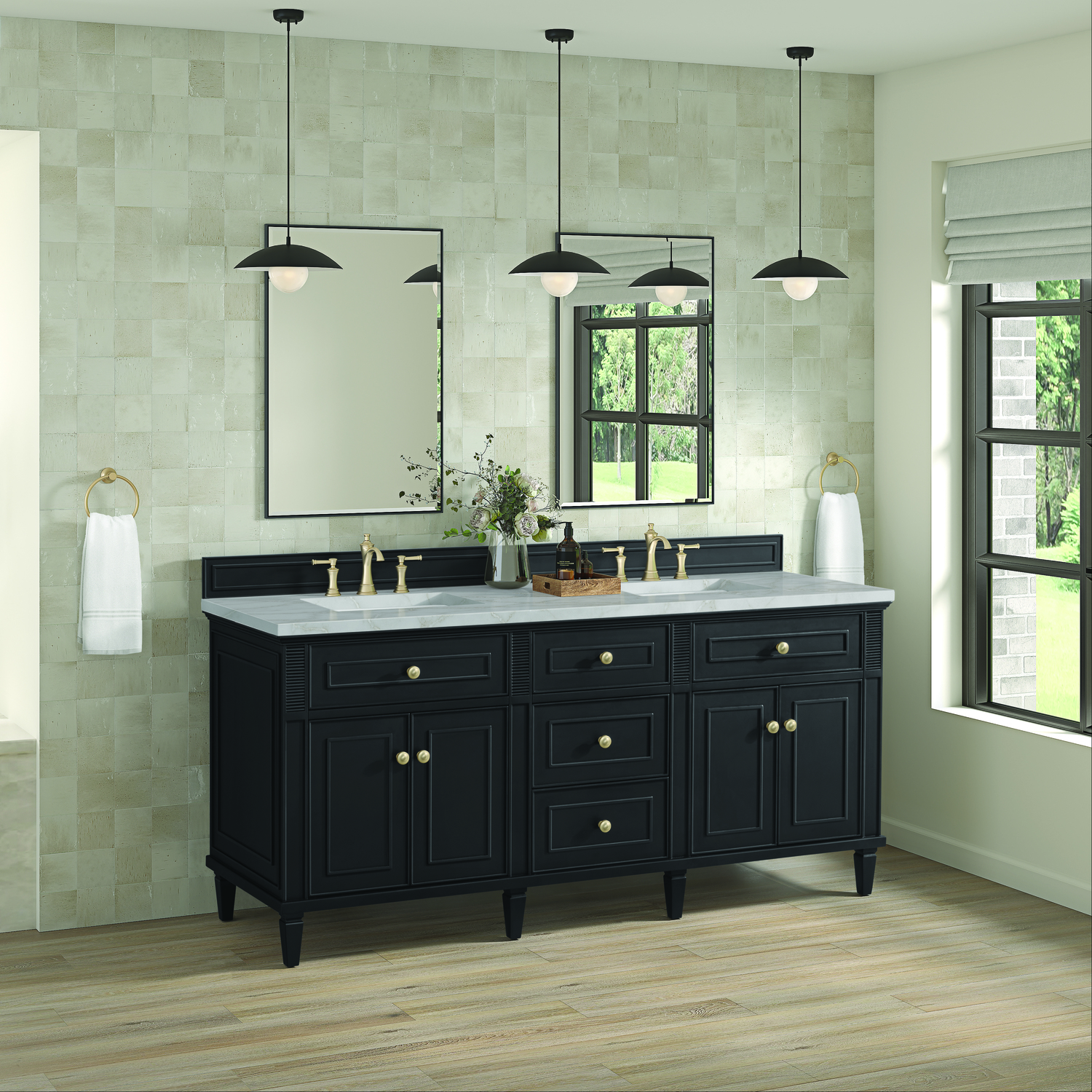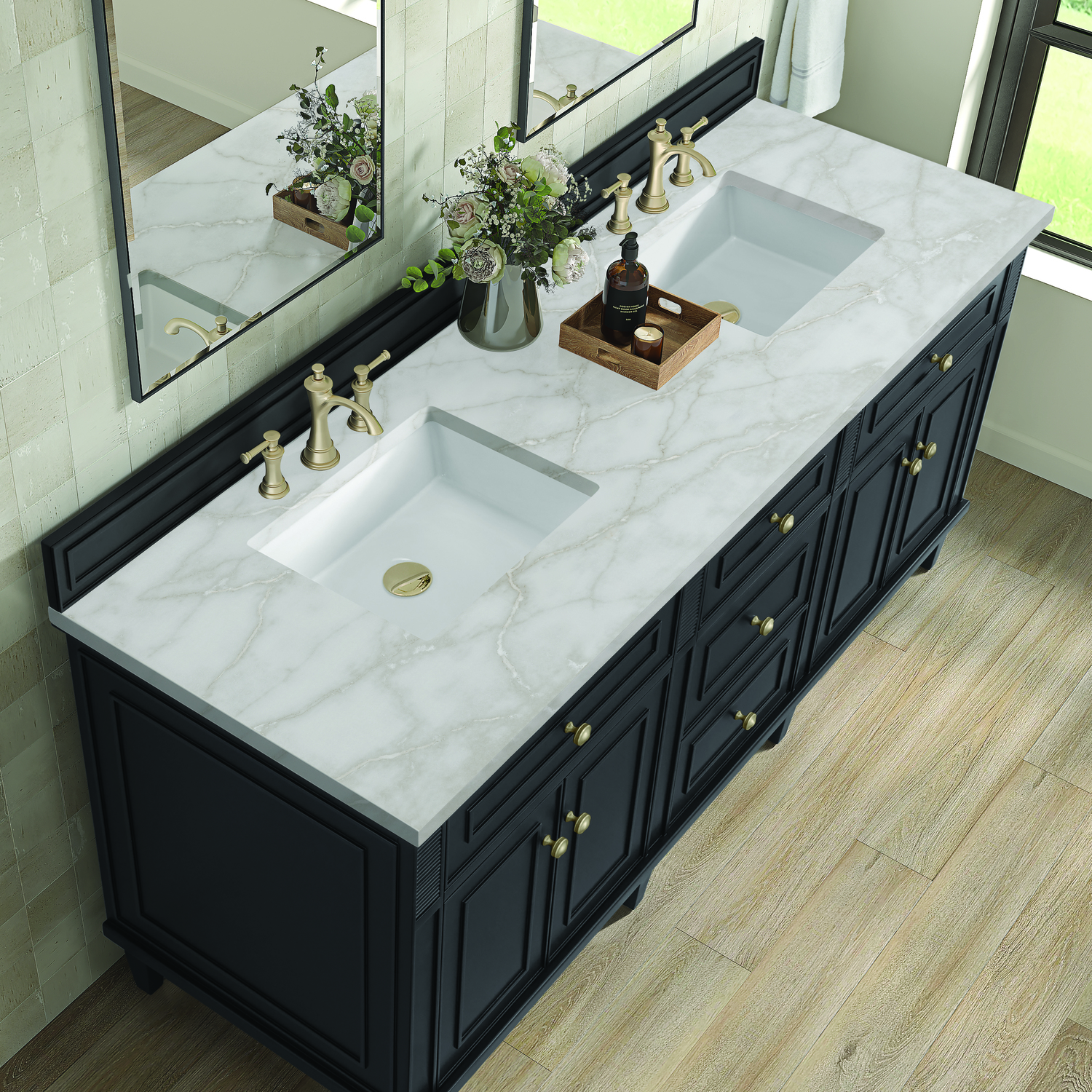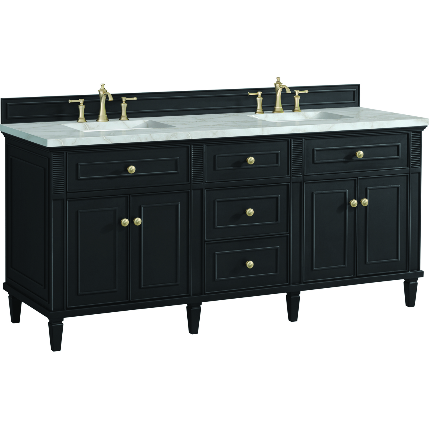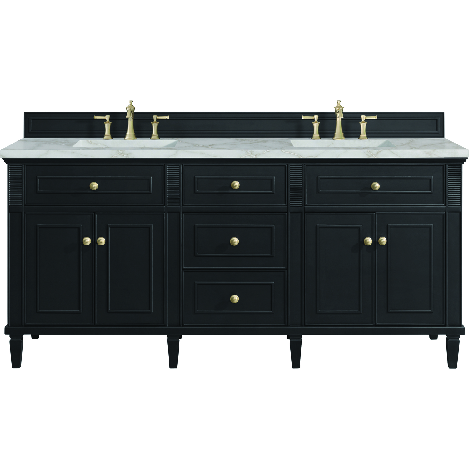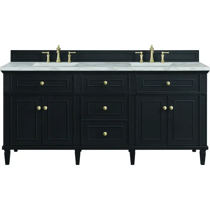 The 72” Lorelai Double Vanity celebrates timeless form and exquisite finish details, combined with practical function. The rich Black Onyx finish is accented by coin-edge knobs in Champagne Brass which provides an sophisticated contrast. Reeded details, and clean, and raised picture frame molding lend visual interest. This four-door cabinet opens to spacious interior with shelves and convenient USB/Electric power outlets. Three traditional drawers and two tip-outs offer additional storage space. The finish is accented by the neutral background of the Victorian Silver Silestone top, boasting champagne metallic accents which seamlessly complete the look.Vanity set includes a 3cm eased edge Victorian Silver Silestone top, two white porcelain rectangular sinks and mounting brackets for easy installation. Top is pre-drilled for two 8" widespread faucets. Faucets not included.Solid wood frame with plywood panels and sealed with our premium moisture and UV resistant coatingsTwo 120-volt UL rated electric outlets with USB ports and bamboo organizer includedTwo tip-out drawers, three drawers, and four doors that open to interior shelvingRound, coin-edge hardware in a Champagne Brass finishDrawer boxes feature English Dovetail joinery, premium undermount soft-close glides, and brushed aluminum laminate drawer liners for easy cleaningDoors feature adjustable soft-close door hingesExquisitely crafted, the Lorelai collection is a testament to timeless, versatile design. With reeded accents and clean, raised picture frame details, each piece in this collection effortlessly adds visual interest to your space. The subtle elegance of coin edge knobs and tapered legs enhances the overall aesthetic, while the choice of five versatile finishes and four sizes ensures an perfect match for any bathroom style.1 year warranty against manufacturer's defects. We will repair or replace any defective product, if the product is defective in material or workmanship at our discretion. No warranty is expressed or implied regarding damages resulting from consumer misuse.