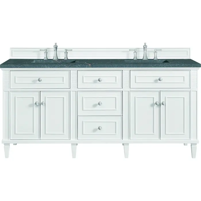 The Lorelai 72" Double Vanity by James Martin Vanities celebrates timeless design and exquisite finish details, combined with practical function. The Bright White finish is accented by coin-edge knobs in Satin Nickel which provides a sophisticated contrast. Reeded details and raised picture frame molding lend visual interest. The four-door cabinet opens to reveal a spacious interior with single shelves and a convenient USB/120V power outlet behind each set of doors. Three standard full-extension drawers and two top-row tip-out drawers offer additional storage. The addition of a gorgeous Parisien Bleu Silestone top with undermount sink completes the look. This unit is enabled with FreePower wireless charging; featuring a two-device charger seamlessly embedded into the countertop, indicated by a light-up halo in between the sinks. Designed for modern living, FreePower offers convenient, integrated, wireless charging when and where you need it.FreePower Wireless Charging; two-device unit in between sinksFour doors, three full-extension drawers, and two top-row tip-out drawersDrawer boxes feature English Dovetail joinery with premium, soft-close undermount drawer slides; doors feature soft-close, adjustable door hingesCabinet features a multi-stage premium finish coat to offer UV and moisture resistanceBright White finish with Satin Nickel hardwareCountertop is pre-drilled for 8" widespread faucet(s); our 3cm eased edge countertops come with white porcelain rectangular sink(s) that ship separately and include mounting brackets for easy installationTwo integrated 120V outlets with USB portsDrawers lined with our signature brushed aluminum laminate for easy cleaningRemovable bamboo drawer organizer includedComes with optional, coordinating wood backsplash; matching stone backsplash available as add-on purchaseFreestanding VanityFaucet sold separatelyExquisitely crafted, the Lorelai Collection by James Martin Vanities is a testament to timeless, versatile design. Available in five beautiful finishes, the Lorelai features reeded accents and clean, raised picture frame details. The subtle elegance of coin edge knobs in coordinating metals and the artfully tapered legs enhance the overall aesthetic and timeless appeal.1 year warranty against manufacturer's defects. We will repair or replace any defective product, if the product is defective in material or workmanship at our discretion. No warranty is expressed or implied regarding damages resulting from consumer misuse.