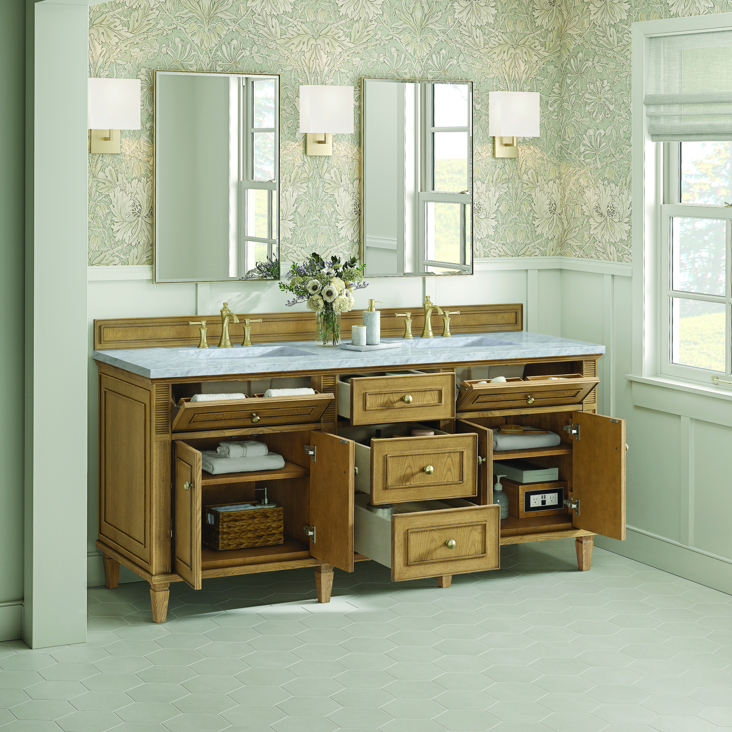 The 72” Lorelai Double Vanity celebrates timeless form and exquisite finish details, combined with practical function. The beauty of the natural grains in the walnut veneer is accented by reeded details, and clean, raised picture frame molding. The decorative, coin-edge knobs in Champagne Brass provide the perfect accent to the Light Natura Oak finish. This four-door cabinet opens to spacious interior with shelves and convenient USB/Electric power outlets. Three traditional drawers and two tip-outs offer additional storage space. Completing this vanity, are the treasured, neutral tones and textures of the Carrara marble vanity top display a white background with delicate grey veining.Vanity set includes a 3cm eased edge Carrara Marble top, two white porcelain rectangular sinks and mounting brackets for easy installation. Top is pre-drilled for two 8" widespread faucets. Faucets not included.Solid Ash wood frame and Ash wood veneers over plywood panels and sealed with our premium moisture and UV resistant coatingsTwo 120-volt UL rated electric outlets with USB ports and bamboo organizer includedTwo tip-out drawers, three drawers, and four doors that open to interior shelvingRound, coin-edge hardware in a Champagne Brass finishDrawer boxes feature English Dovetail joinery, premium undermount soft-close glides, and brushed aluminum laminate drawer liners for easy cleaningDoors feature adjustable soft-close door hingesExquisitely crafted, the Lorelai collection is a testament to timeless, versatile design. With reeded accents and clean, raised picture frame details, each piece in this collection effortlessly adds visual interest to your space. The subtle elegance of coin edge knobs and tapered legs enhances the overall aesthetic, while the choice of five versatile finishes and four sizes ensures an perfect match for any bathroom style.1 year warranty against manufacturer's defects. We will repair or replace any defective product, if the product is defective in material or workmanship at our discretion. No warranty is expressed or implied regarding damages resulting from consumer misuse.