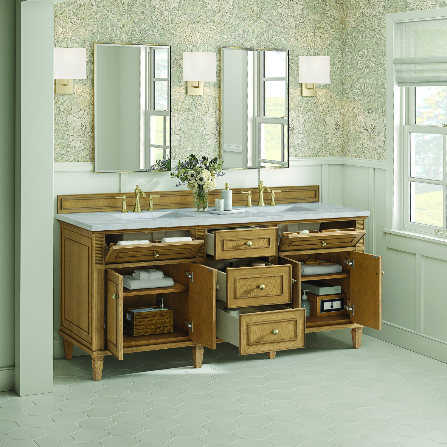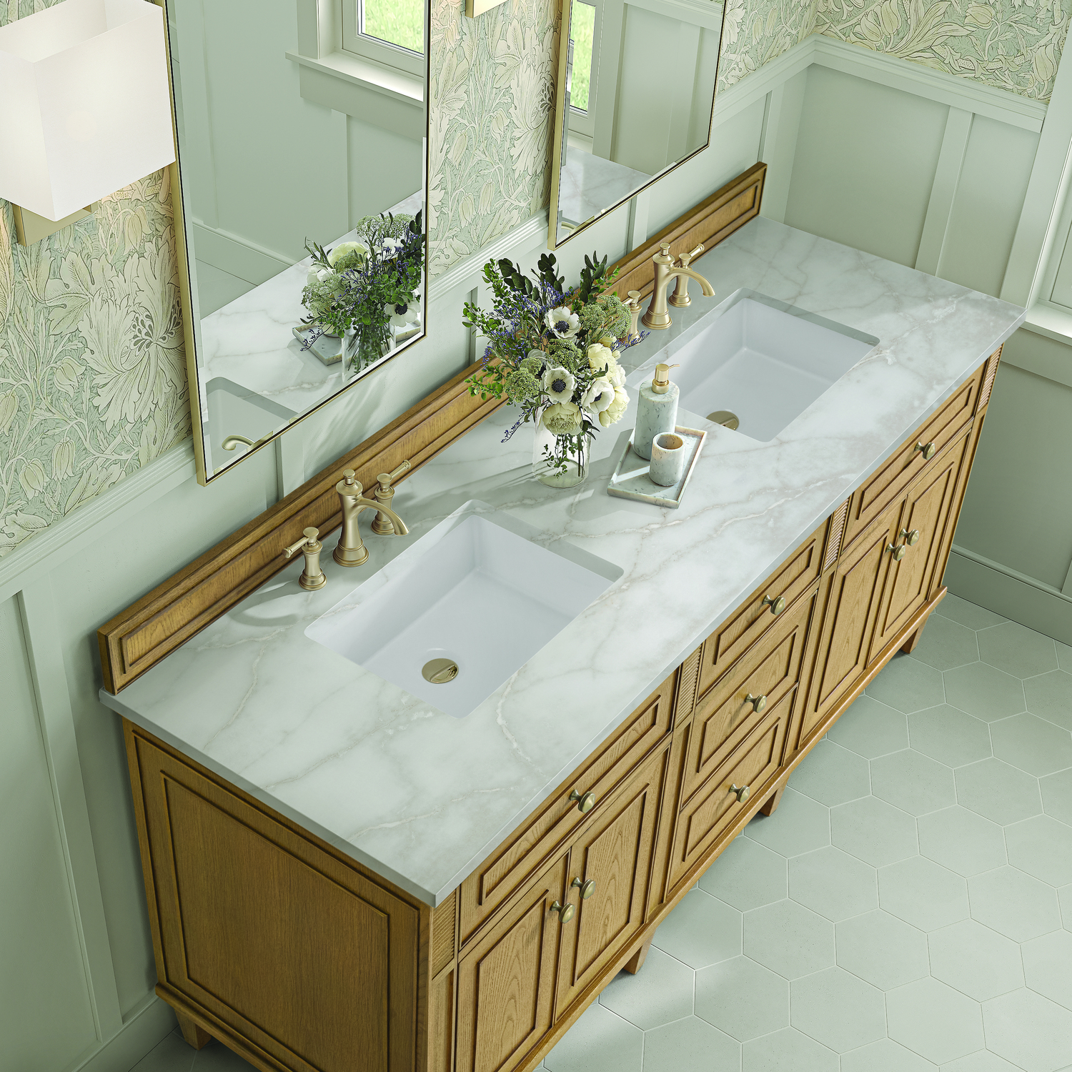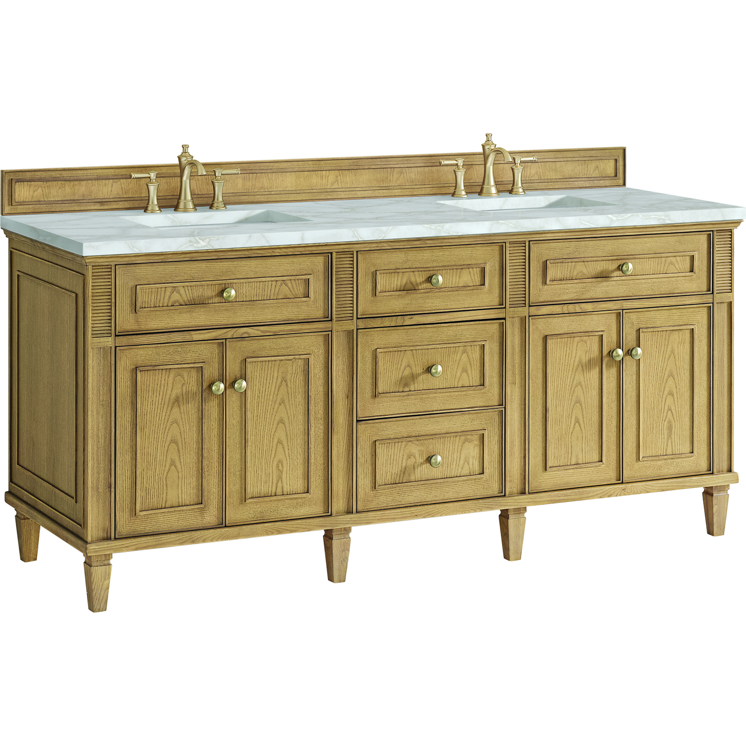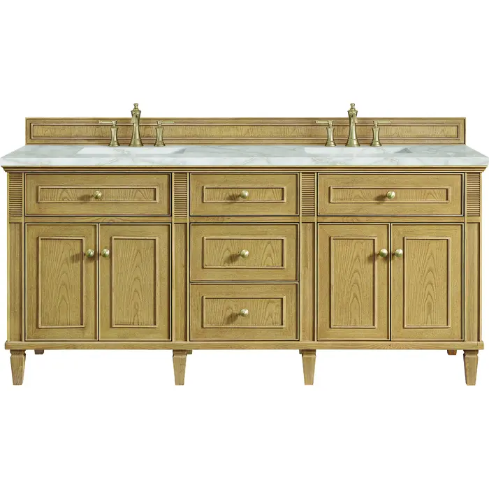 The 72” Lorelai Double Vanity celebrates timeless form and exquisite finish details, combined with practical function. The beauty of the natural grains in the walnut veneer is accented by reeded details, and clean, raised picture frame molding. The decorative, coin-edge knobs in Champagne Brass provide the perfect accent to the Light Natura Oak finish. This four-door cabinet opens to spacious interior with shelves and convenient USB/Electric power outlets. Three traditional drawers and two tip-outs offer additional storage space. The finish is accented by the neutral background of the Victorian Silver Silestone top, boasting champagne metallic accents which seamlessly complete the look.Vanity set includes a 3cm eased edge Victorian Silver Silestone top, two white porcelain rectangular sinks and mounting brackets for easy installation. Top is pre-drilled for two 8" widespread faucets. Faucets not included.Solid Ash wood frame and Ash wood veneers over plywood panels and sealed with our premium moisture and UV resistant coatingsTwo 120-volt UL rated electric outlets with USB ports and bamboo organizer includedTwo tip-out drawers, three drawers, and four doors that open to interior shelvingRound, coin-edge hardware in a Champagne Brass finishDrawer boxes feature English Dovetail joinery, premium undermount soft-close glides, and brushed aluminum laminate drawer liners for easy cleaningDoors feature adjustable soft-close door hingesExquisitely crafted, the Lorelai collection is a testament to timeless, versatile design. With reeded accents and clean, raised picture frame details, each piece in this collection effortlessly adds visual interest to your space. The subtle elegance of coin edge knobs and tapered legs enhances the overall aesthetic, while the choice of five versatile finishes and four sizes ensures an perfect match for any bathroom style.1 year warranty against manufacturer's defects. We will repair or replace any defective product, if the product is defective in material or workmanship at our discretion. No warranty is expressed or implied regarding damages resulting from consumer misuse.