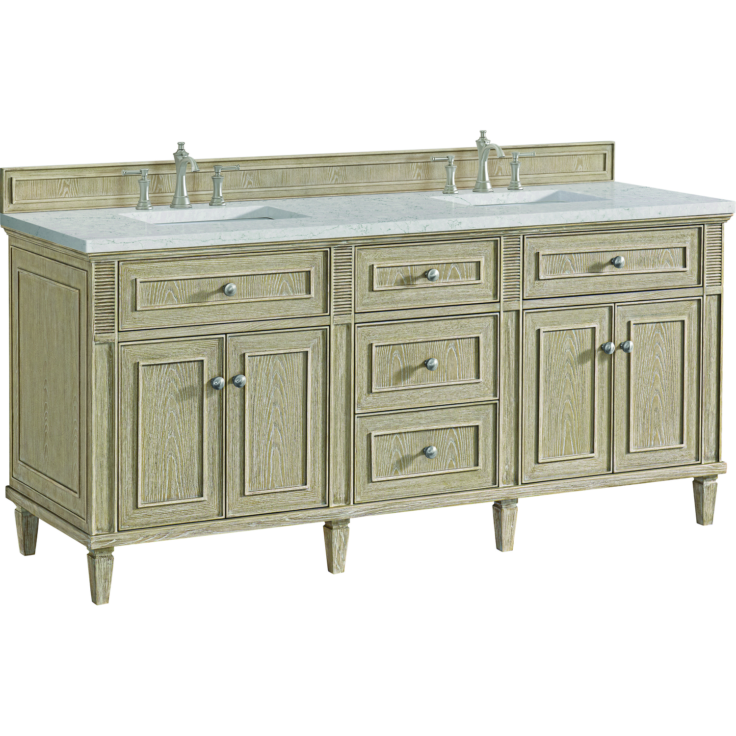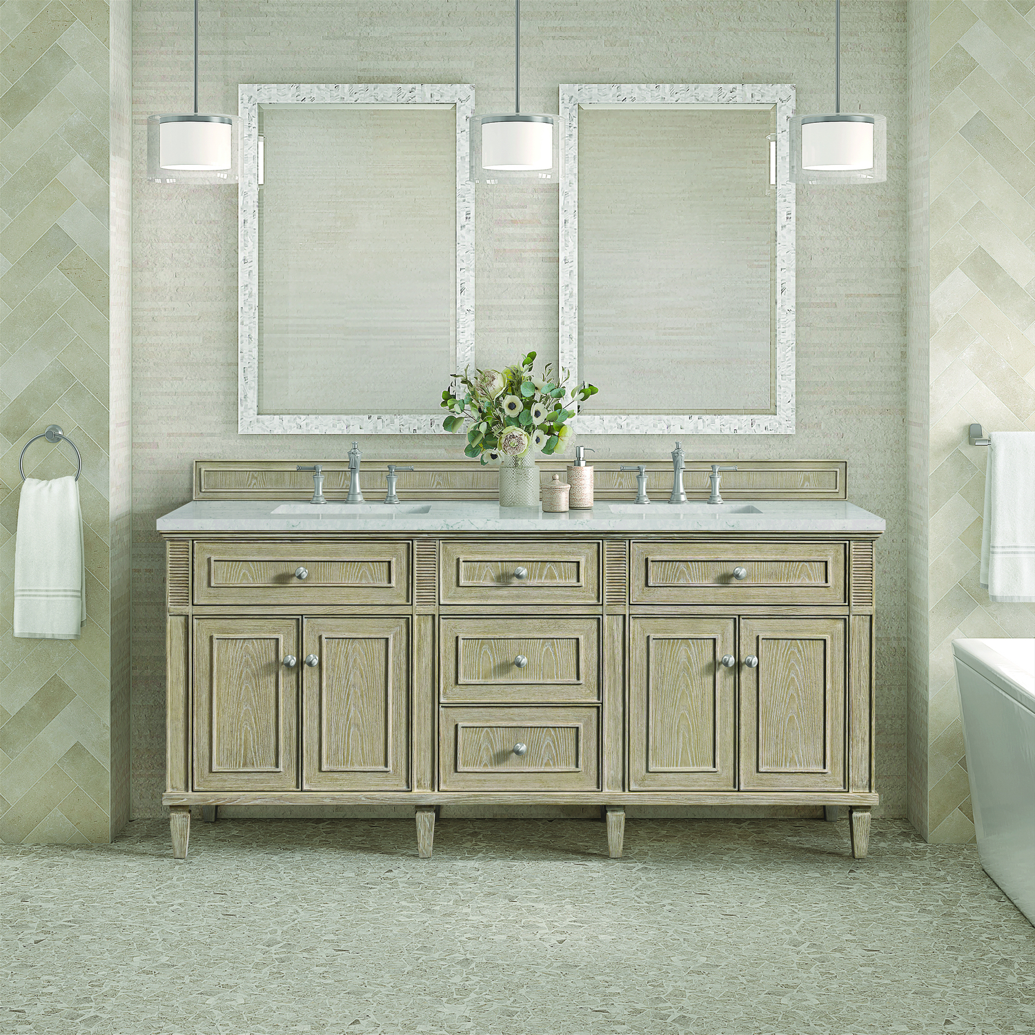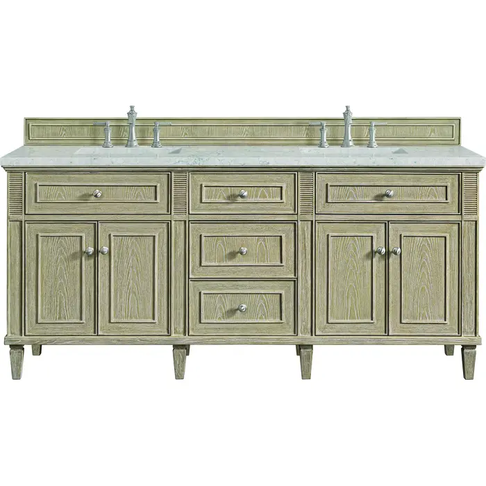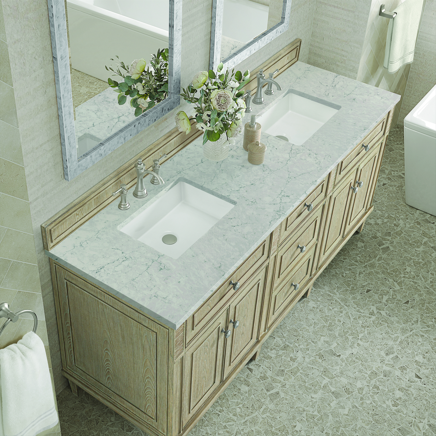 James Martin Lorelai 72 inch Double Vanity, Whitewashed Oak w/ 3 CM Eternal Jasmine Pearl Quartz Top, 840108973239, 424-V72-WWO-3EJP