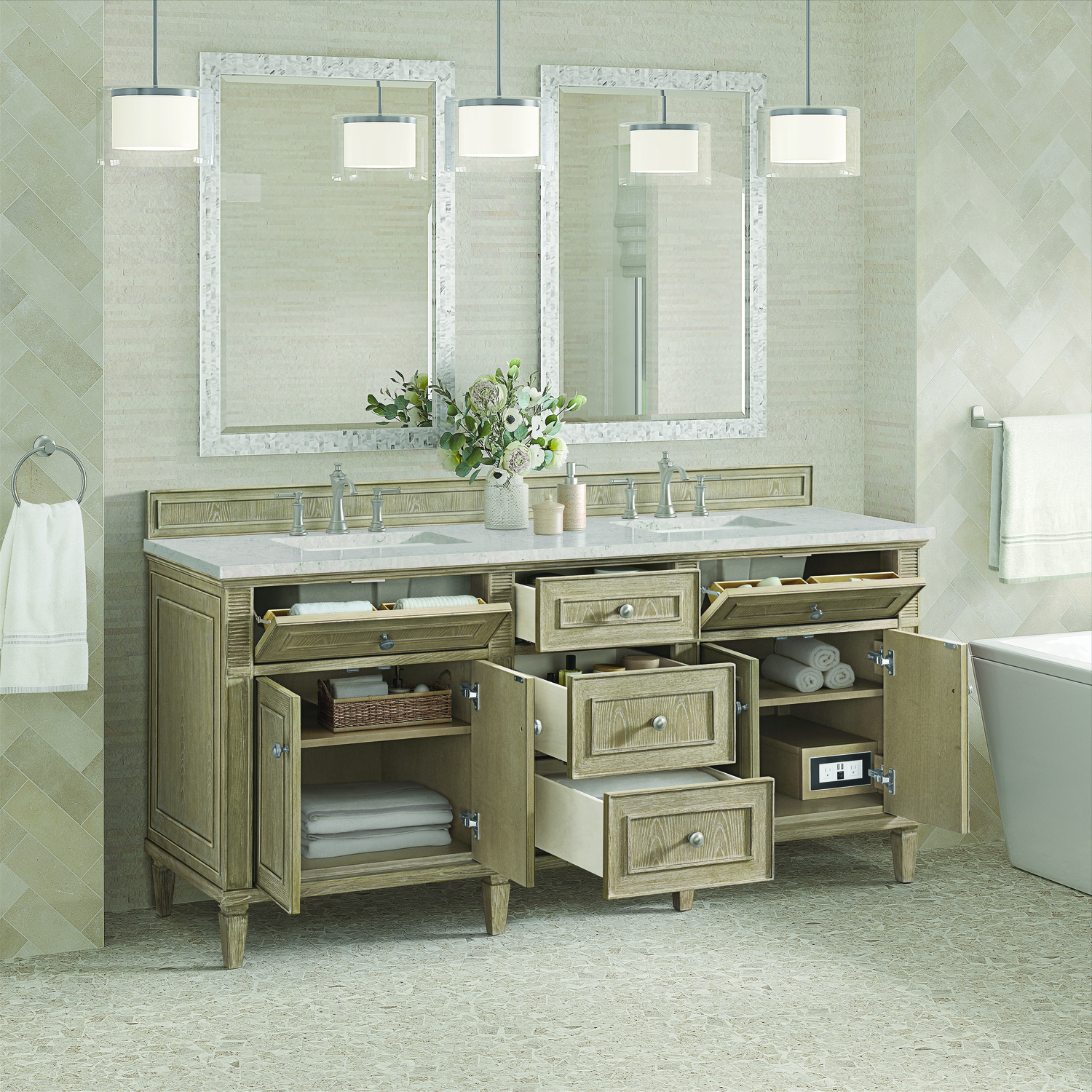 The 72” Lorelai Double Vanity celebrates timeless form and exquisite finish details, combined with practical function. The Whitewashed Oak finish is accented by reeded details, and clean, raised picture frame molding. Coin-edge knobs in Satin Nickel provide the perfect accent. This four-door cabinet opens to spacious interior with shelves and convenient USB/Electric power outlets. Three traditional drawers and two tip-outs offer additional storage space. Completing the look is the Eternal Jasmine Pearl Silestone top by Cosentino, featuring an elegant white background with subtle marbleized swirls and dark Bleu-gray veining patterns.Vanity set includes a 3cm eased edge Eternal Jasmine Pearl Silestone top, two white porcelain rectangular sinks and mounting brackets for easy installation. Top is pre-drilled for two 8" widespread faucets. Faucets not included.Solid Ash wood frame and Ash wood veneers over plywood panels and sealed with our premium moisture and UV resistant coatingsTwo 120-volt UL rated electric outlets with USB ports and bamboo organizer includedTwo tip-out drawers, three drawers, and four doors that open to interior shelvingRound, coin-edge hardware in a Satin Nickel finishDrawer boxes feature English Dovetail joinery, premium undermount soft-close glides, and brushed aluminum laminate drawer liners for easy cleaningDoors feature adjustable soft-close door hingesExquisitely crafted, the Lorelai collection is a testament to timeless, versatile design. With reeded accents and clean, raised picture frame details, each piece in this collection effortlessly adds visual interest to your space. The subtle elegance of coin edge knobs and tapered legs enhances the overall aesthetic, while the choice of five versatile finishes and four sizes ensures an perfect match for any bathroom style.1 year warranty against manufacturer's defects. We will repair or replace any defective product, if the product is defective in material or workmanship at our discretion. No warranty is expressed or implied regarding damages resulting from consumer misuse.