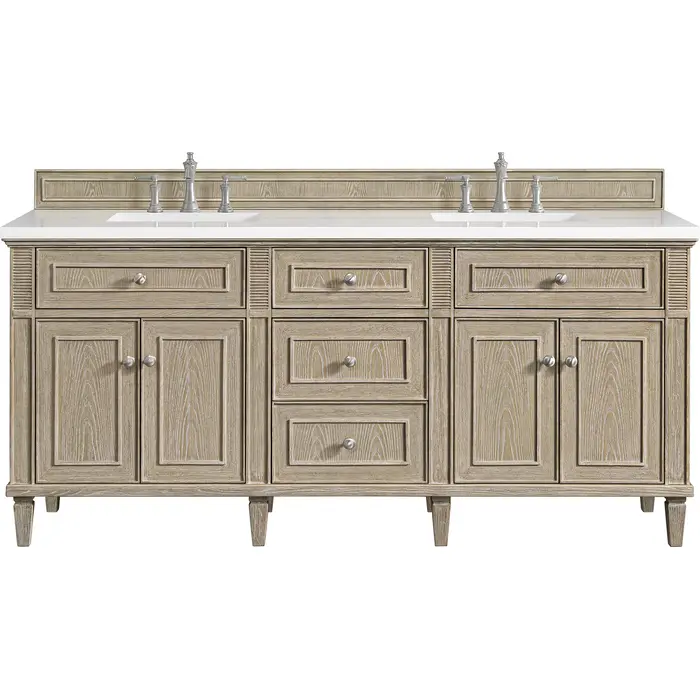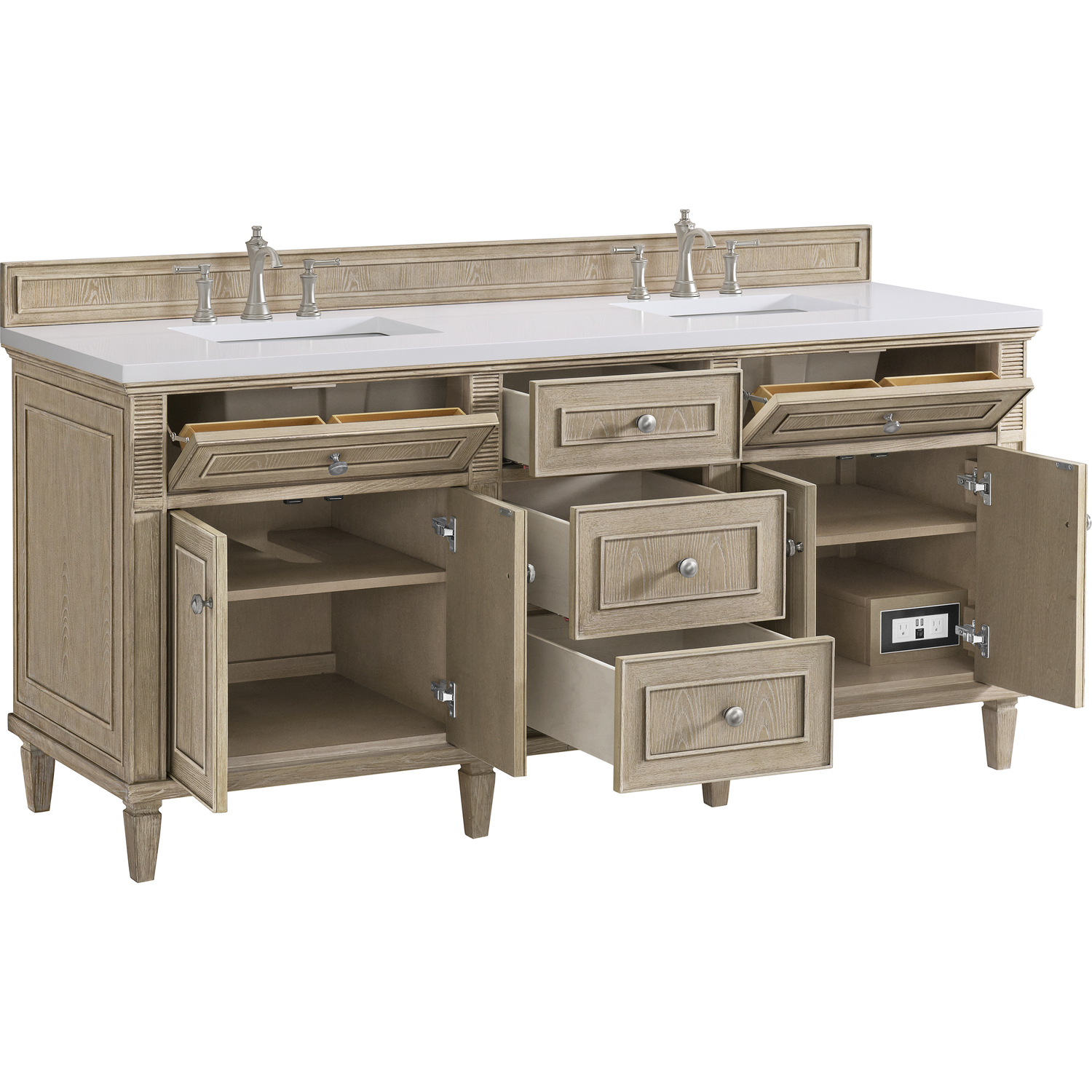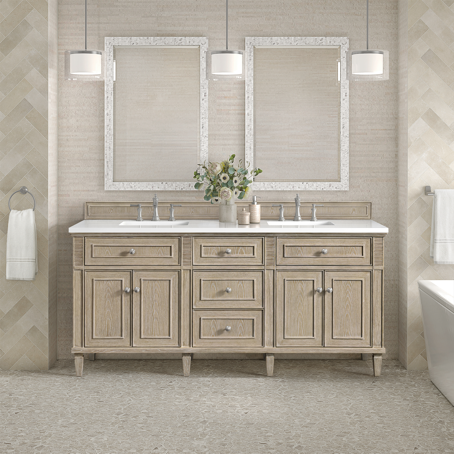 James Martin Lorelai 72 inch Double Vanity, Whitewashed Oak w/ 3 CM White Zeus Quartz Top, 840108973208, 424-V72-WWO-3WZ