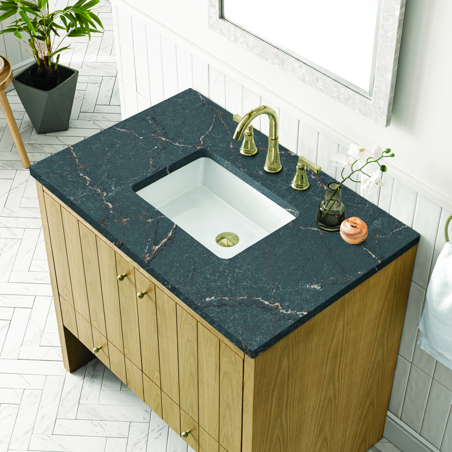 The cathedral grain Flat Cut Ash veneers and modern panel detailing on the doors and return panels give the Hudson collection the look of fine furnishings that is unexpected yet welcome for the bathroom space. The 36" vanity features one set of doors that offers a convenient dual power and USB outlet and ample storage. The lower drawer, with its removable bamboo storage organizer tray, allows for optimum organization. The natural grain of the wood finish is enhanced by the Parisien Bleu Silestone top, offering a deep bluish hue with broad and intricate neutral veins highlighted by fine coppery accents.Vanity set includes a 3cm eased edge Parisien Bleu Silestone top, which includes one white porcelain rectangular undermount sink that ships separately, as well as mounting brackets for easy installation. The top is pre-drilled for an 8" widespread faucet.Two door cabinet with one lower drawer.Constructed with Ash solids and Flat Cut Ash veneers over a plywood core and is sealed inside and outside with our premium moisture and UV resistant coatings.Drawer boxes are constructed using English Dovetail joinery, feature soft-close undermount glides and a Brushed Aluminum laminate drawer bottom.Satin Nickel hardwareIncludes one removable Bamboo drawer organizer trayFaucet sold separatelyCountertop is pre-drilled for one 3-hole 8" spreadA sophisticated pairing of Mid-Century modern and Farmhouse styles, the Hudson collection stands out with a sleek paneled design. The cathedral woodgrain is accented with Champagne Brass knobs. Housing ample storage, this collection perfectly balances practicality and chic detailing.1 year warranty against manufacturer's defects. We will repair or replace any defective product, if the product is defective in material or workmanship at our discretion. No warranty is expressed or implied regarding damages resulting from consumer misuse.