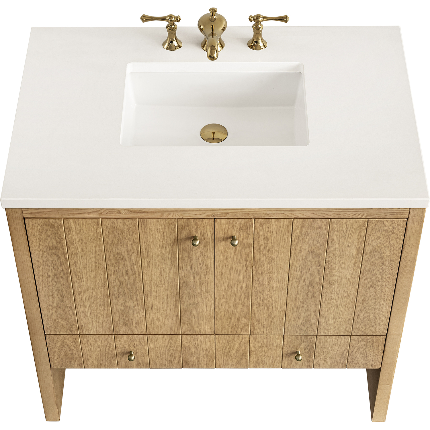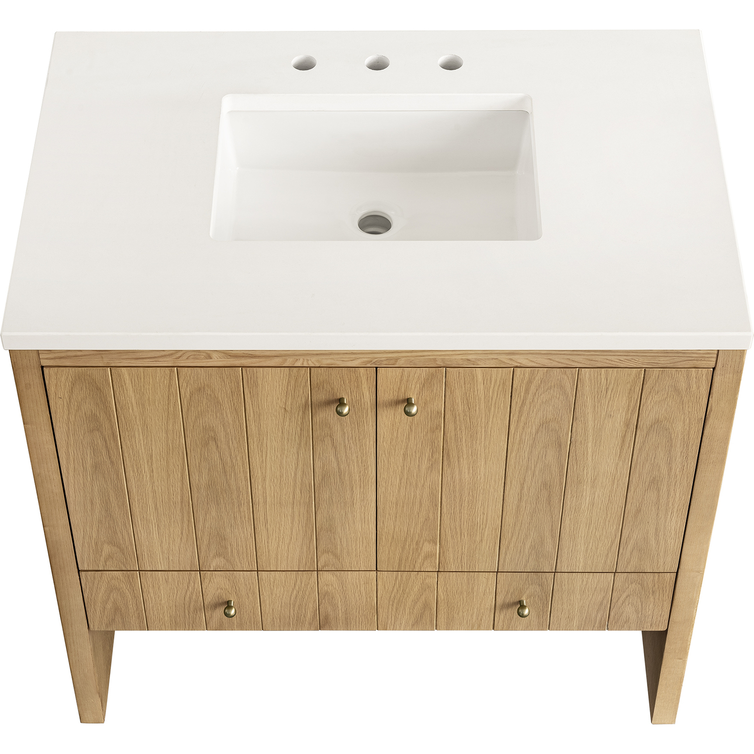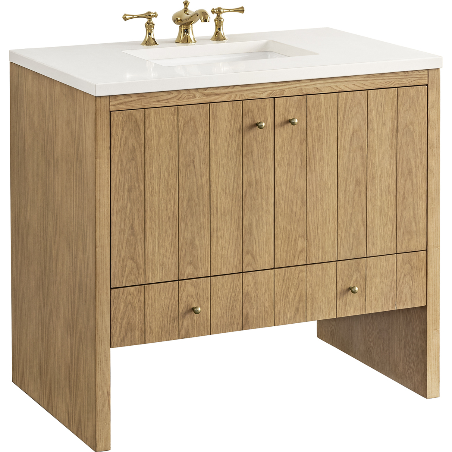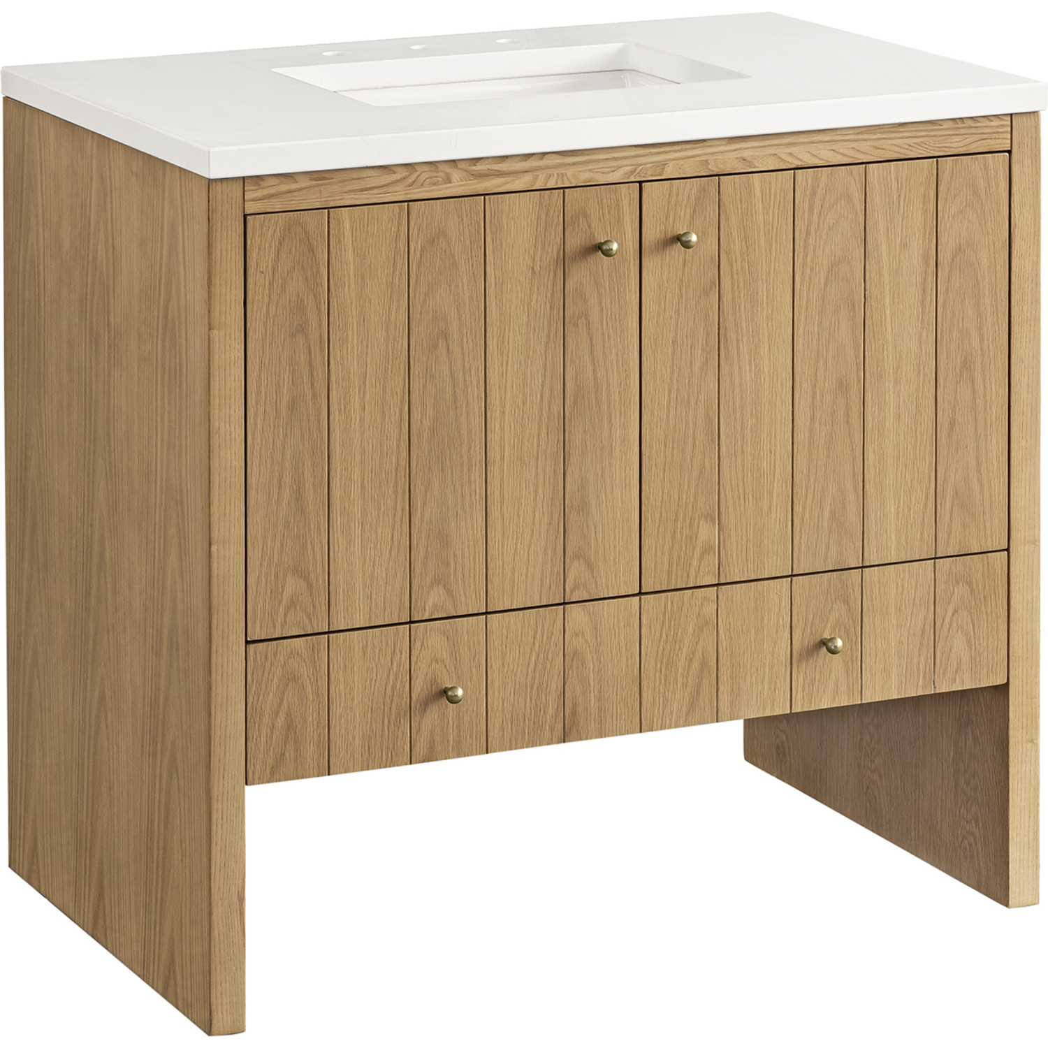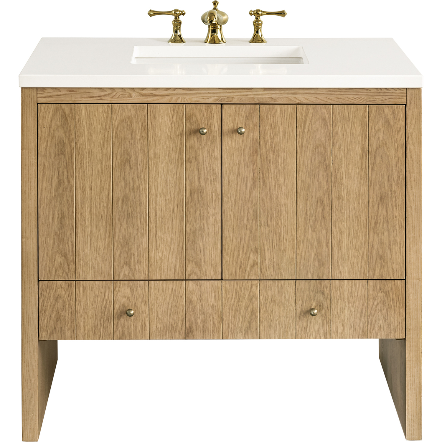 The cathedral grain Flat Cut Ash veneers and modern panel detailing on the doors and return panels give the Hudson collection the look of fine furnishings that is unexpected yet welcome for the bathroom space. The 36" vanity features one set of doors that offers a convenient dual power and USB outlet and ample storage. The lower drawer, with its removable bamboo storage organizer tray, allows for optimum organization. The 3 CM White Zeus top provides the perfect final touch.This cabinet is constructed with ash solids and Flat Cut Ash veneers over a plywood core and is sealed inside and outside with our premium moisture and UV resistant coatings.Two door cabinet with one lower drawer.Includes one removable Bamboo drawer organizer tray,3 CM eased edge White Zeus Silestone top includes a white porcelain rectangular sink that ships separately and includes mounting brackets for easy installation. Faucet not included.Plywood drawer boxes feature English Dovetail joinery and our signature brushed aluminum laminate drawer liners for easy cleaningDual Power and USB portsDecorative knobs in Champagne BrassSoft-close, undermount drawer glides and soft-close door hingesA sophisticated pairing of Mid-Century modern and Farmhouse styles, the Hudson collection stands out with a sleek paneled design. The cathedral woodgrain is accented with Champagne Brass knobs. Housing ample storage, this collection perfectly balances practicality and chic detailing.1 year warranty against manufacturer's defects. We will repair or replace any defective product, if the product is defective in material or workmanship at our discretion. No warranty is expressed or implied regarding damages resulting from consumer misuse.