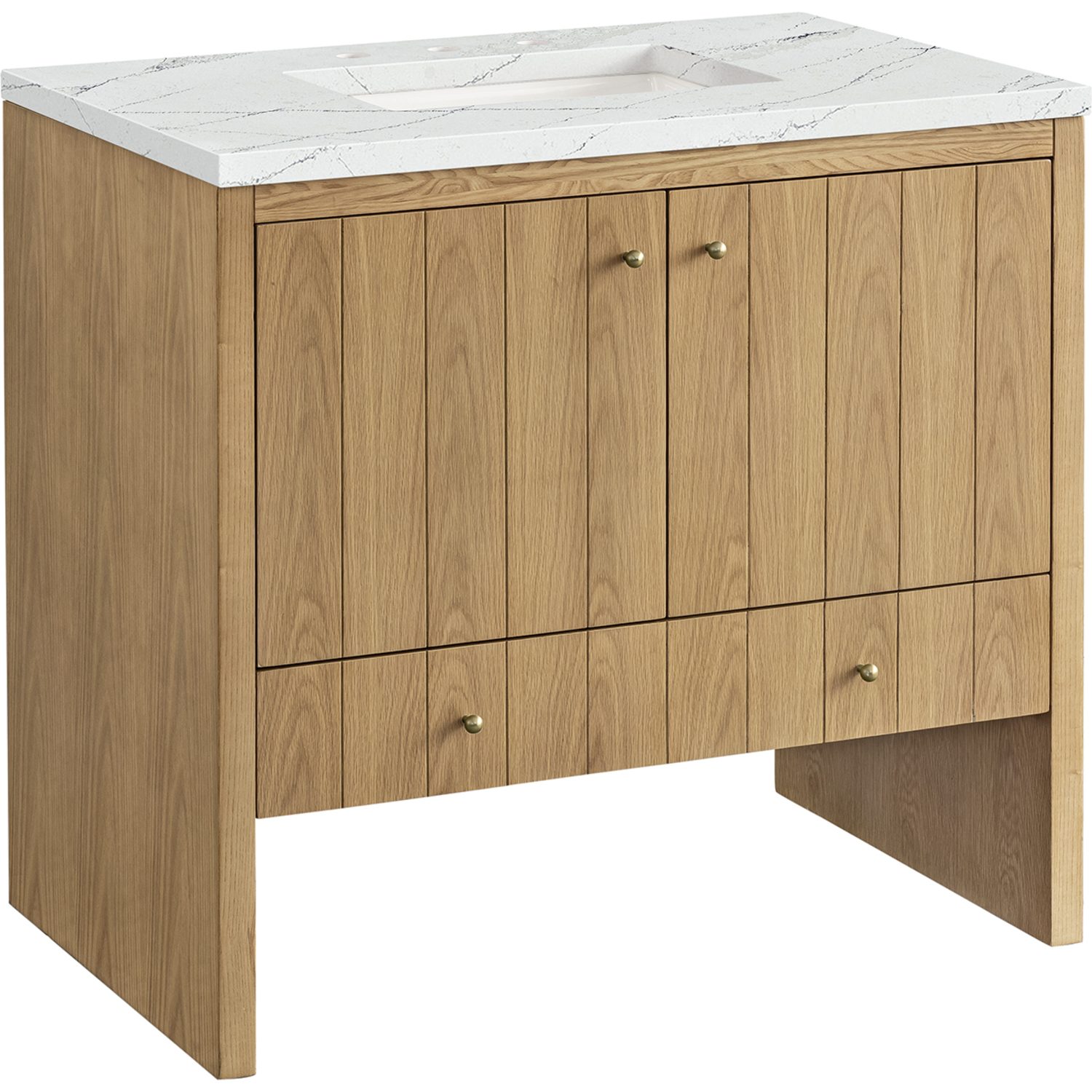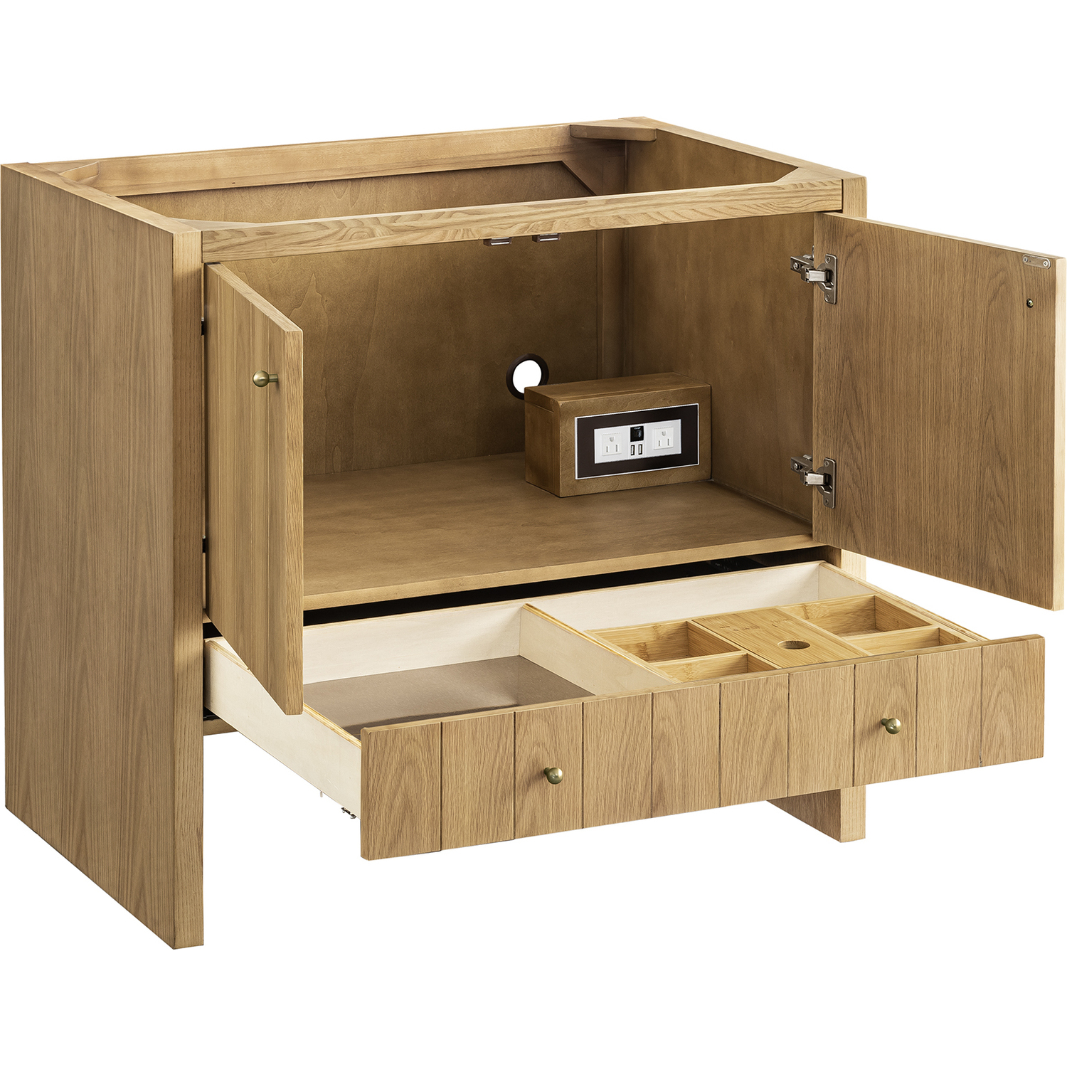 The cathedral grain Flat Cut Ash veneers and modern panel detailing on the doors and return panels give the Hudson collection the look of fine furnishings that is unexpected yet welcome for the bathroom space. The 36" vanity features one set of doors that offers a convenient dual power and USB outlet and ample storage. The lower drawer, with its removable bamboo storage organizer tray, allows for optimum organization.This cabinet is constructed with ash solids and Flat Cut Ash veneers over a plywood core and is sealed inside and outside with our premium moisture and UV resistant coatings.Two door cabinet with one lower drawer.Includes one removable Bamboo drawer organizer tray,Includes cabinet only. Choose from any of our 3 CM top options (sold separately)Plywood drawer boxes feature English Dovetail joinery and our signature brushed aluminum laminate drawer liners for easy cleaningDual Power and USB portsDecorative knobs in Champagne BrassSoft-close, undermount drawer glides and soft-close door hingesA sophisticated pairing of Mid-Century modern and Farmhouse styles, the Hudson collection stands out with a sleek paneled design. The cathedral woodgrain is accented with Champagne Brass knobs. Housing ample storage, this collection perfectly balances practicality and chic detailing.1 year warranty against manufacturer's defects. We will repair or replace any defective product, if the product is defective in material or workmanship at our discretion. No warranty is expressed or implied regarding damages resulting from consumer misuse.