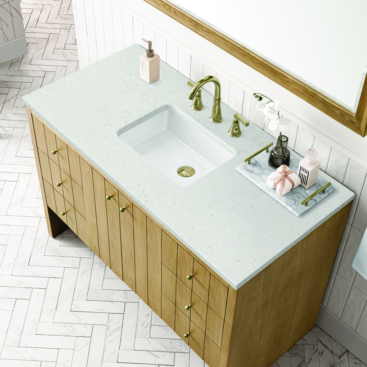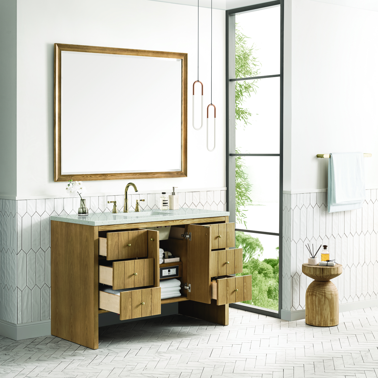 The cathedral grain Flat Cut Ash veneers and modern panel detailing on the doors and return panels give the Hudson collection the look of fine furnishings that is unexpected yet welcome for the bathroom space. The 48" vanity features one set of doors that opens up to a convenient dual power and USB outlet and ample storage. Six drawers and one removable bamboo storage organizer tray allow for optimum organization. The Lime Delight Silestone top lends warm, textured beige tones to perfectly complement the Light Natural Oak finish on the vanity.Vanity set includes a 3cm eased edge Limestone Delight Silestone top. Includes a white porcelain rectangular undermount sink that ships separately and mounting brackets for easy installation. Top is pre-drilled for 8" widespread faucet. Faucet not includeTwo door cabinet with one interior, adjustable height shelf and six drawers.Constructed with Ash solids and Flat Cut Ash veneers over a plywood core and is sealed inside and outside with our premium moisture and UV resistant coatings.Drawer boxes are constructed using English Dovetail joinery, feature soft-close undermount glides and a Brushed Aluminum laminate drawer bottom.Satin Nickel hardwareIncludes one removable Bamboo drawer organizer trayFaucet sold separatelyCountertop is pre-drilled for one 3-hole 8" spreadA sophisticated pairing of Mid-Century modern and Farmhouse styles, the Hudson collection stands out with a sleek paneled design. The cathedral woodgrain is accented with Champagne Brass knobs. Housing ample storage, this collection perfectly balances practicality and chic detailing.1 year warranty against manufacturer's defects. We will repair or replace any defective product, if the product is defective in material or workmanship at our discretion. No warranty is expressed or implied regarding damages resulting from consumer misuse.