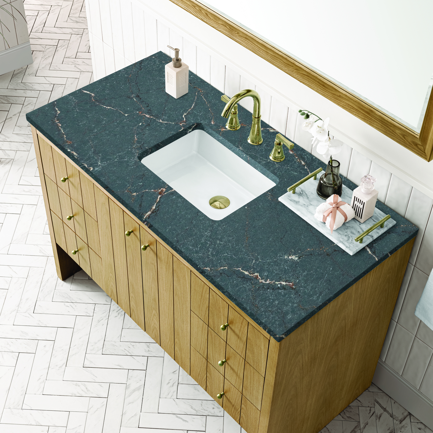 The cathedral grain Flat Cut Ash veneers and modern panel detailing on the doors and return panels give the Hudson collection the look of fine furnishings that is unexpected yet welcome for the bathroom space. The 48" vanity features one set of doors that opens up to a convenient dual power and USB outlet and ample storage. Six drawers and one removable bamboo storage organizer tray allow for optimum organization. The natural grain of the wood finish is enhanced by the Parisien Bleu Silestone top, offering a deep bluish hue with broad and intricate neutral veins highlighted by fine coppery accents.Vanity set includes a 3cm eased edge Parisien Bleu Silestone top, which includes one white porcelain rectangular undermount sink that ships separately, as well as mounting brackets for easy installation. The top is pre-drilled for an 8" widespread faucet.Two door cabinet with one interior, adjustable height shelf and six drawers.Constructed with Ash solids and Flat Cut Ash veneers over a plywood core and is sealed inside and outside with our premium moisture and UV resistant coatings.Drawer boxes are constructed using English Dovetail joinery, feature soft-close undermount glides and a Brushed Aluminum laminate drawer bottom.Satin Nickel hardwareIncludes one removable Bamboo drawer organizer trayFaucet sold separatelyCountertop is pre-drilled for one 3-hole 8" spreadA sophisticated pairing of Mid-Century modern and Farmhouse styles, the Hudson collection stands out with a sleek paneled design. The cathedral woodgrain is accented with Champagne Brass knobs. Housing ample storage, this collection perfectly balances practicality and chic detailing.1 year warranty against manufacturer's defects. We will repair or replace any defective product, if the product is defective in material or workmanship at our discretion. No warranty is expressed or implied regarding damages resulting from consumer misuse.
