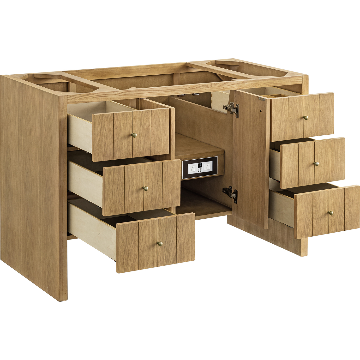 The cathedral grain Flat Cut Ash veneers and modern panel detailing on the doors and return panels give the Hudson collection the look of fine furnishings that is unexpected yet welcome for the bathroom space. The 48" vanity features one set of doors that opens up to a convenient dual power and USB outlet and ample storage. Six drawers and one removable bamboo storage organizer tray allow for optimum organization.This cabinet is constructed with ash solids and Flat Cut Ash veneers over a plywood core and is sealed inside and outside with our premium moisture and UV resistant coatings.Two door cabinet with one interior, adjustable height shelf and six drawers.Includes one removable Bamboo drawer organizer tray,Includes cabinet only. Choose from any of our 3 CM top options (sold separately)Plywood drawer boxes feature English Dovetail joinery and our signature brushed aluminum laminate drawer liners for easy cleaningDual Power and USB portsDecorative knobs in Champagne BrassSoft-close, undermount drawer glides and soft-close door hingesA sophisticated pairing of Mid-Century modern and Farmhouse styles, the Hudson collection stands out with a sleek paneled design. The cathedral woodgrain is accented with Champagne Brass knobs. Housing ample storage, this collection perfectly balances practicality and chic detailing.1 year warranty against manufacturer's defects. We will repair or replace any defective product, if the product is defective in material or workmanship at our discretion. No warranty is expressed or implied regarding damages resulting from consumer misuse.