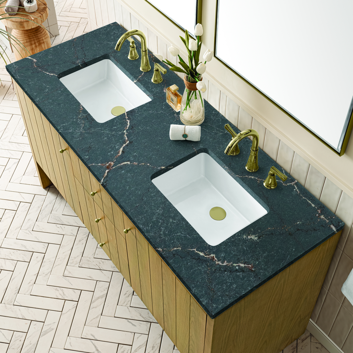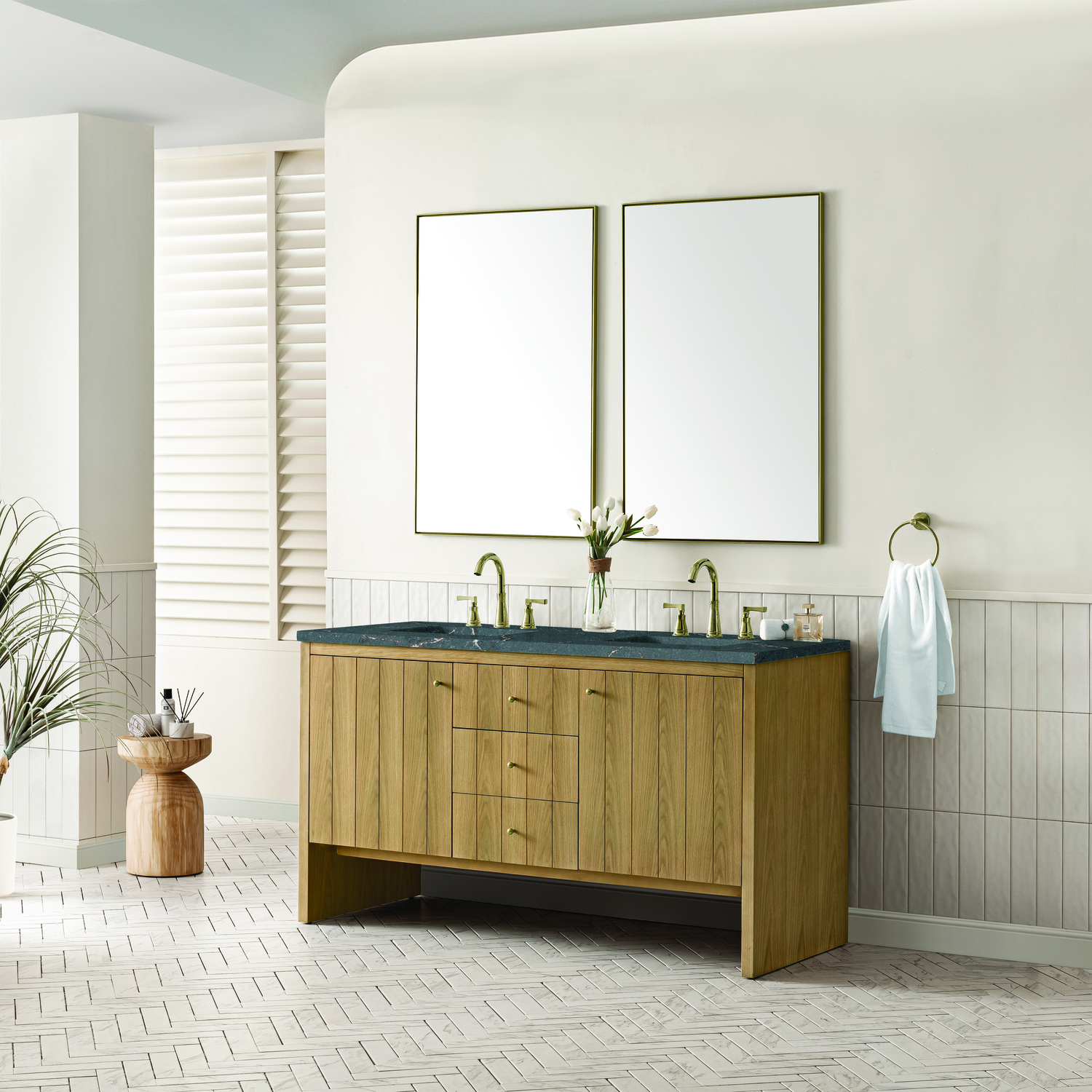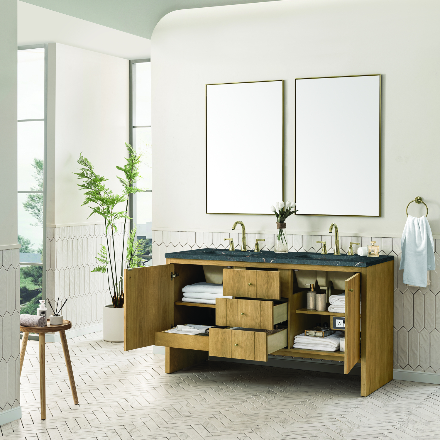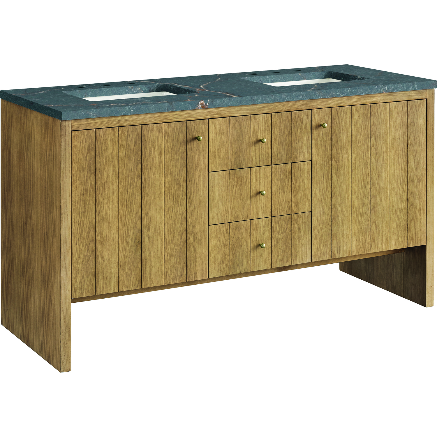 James Martin Hudson 60 inch Double Vanity, Light Natural Oak w/ 3 CM Parisien Bleu Top, 840108967870, 435-V60D-LNO-3PBL